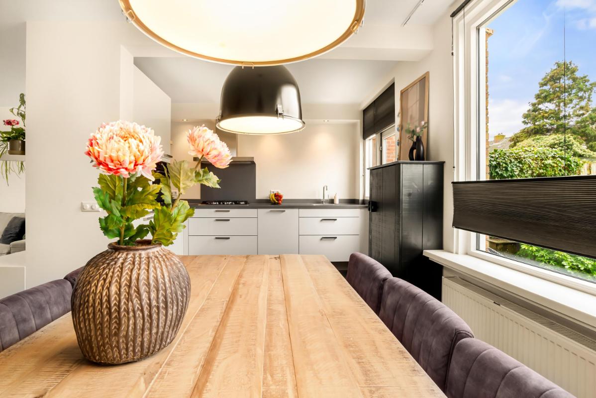 De woonkamer is slim ingedeeld met het zitgedeelte aan de voorzijde, zodat u dagelijks kunt genieten van het vrije uitzicht. In de wintermaanden zorgt de open haard voor extra warmte en gezelligheid. Aan de achterzijde bevindt zich het eetgedeelte, dat naadloos overloopt in de open keuken. De keuken is opgesteld in een praktische hoekopstelling en uitgerust met alle gewenste inbouwapparatuur, waaronder een koel-vriescombinatie, vaatwasser, 5-pits gaskookplaat, combi-oven, afzuigkap, close-in boiler en een stijlvol composiet werkblad.