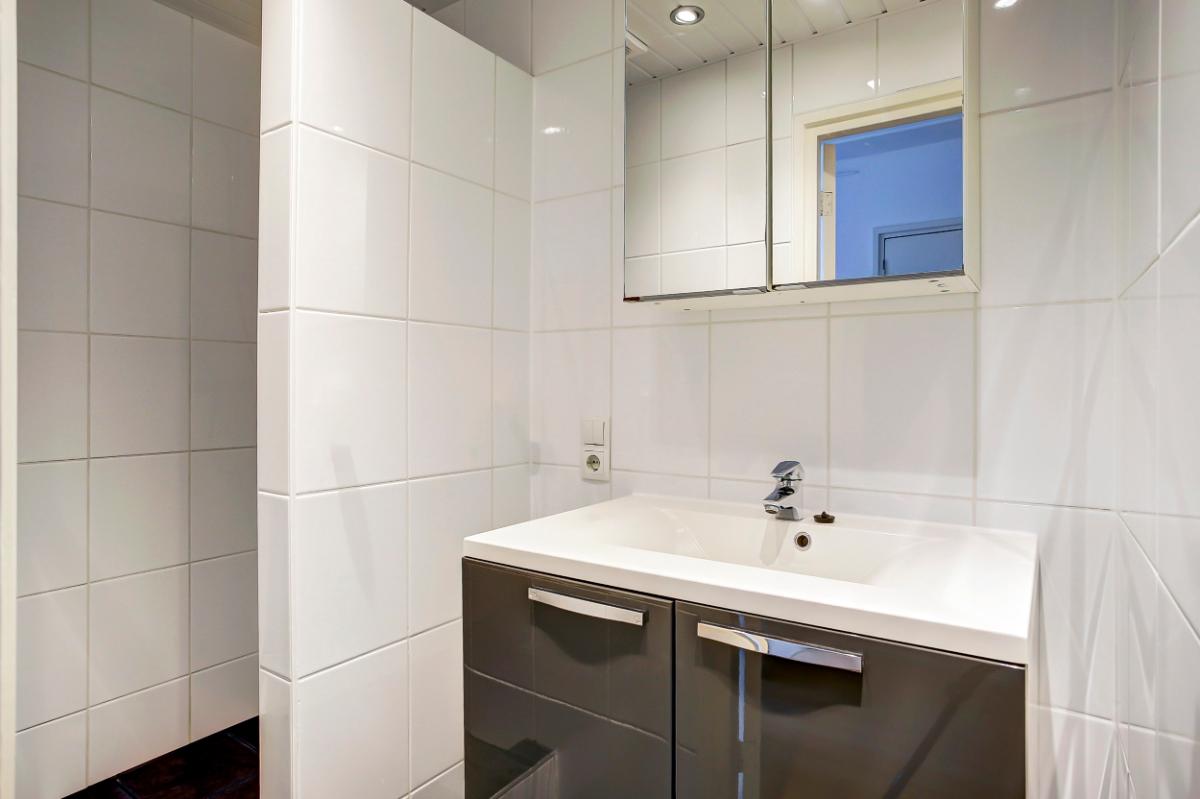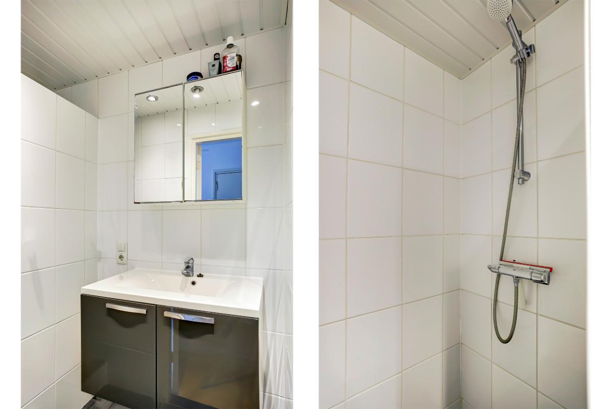 De badkamer is modern en netjes afgewerkt en beschikt over een stijlvol wasmeubel, een ruime inloopdouche en een handdoekradiator.