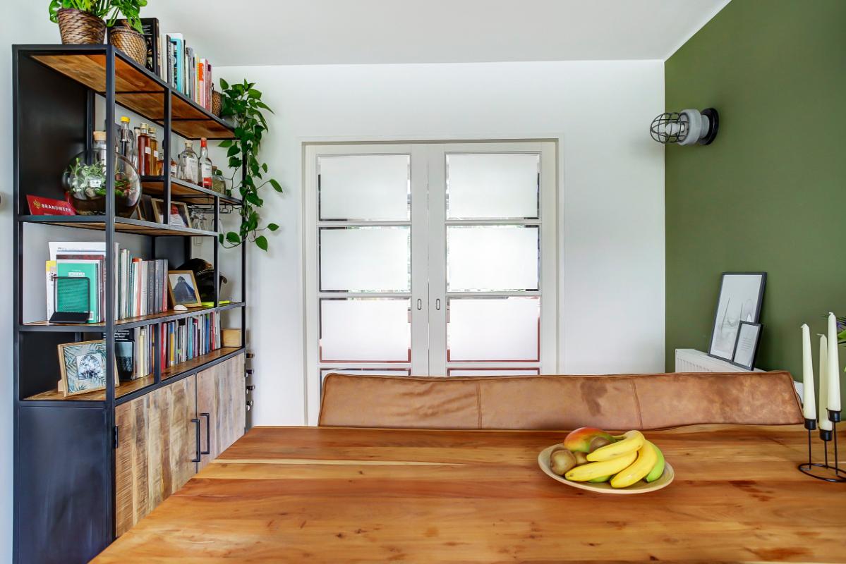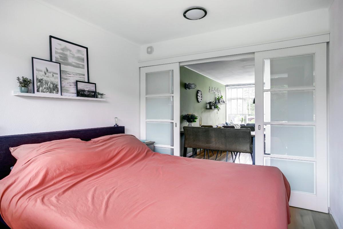 De woonkamer is ruim en licht, met strakke wanden, een mooie laminaatvloer en voldoende ruimte voor zowel een comfortabele zithoek als een gezellige eethoek. Via handige schuifdeuren bereikt u de royale ouderslaapkamer aan de achterzijde, die eveneens een prettige lichtinval heeft.