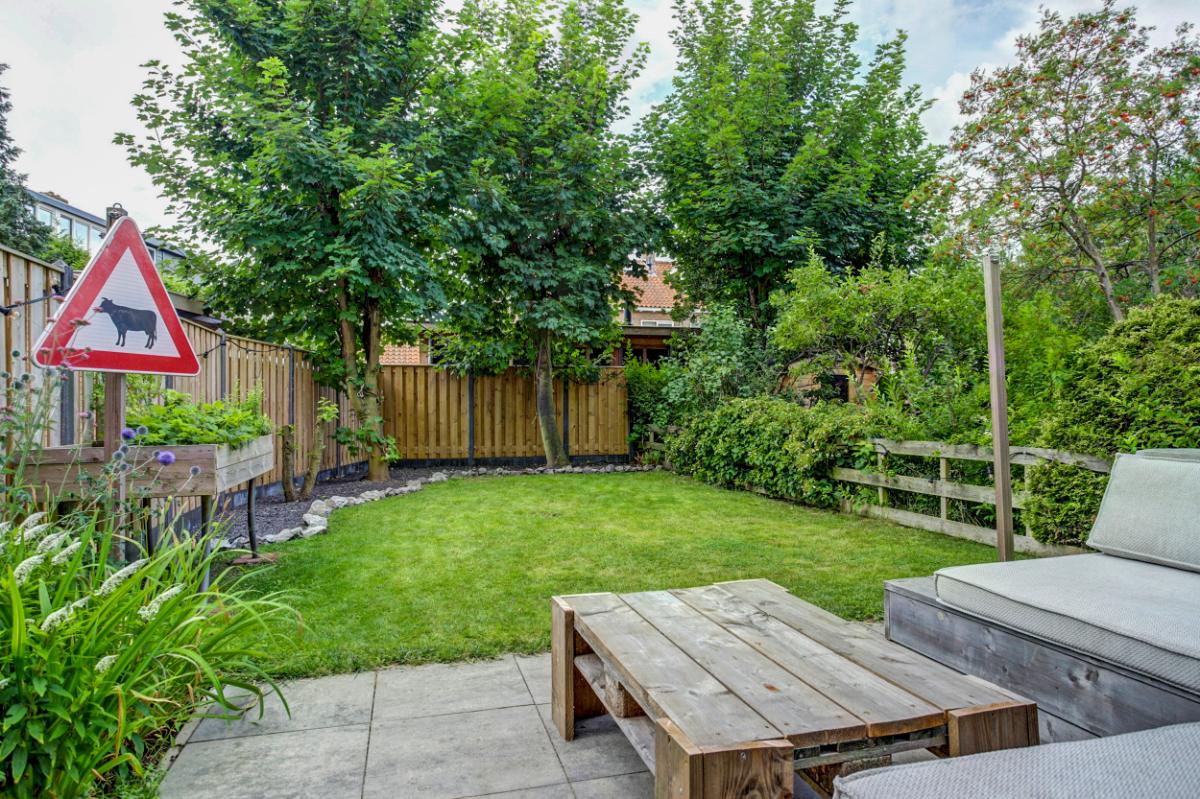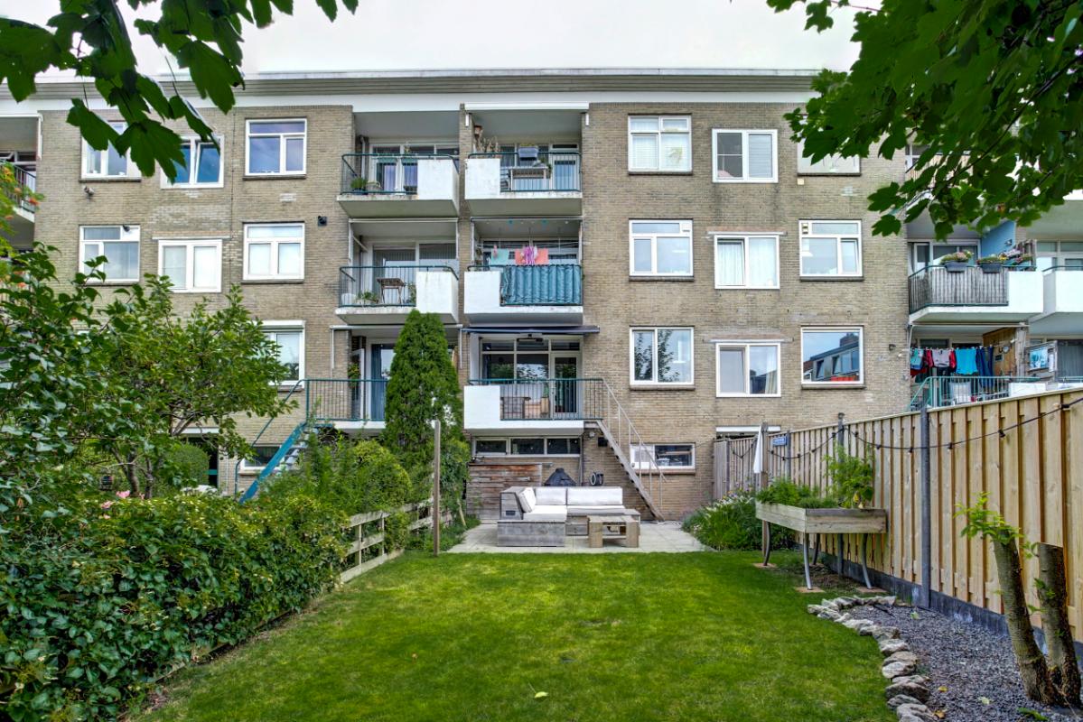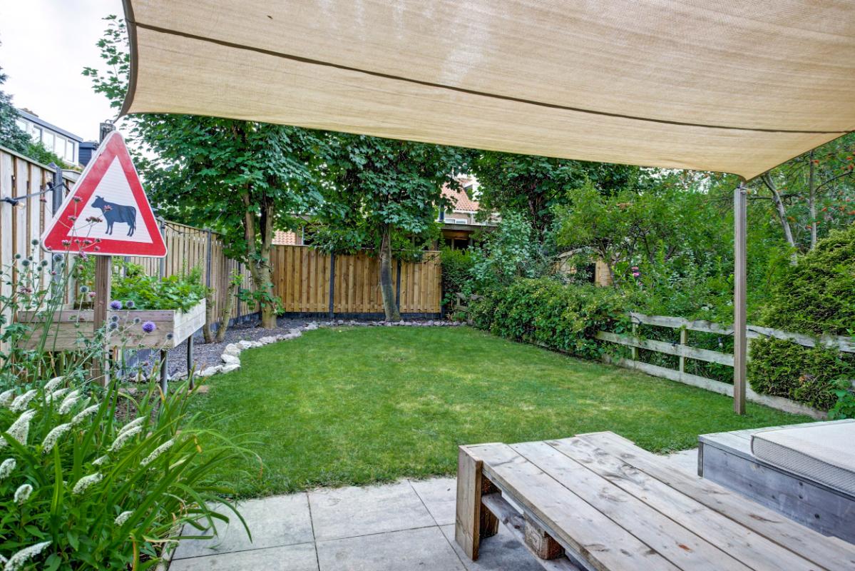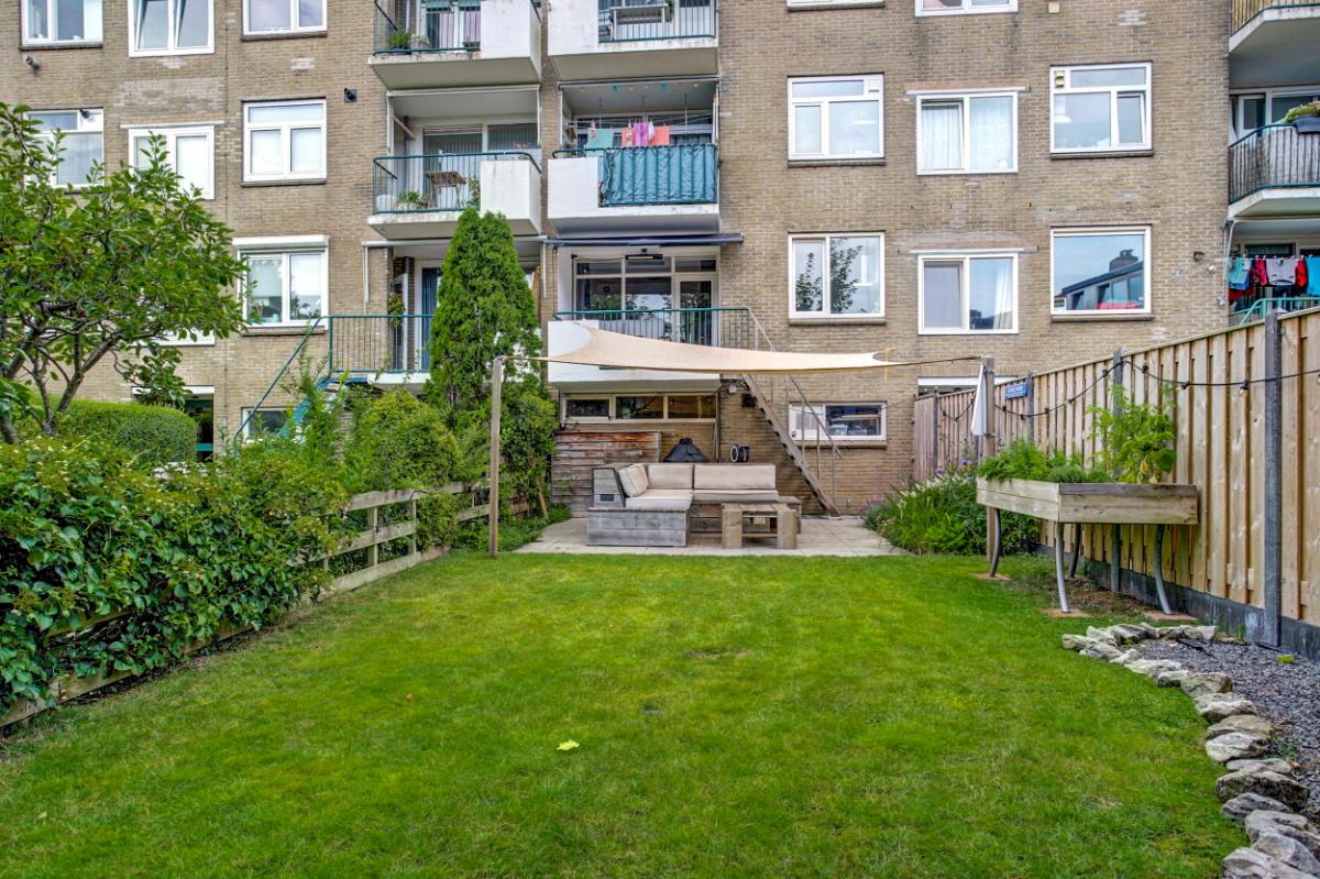 Buitenruimte Vanuit de keuken en het balkon kijkt u uit over de lager gelegen riante achtertuin. Via een trap loopt u zo de tuin in. Deze is verrassend diep, groen en zonnig en voorzien van vaste beplanting en een fijne grasmat. Ideaal voor fietsen, opslag of het creëren van een extra zitplek. Dankzij de achterom via de poort is de tuin ook praktisch bereikbaar.
