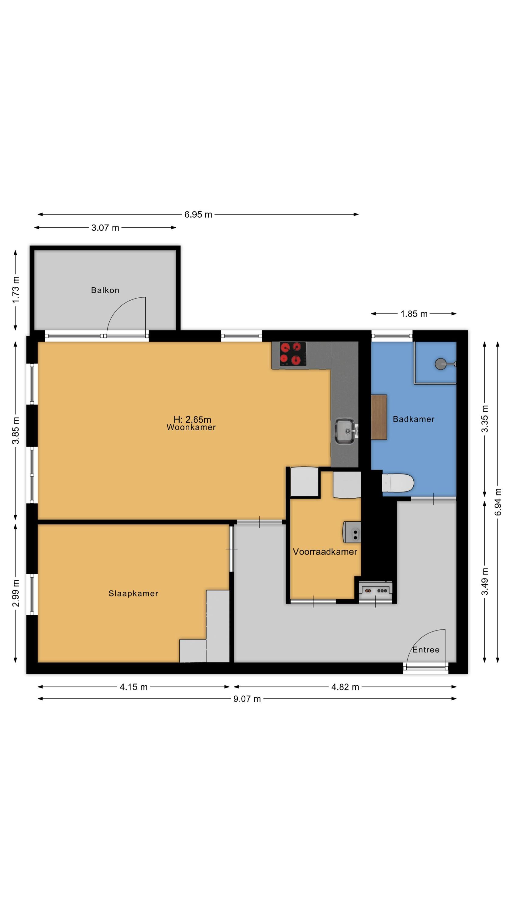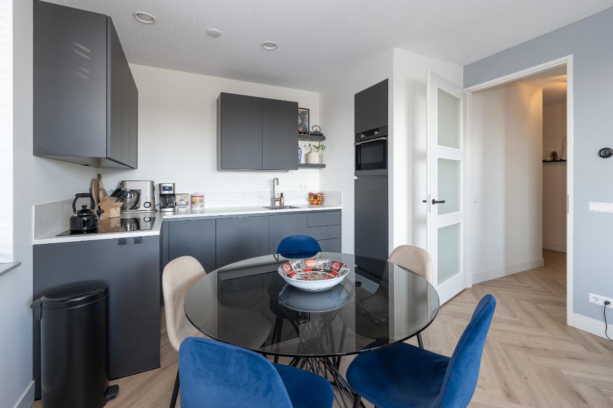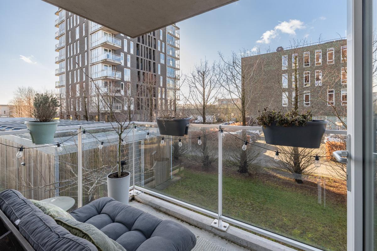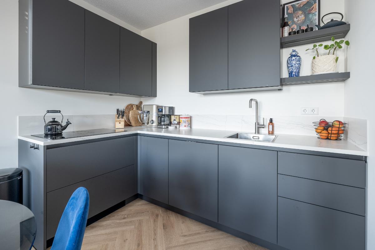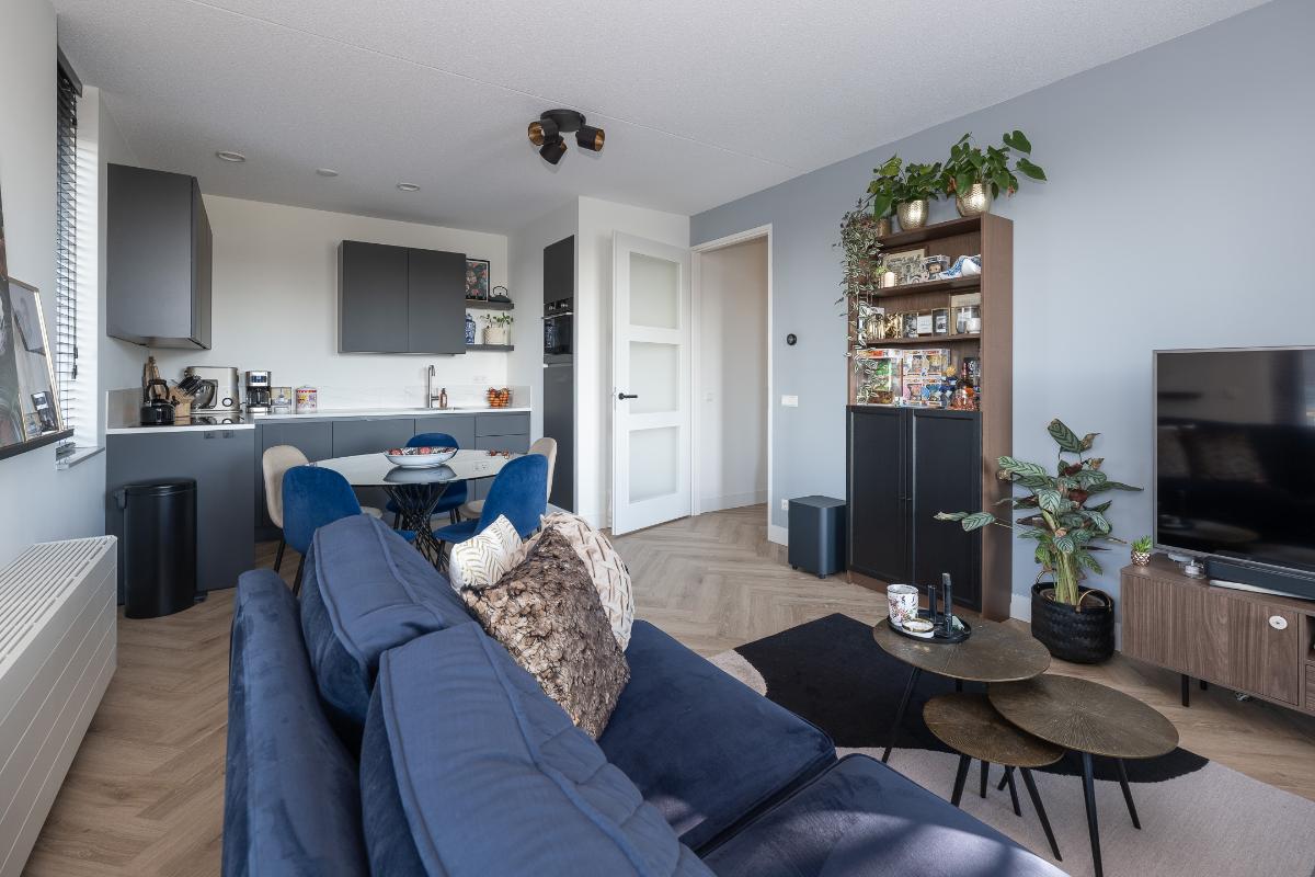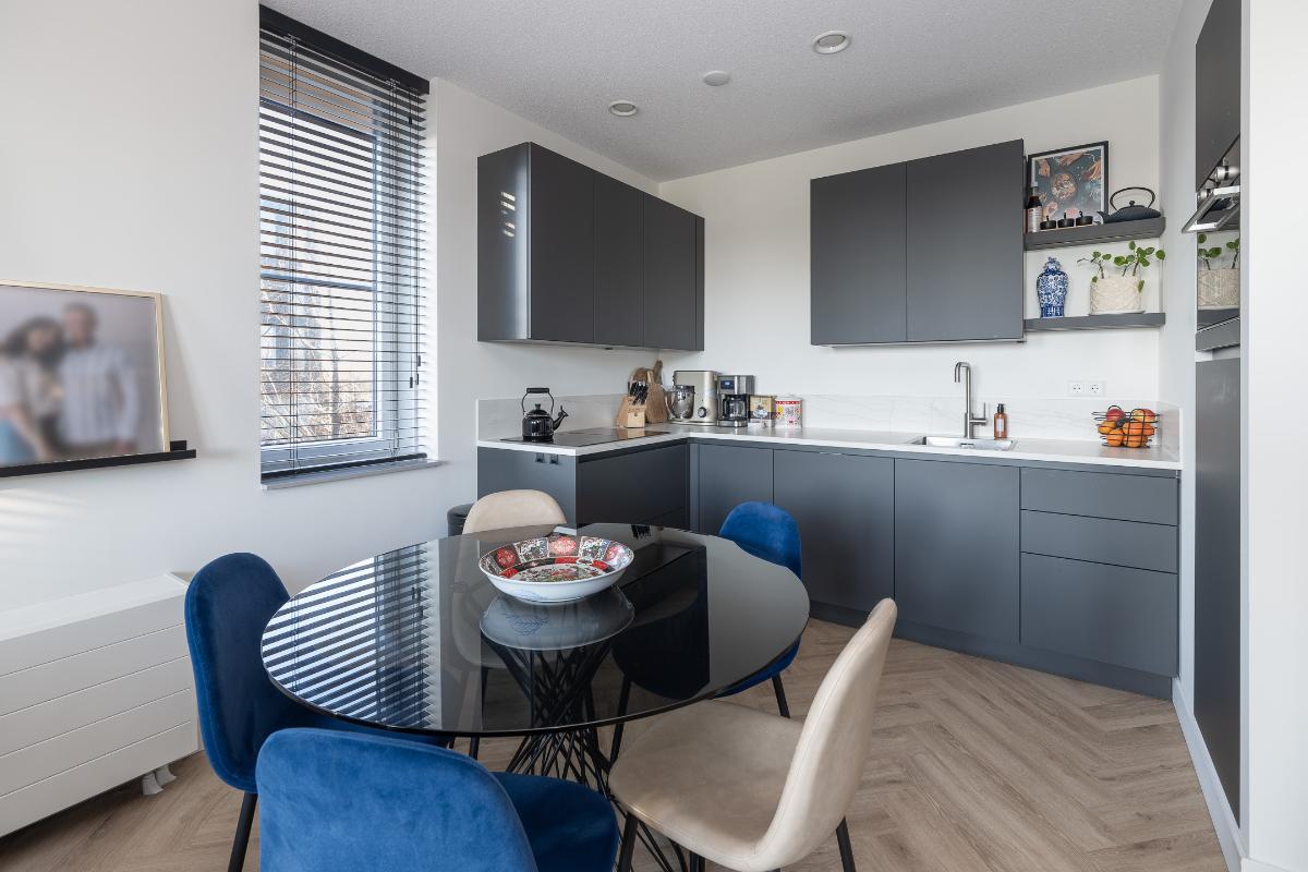 De woonkamer is heerlijk licht dankzij de royale raampartijen en biedt direct toegang tot het zonnige balkon, een fijne plek om te ontspannen. De open keuken sluit naadloos aan op de leefruimte en is compleet uitgevoerd met moderne inbouwapparatuur, waaronder een inductiekookplaat met vier kookzones, afzuigkap, combi-oven, vaatwasser en koelkast.