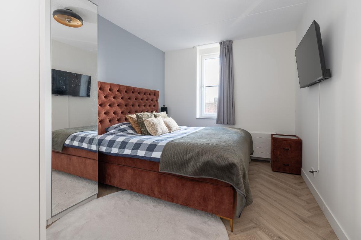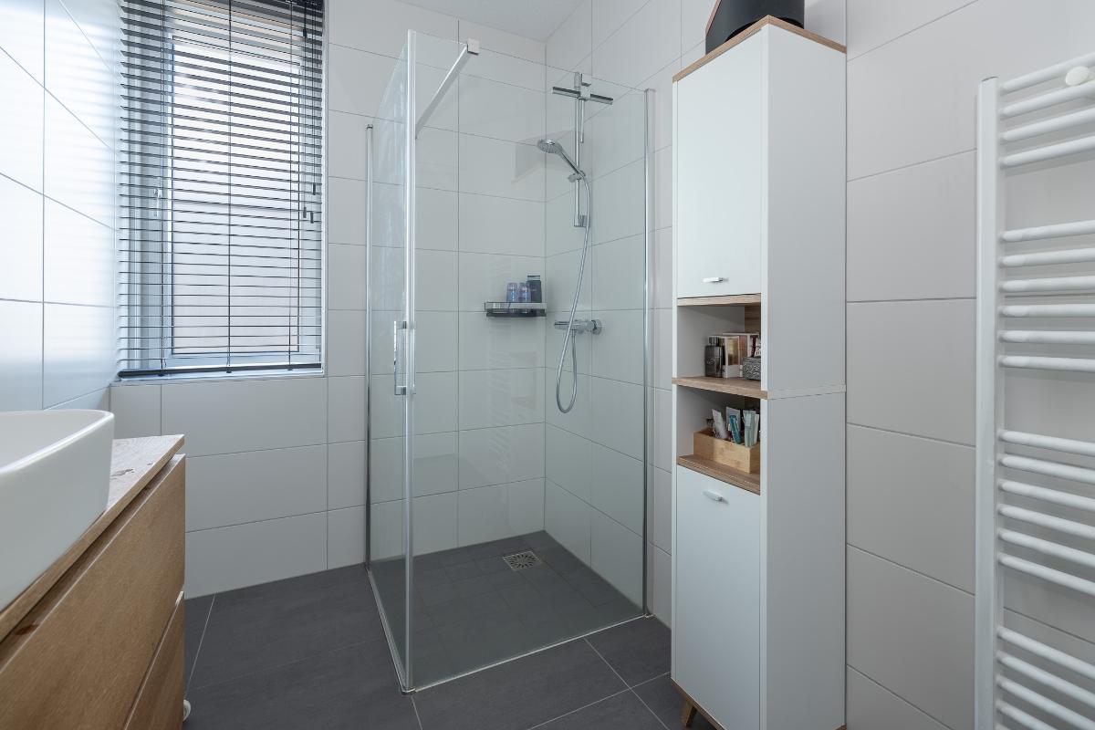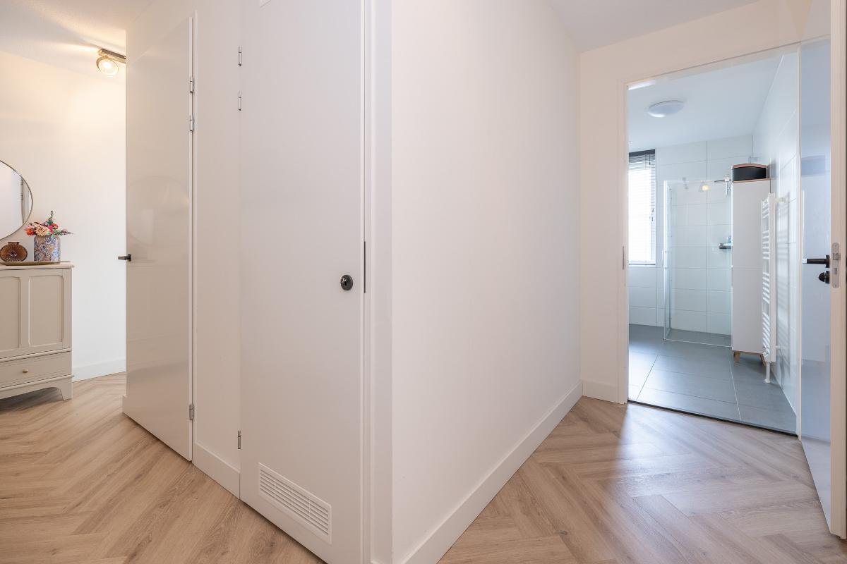 De slaapkamer is ruim opgezet en biedt voldoende comfort. De strak afgewerkte badkamer beschikt over een inloopdouche, een wastafel met meubel, toilet, handdoekradiator en een raam voor natuurlijke ventilatie. Daarnaast is er een separate wasruimte met aansluitingen voor zowel wasmachine als droger, evenals de opstelling van de cv-installatie en mechanische ventilatie.
