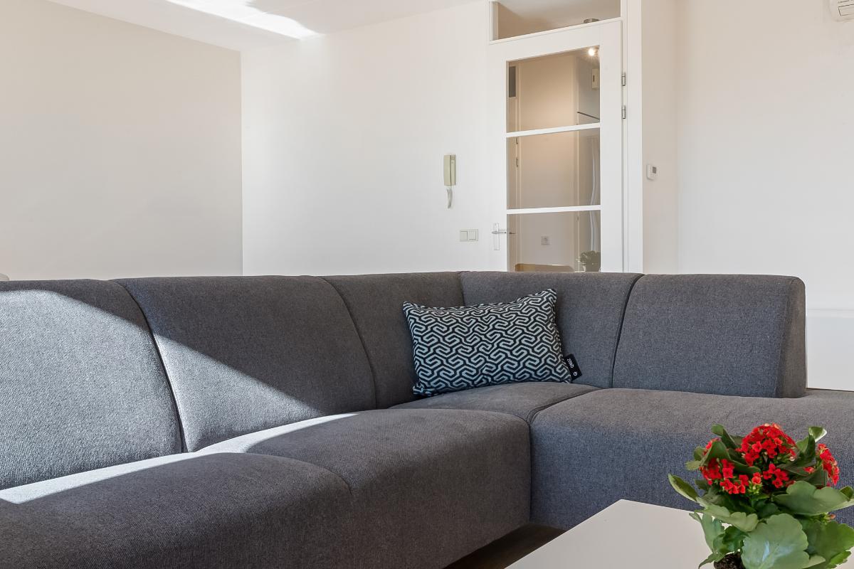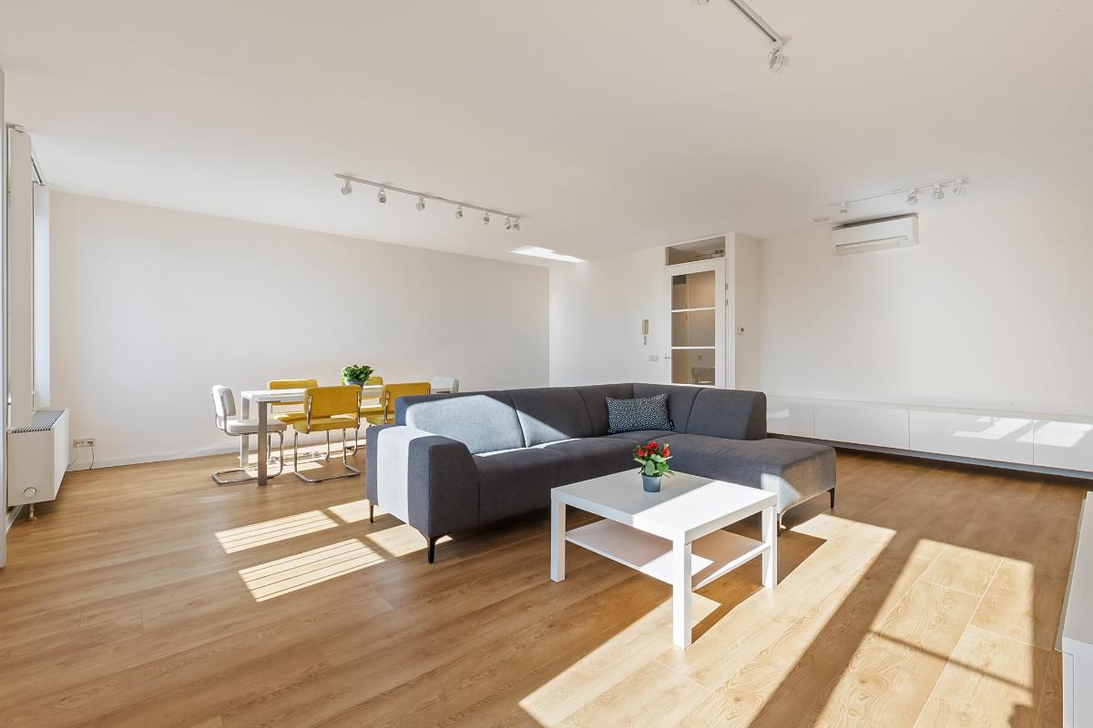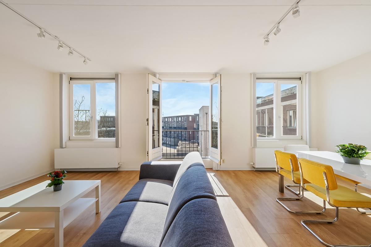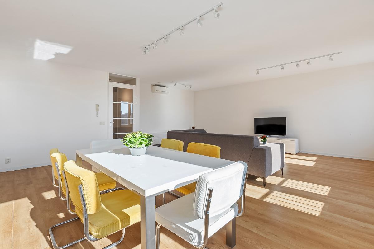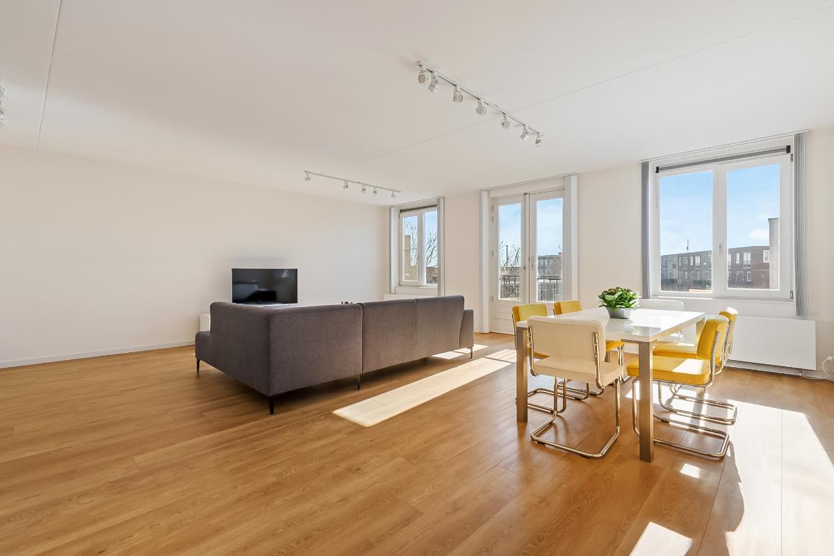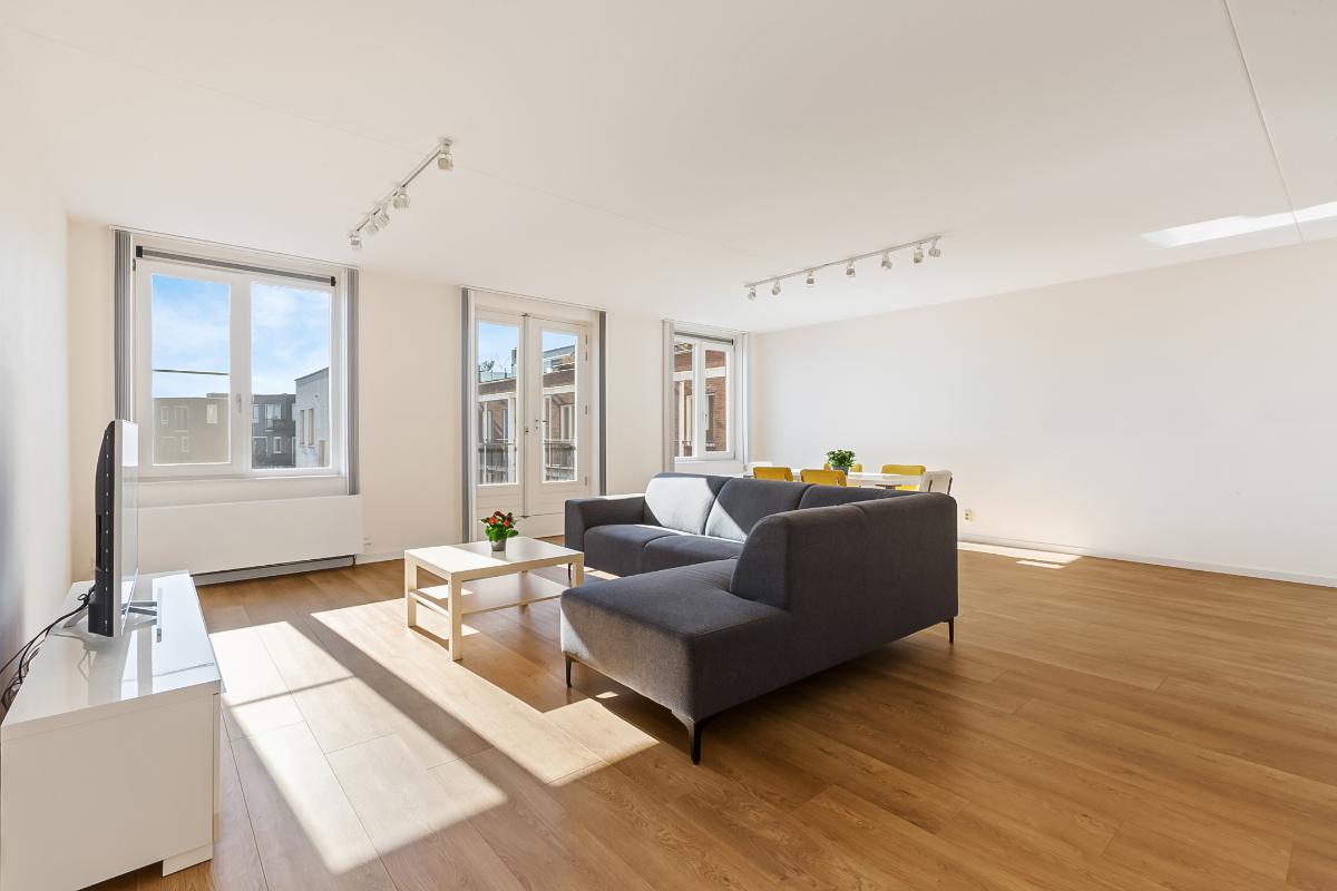 Aan het einde van de hal betreedt u de royale en bijzonder lichte woonkamer, het absolute hart van de woning. Dankzij de grote raampartijen en de openslaande deuren met Frans balkon geniet u hier van een prettige lichtinval en een open, ruimtelijk gevoel.