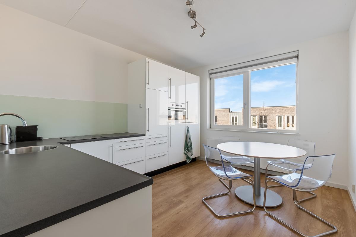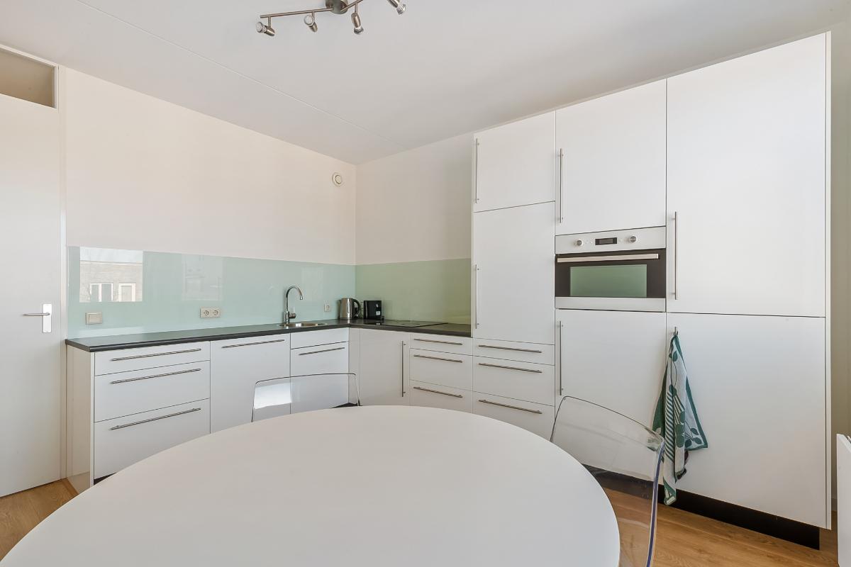 De huidige keuken bevindt zich aan de andere zijde van de hal, in de oorspronkelijke derde kamer. Deze moderne keuken is voorzien van diverse inbouwapparatuur (vaatwasser, elektrische kookplaat, combi-oven, koelkast met vriesvak en voldoende kastruimte) en biedt volop ruimte om uitgebreid te koken en te tafelen.