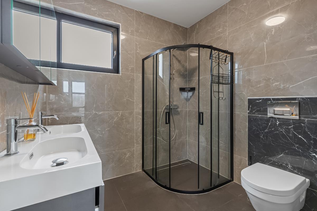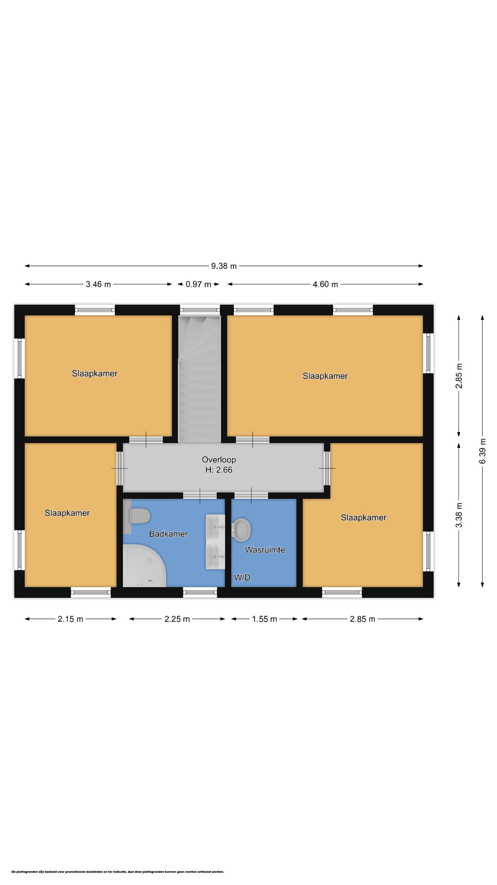 Eerste verdieping: Vanaf de overloop zijn vier slaapkamers bereikbaar, elk van goed formaat. De moderne badkamer is voorzien van een dubbele wastafel, douchecabine, toilet en een raam voor daglicht en ventilatie. Op deze verdieping is tevens een aparte wasruimte aanwezig.