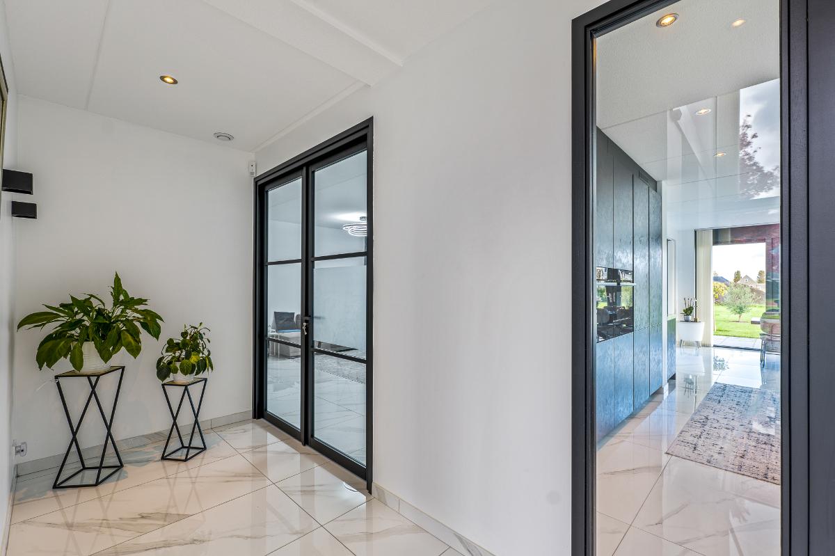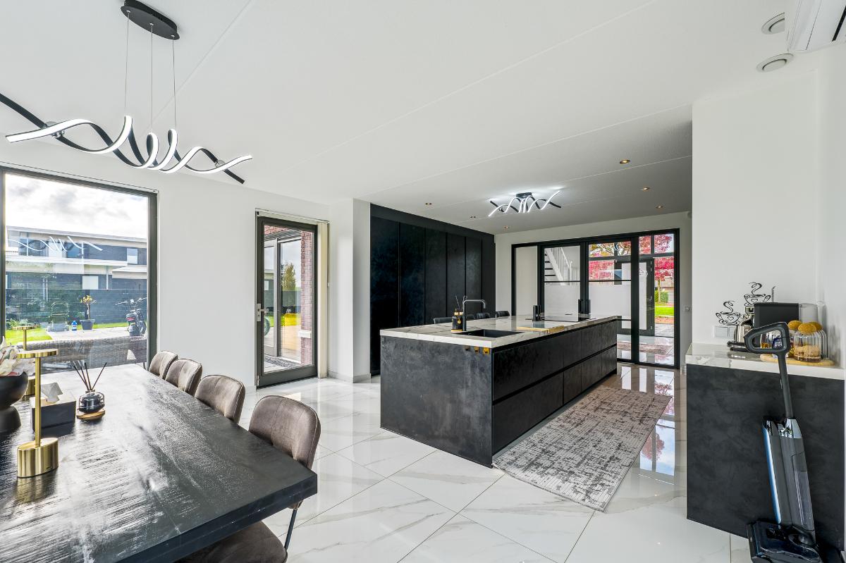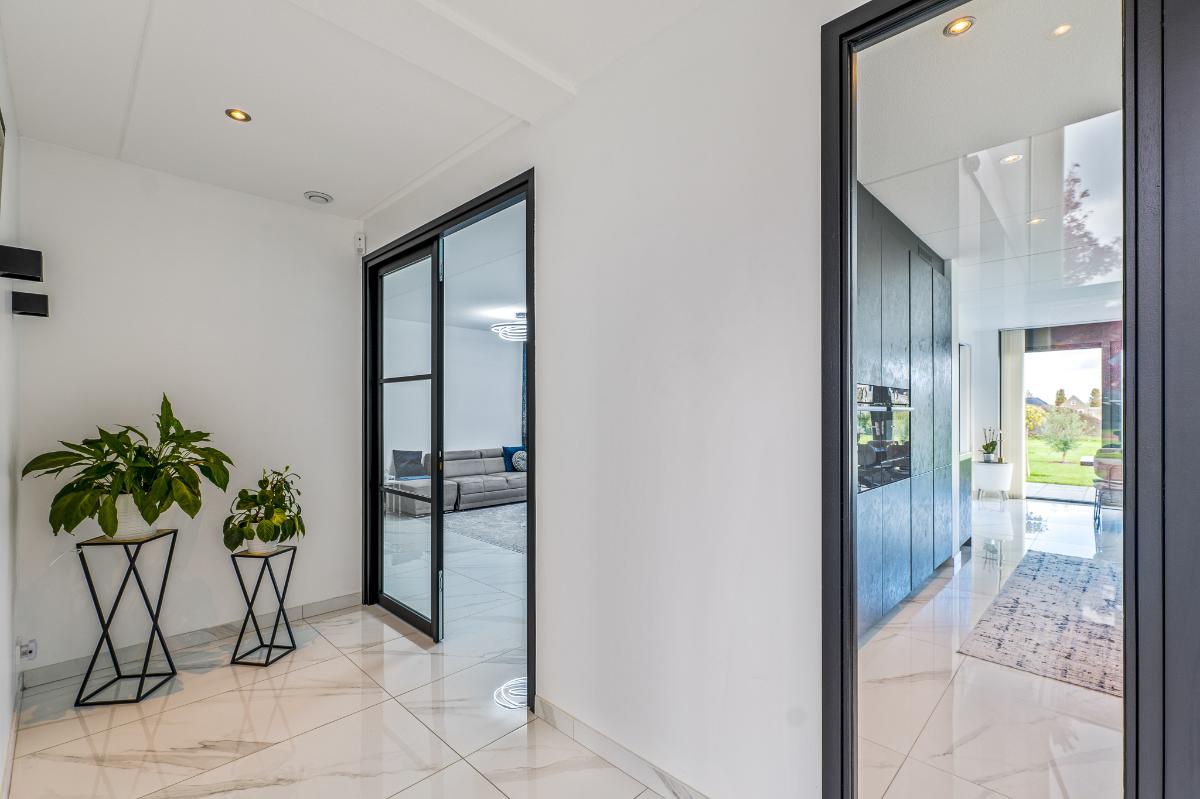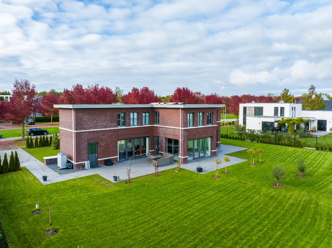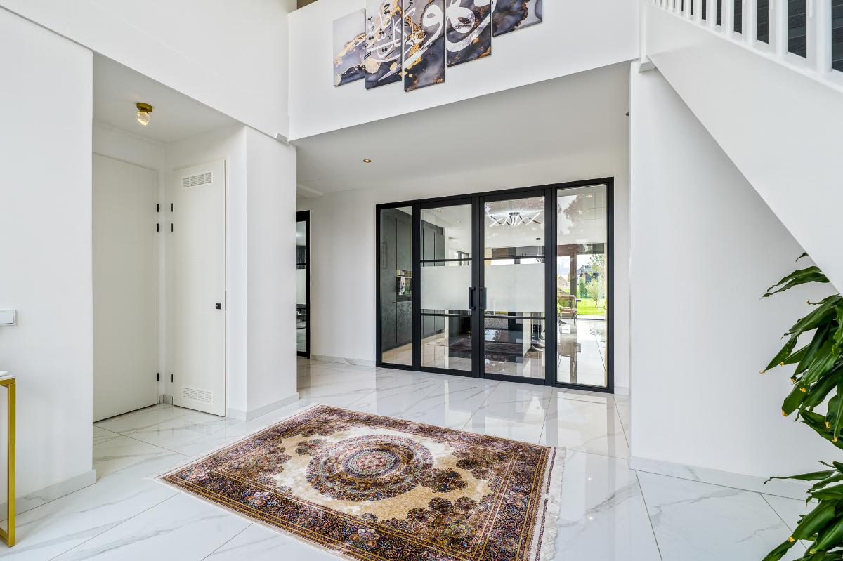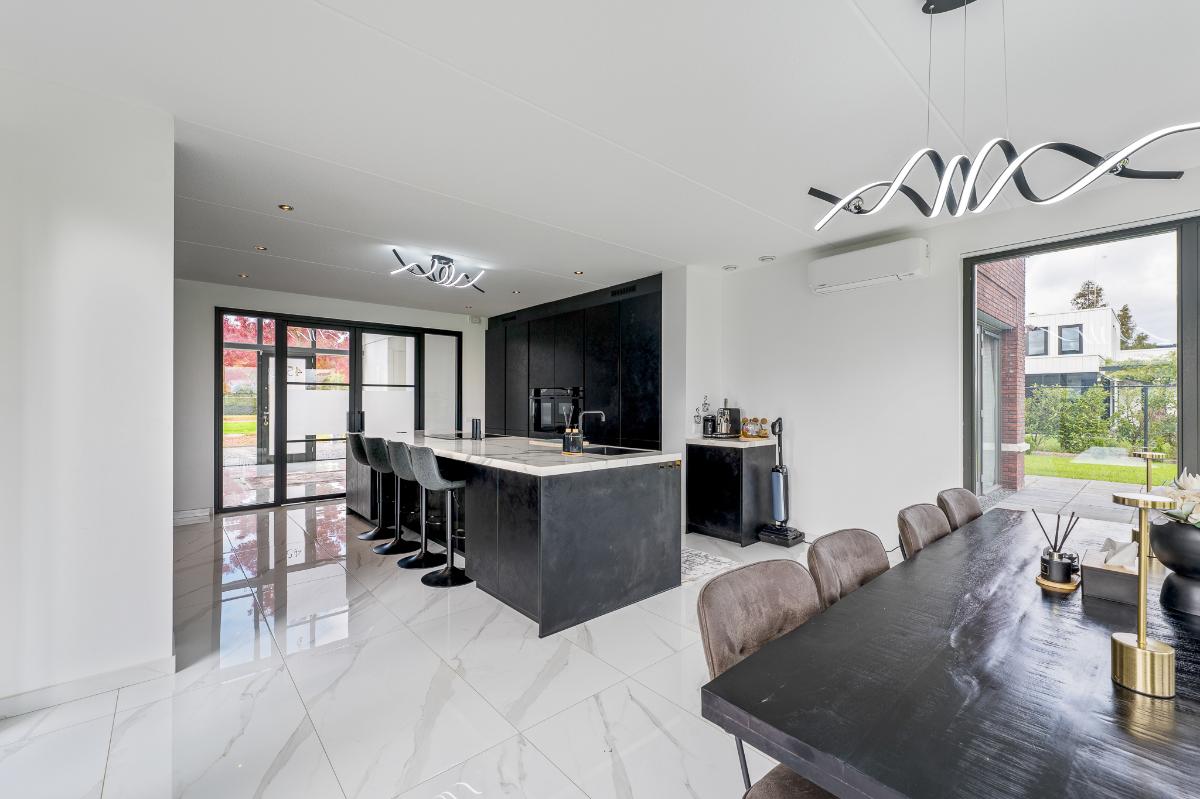 Indeling: Begane grond: Indrukwekkende entree met hoge raampartijen, een imposante hal met veel hoogte, open trappenhuis met een vide. Toilet met fontein en meterkast. Dubbele deuren geven de entree naar de eetkeuken die het hart van dit fijne familiehuis is. De keuken bestaat uit een groot kookeiland met een bar, een inductiekookplaat met ingebouwde afzuigunit, wasbak met Quooker, 2 koelkasten, 2 vriezers, 2 ovens, warmhoudlade en vaatwasser. De keuken heeft heel veel kastruimte. Vanuit de keuken zijn openslaande deuren naar het grote terras en de tuin. Via de centrale hal is de woonkamer bereikbaar die tevens is voorzien van openslaande deuren naar het terras en de tuin. Hier is tevens een doorloop naar de inpandige bergruimte met warmtepomp-installatie. Vanuit de berging is de tuin ook weer bereikbaar. Aan de andere zijde van de centrale hal bevindt zich het aparte woongedeelte. Hier is een grote woonkamer, tevens met openslaande deuren naar de tuin. Verder is hier een aparte slaapkamer en annex een badkamer die is voorzien van een inloopdouche, toilet en wastafel. Dit aparte gedeelte kan ook heel goed dienst doen als kantoor of praktijk aan huis.