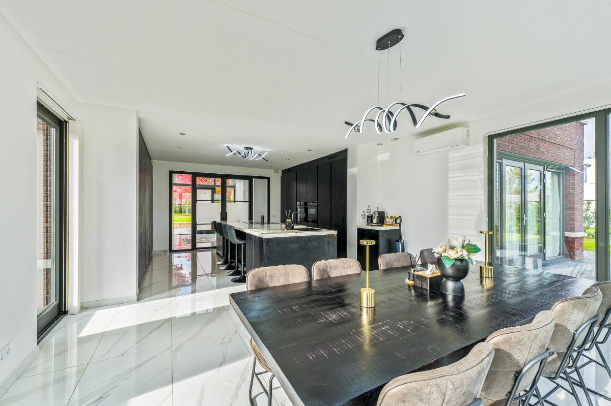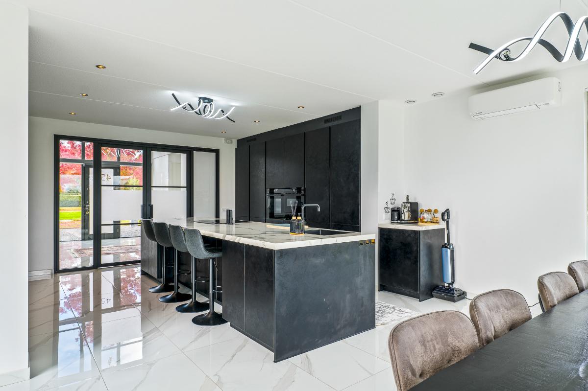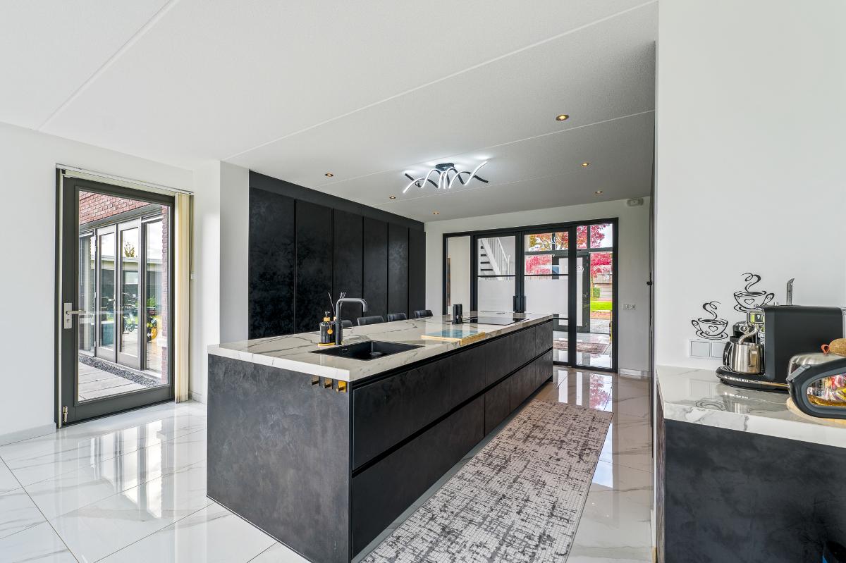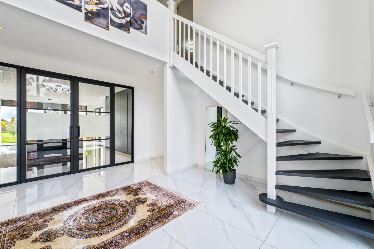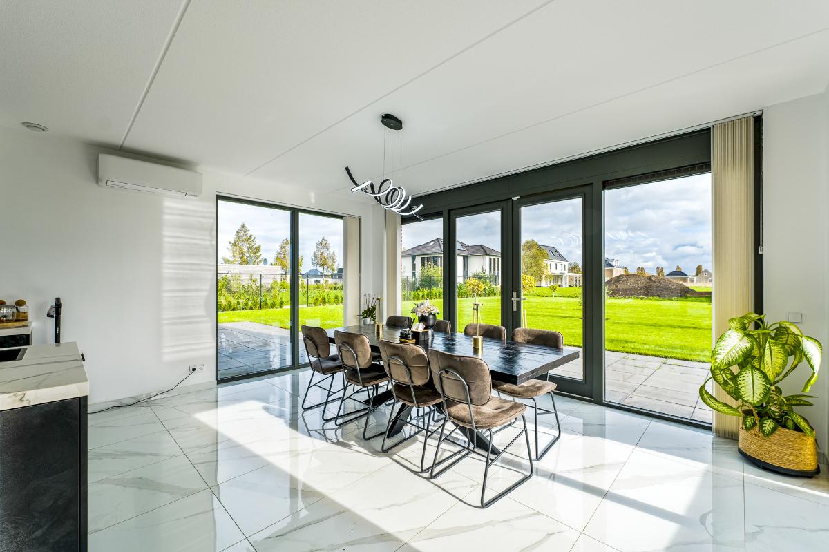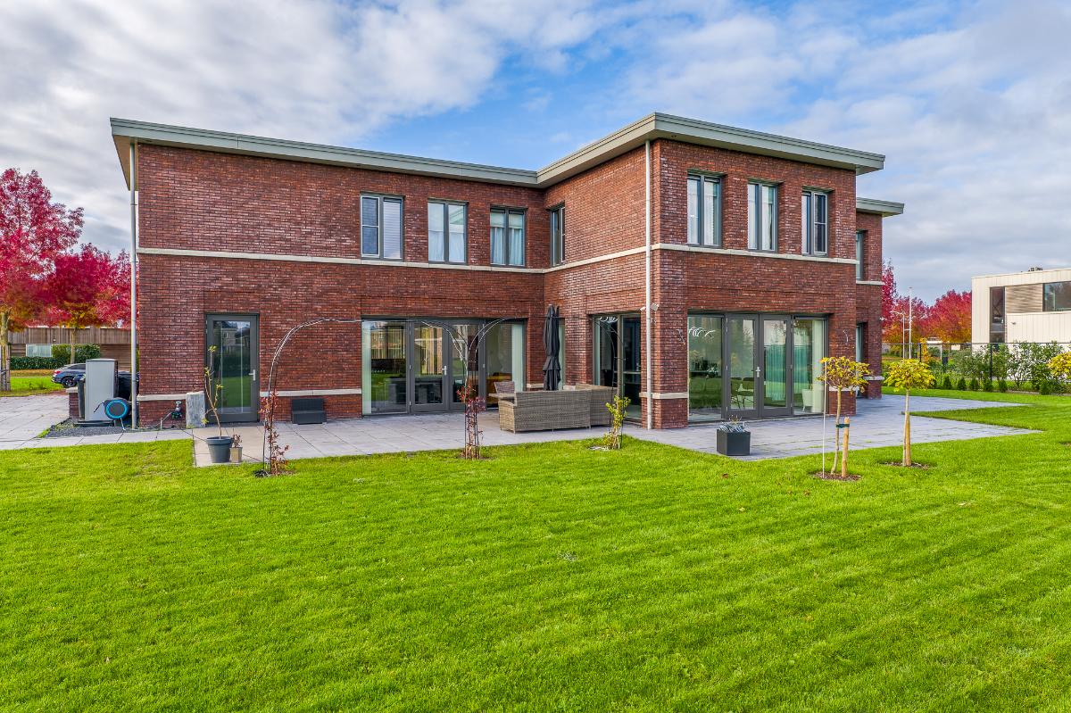 Indeling: Begane grond: Indrukwekkende entree met hoge raampartijen, een imposante hal met veel hoogte, open trappenhuis met een vide. Toilet met fontein en meterkast. Dubbele deuren geven de entree naar de eetkeuken die het hart van dit fijne familiehuis is. De keuken bestaat uit een groot kookeiland met een bar, een inductiekookplaat met ingebouwde afzuigunit, wasbak met Quooker, 2 koelkasten, 2 vriezers, 2 ovens, warmhoudlade en vaatwasser. De keuken heeft heel veel kastruimte. Vanuit de keuken zijn openslaande deuren naar het grote terras en de tuin. Via de centrale hal is de woonkamer bereikbaar die tevens is voorzien van openslaande deuren naar het terras en de tuin. Hier is tevens een doorloop naar de inpandige bergruimte met warmtepomp-installatie. Vanuit de berging is de tuin ook weer bereikbaar. Aan de andere zijde van de centrale hal bevindt zich het aparte woongedeelte. Hier is een grote woonkamer, tevens met openslaande deuren naar de tuin. Verder is hier een aparte slaapkamer en annex een badkamer die is voorzien van een inloopdouche, toilet en wastafel. Dit aparte gedeelte kan ook heel goed dienst doen als kantoor of praktijk aan huis.
