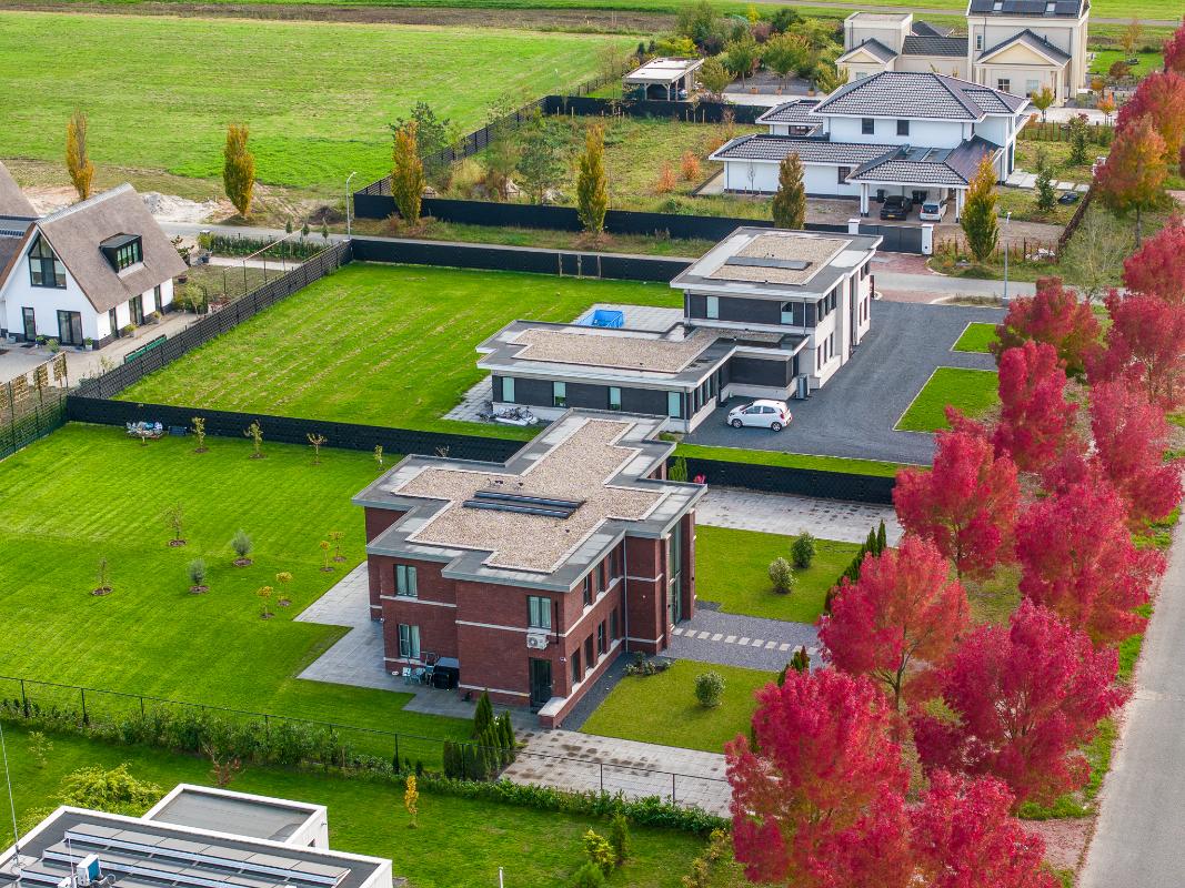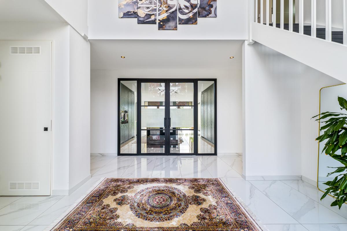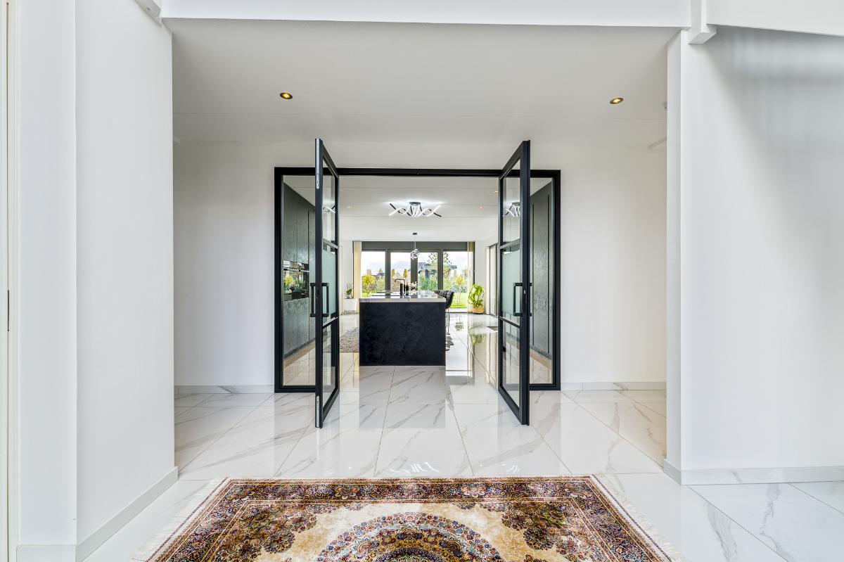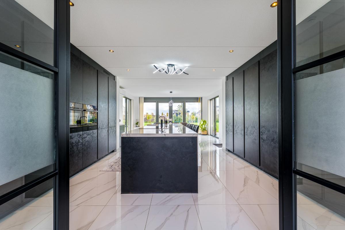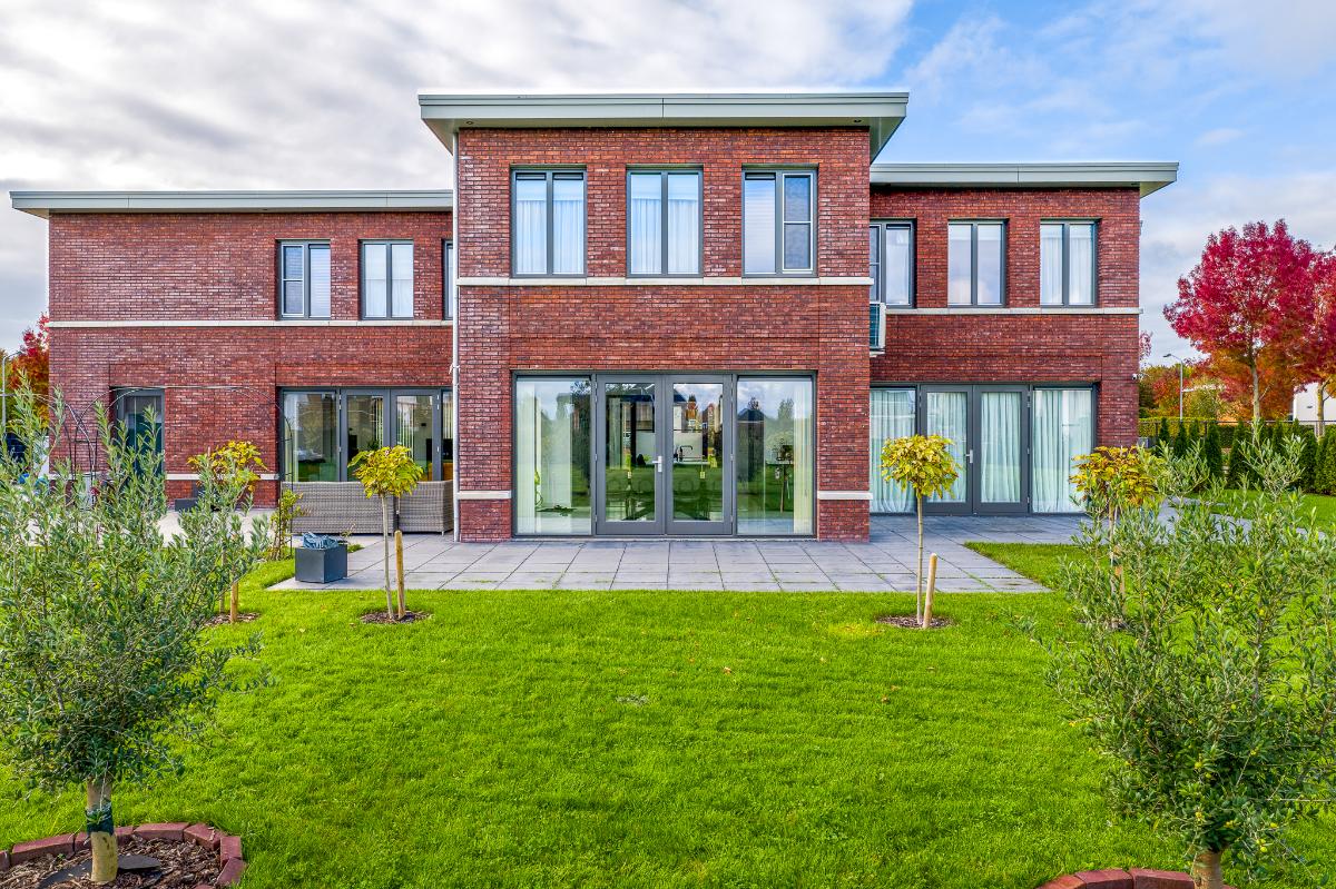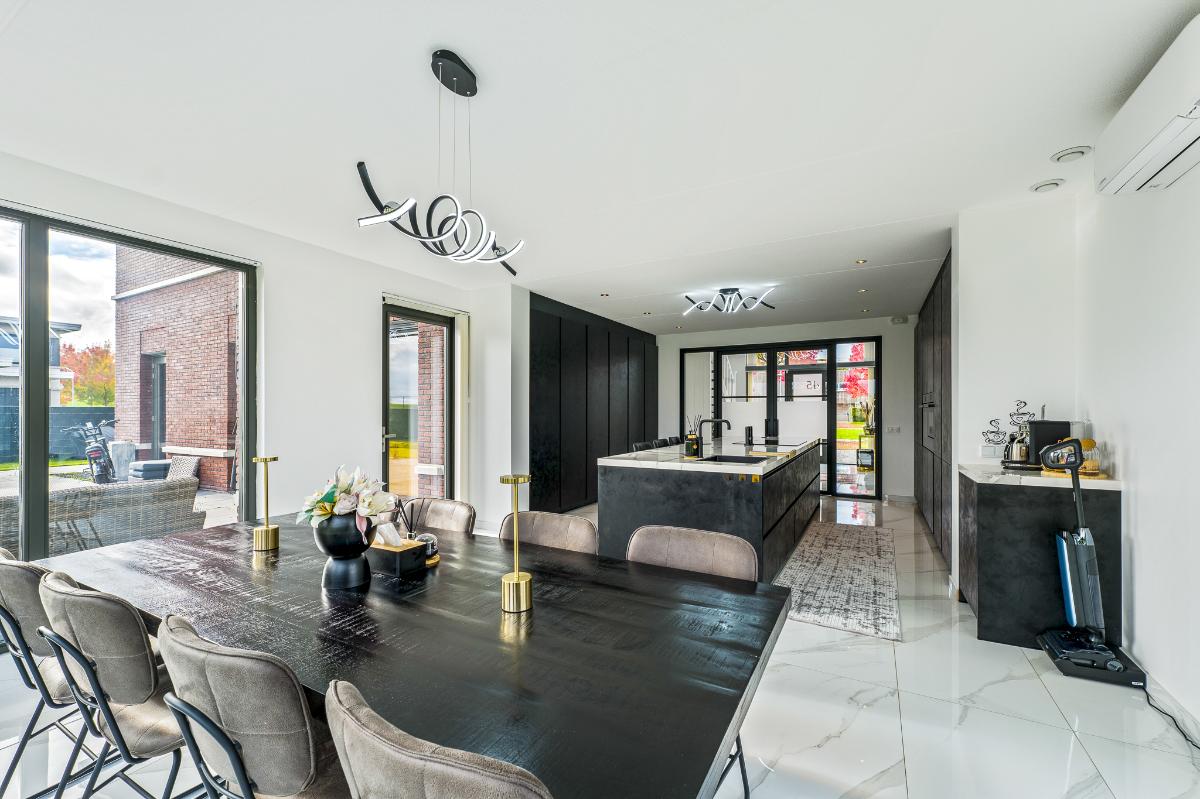 Indeling: Begane grond: Indrukwekkende entree met hoge raampartijen, een imposante hal met veel hoogte, open trappenhuis met een vide. Toilet met fontein en meterkast. Dubbele deuren geven de entree naar de eetkeuken die het hart van dit fijne familiehuis is. De keuken bestaat uit een groot kookeiland met een bar, een inductiekookplaat met ingebouwde afzuigunit, wasbak met Quooker, 2 koelkasten, 2 vriezers, 2 ovens, warmhoudlade en vaatwasser. De keuken heeft heel veel kastruimte. Vanuit de keuken zijn openslaande deuren naar het grote terras en de tuin. Via de centrale hal is de woonkamer bereikbaar die tevens is voorzien van openslaande deuren naar het terras en de tuin. Hier is tevens een doorloop naar de inpandige bergruimte met warmtepomp-installatie. Vanuit de berging is de tuin ook weer bereikbaar. Aan de andere zijde van de centrale hal bevindt zich het aparte woongedeelte. Hier is een grote woonkamer, tevens met openslaande deuren naar de tuin. Verder is hier een aparte slaapkamer en annex een badkamer die is voorzien van een inloopdouche, toilet en wastafel. Dit aparte gedeelte kan ook heel goed dienst doen als kantoor of praktijk aan huis.