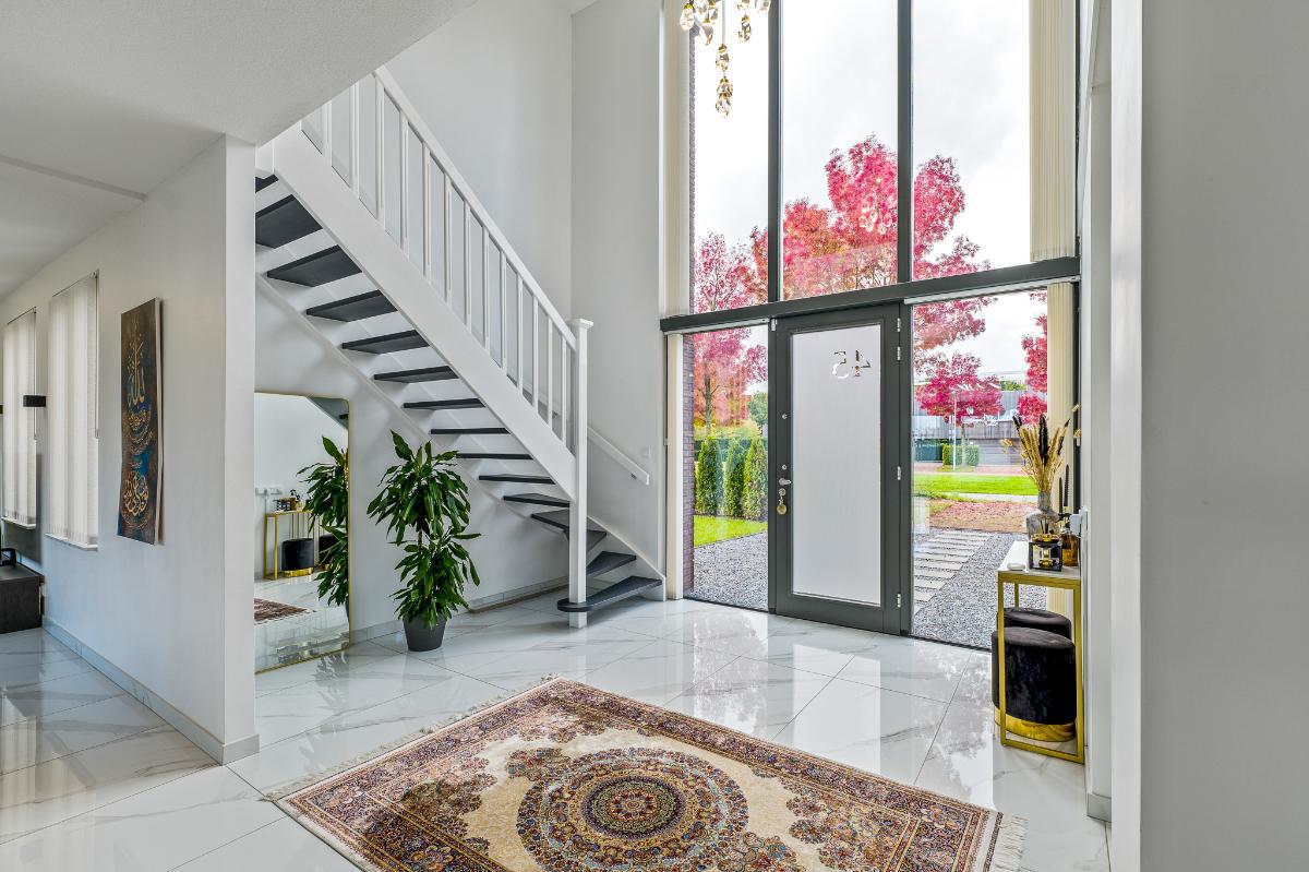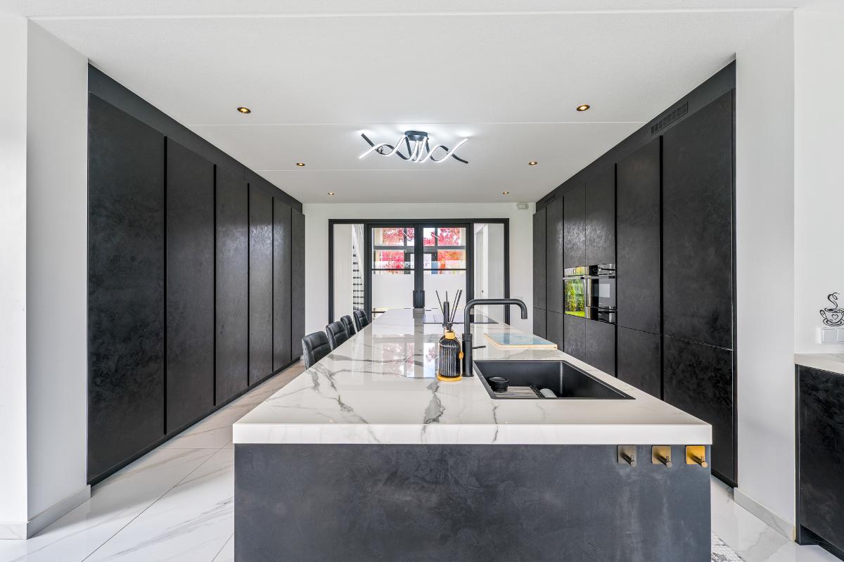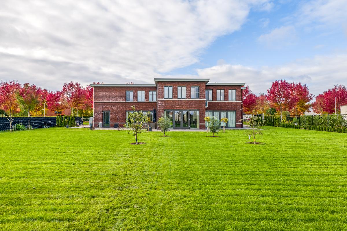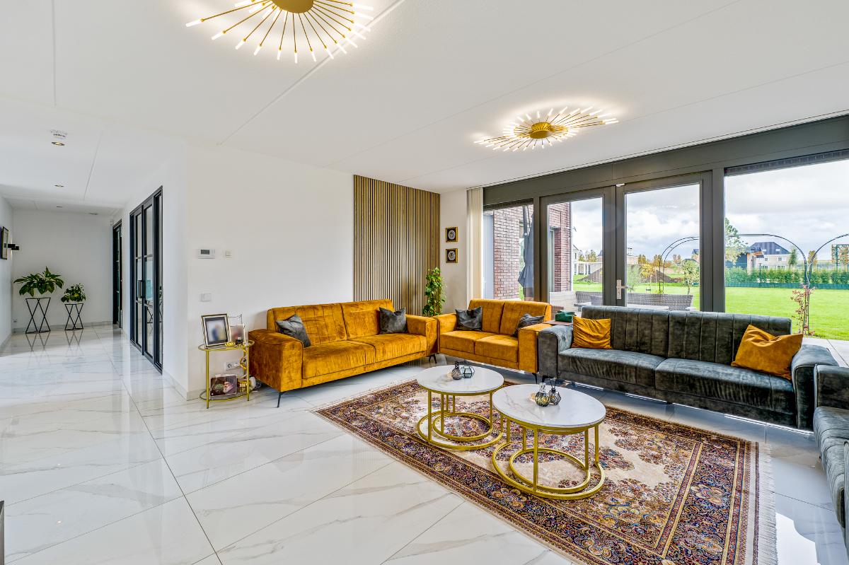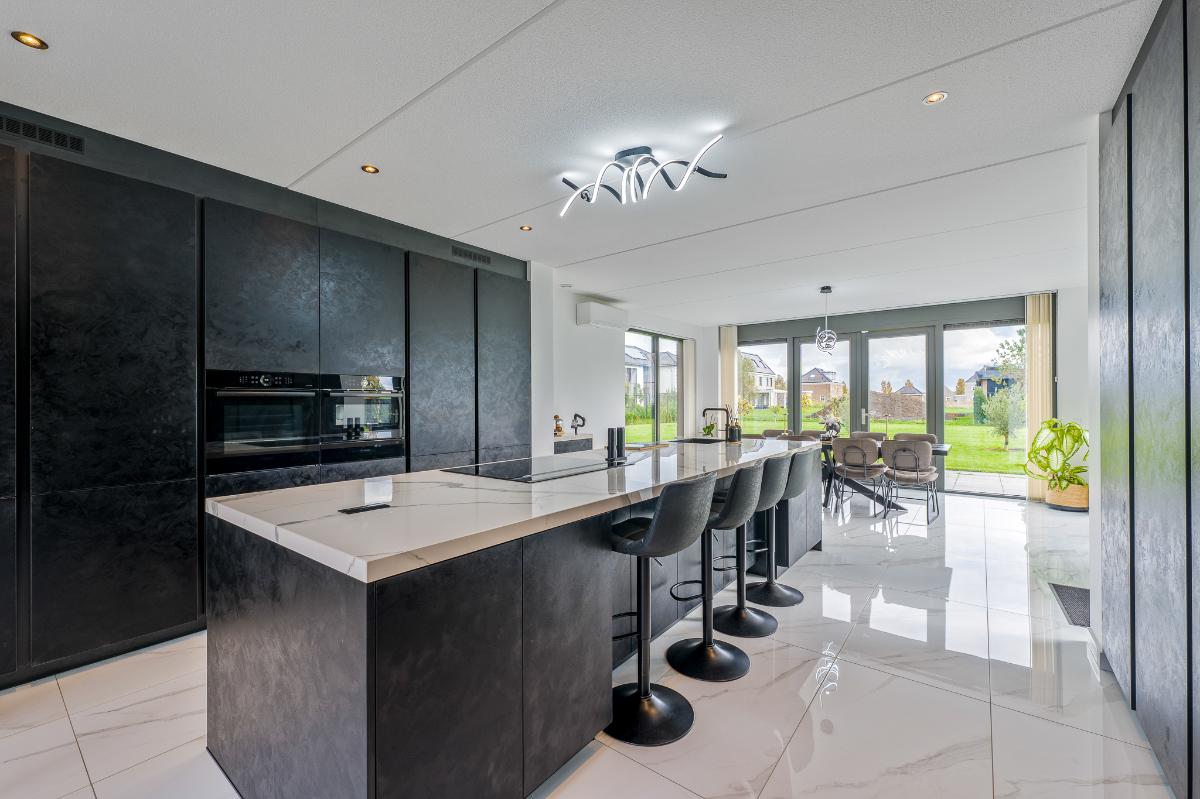 Indeling: Begane grond: Indrukwekkende entree met hoge raampartijen, een imposante hal met veel hoogte, open trappenhuis met een vide. Toilet met fontein en meterkast. Dubbele deuren geven de entree naar de eetkeuken die het hart van dit fijne familiehuis is. De keuken bestaat uit een groot kookeiland met een bar, een inductiekookplaat met ingebouwde afzuigunit, wasbak met Quooker, 2 koelkasten, 2 vriezers, 2 ovens, warmhoudlade en vaatwasser. De keuken heeft heel veel kastruimte. Vanuit de keuken zijn openslaande deuren naar het grote terras en de tuin. Via de centrale hal is de woonkamer bereikbaar die tevens is voorzien van openslaande deuren naar het terras en de tuin. Hier is tevens een doorloop naar de inpandige bergruimte met warmtepomp-installatie. Vanuit de berging is de tuin ook weer bereikbaar. Aan de andere zijde van de centrale hal bevindt zich het aparte woongedeelte. Hier is een grote woonkamer, tevens met openslaande deuren naar de tuin. Verder is hier een aparte slaapkamer en annex een badkamer die is voorzien van een inloopdouche, toilet en wastafel. Dit aparte gedeelte kan ook heel goed dienst doen als kantoor of praktijk aan huis.