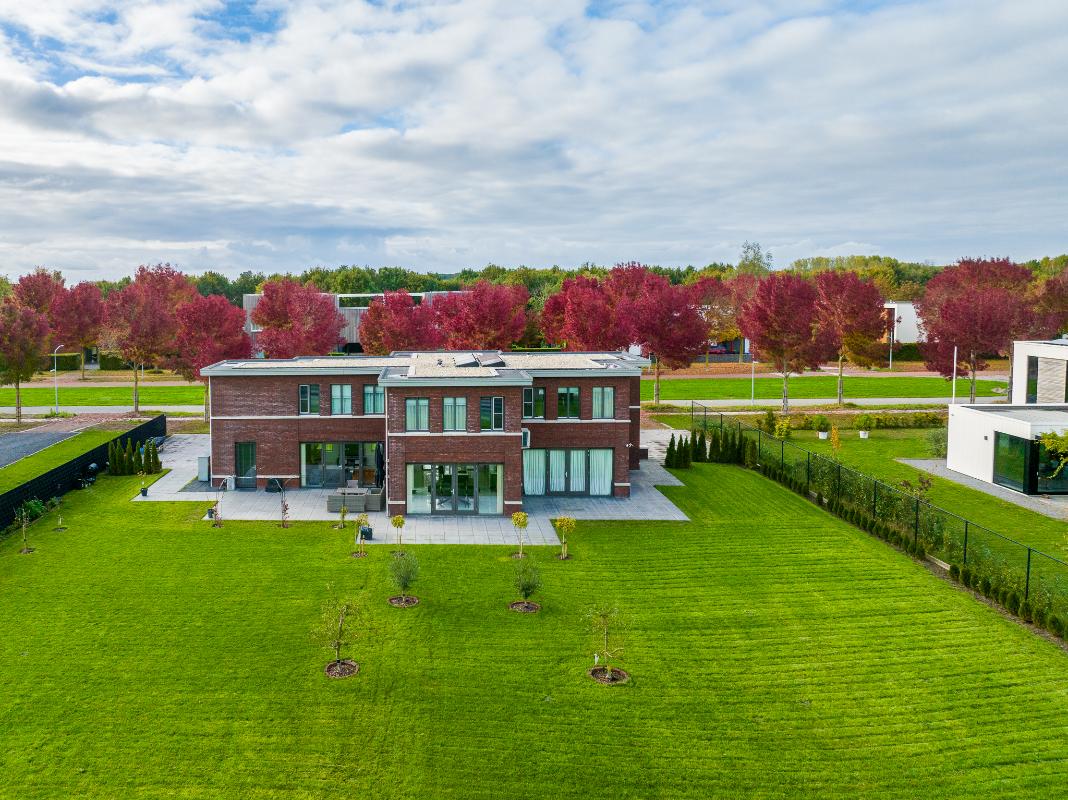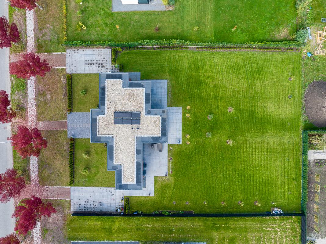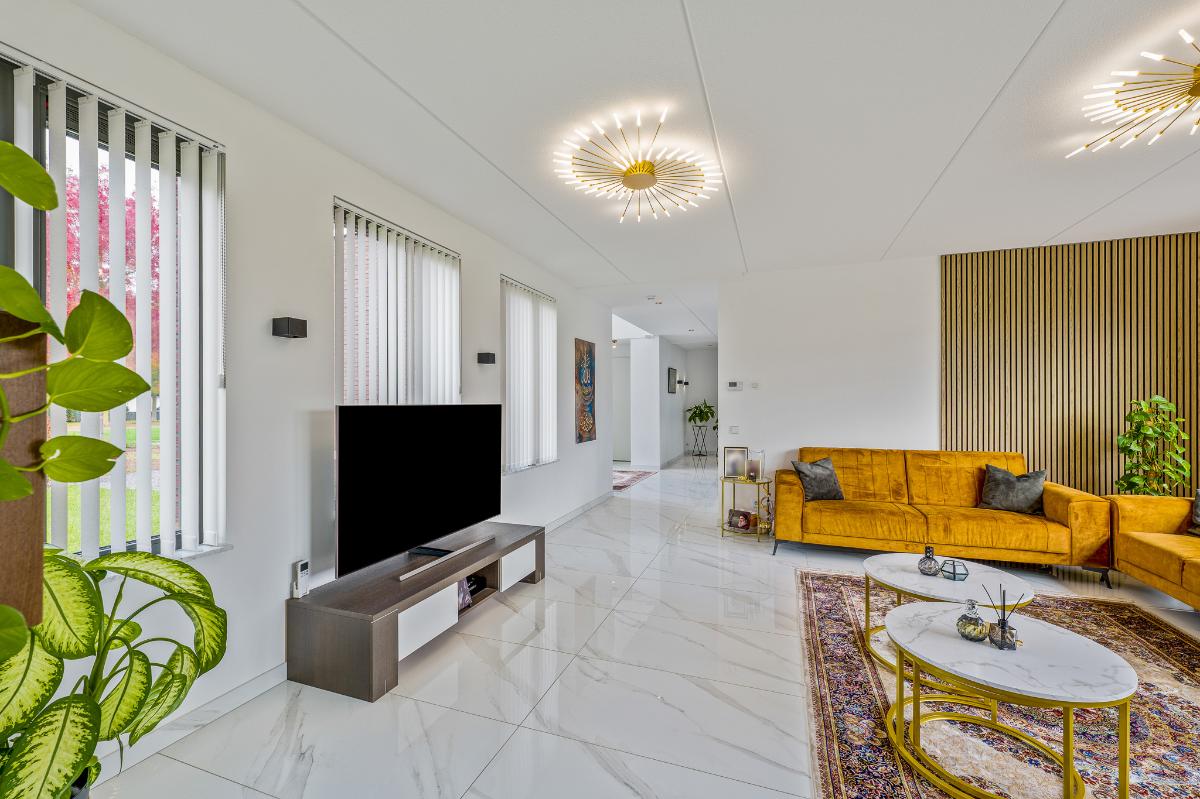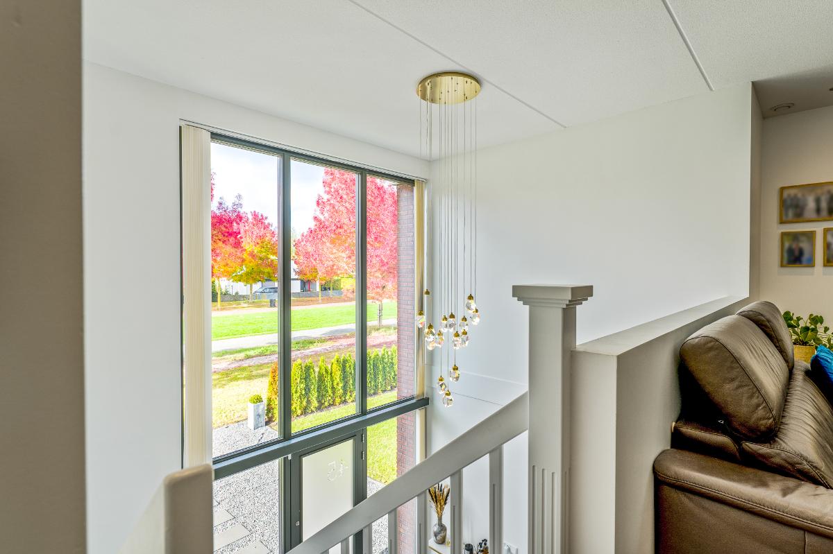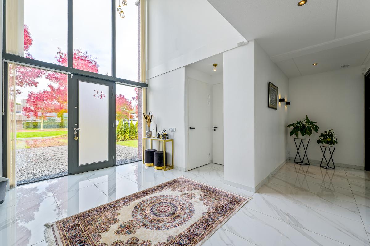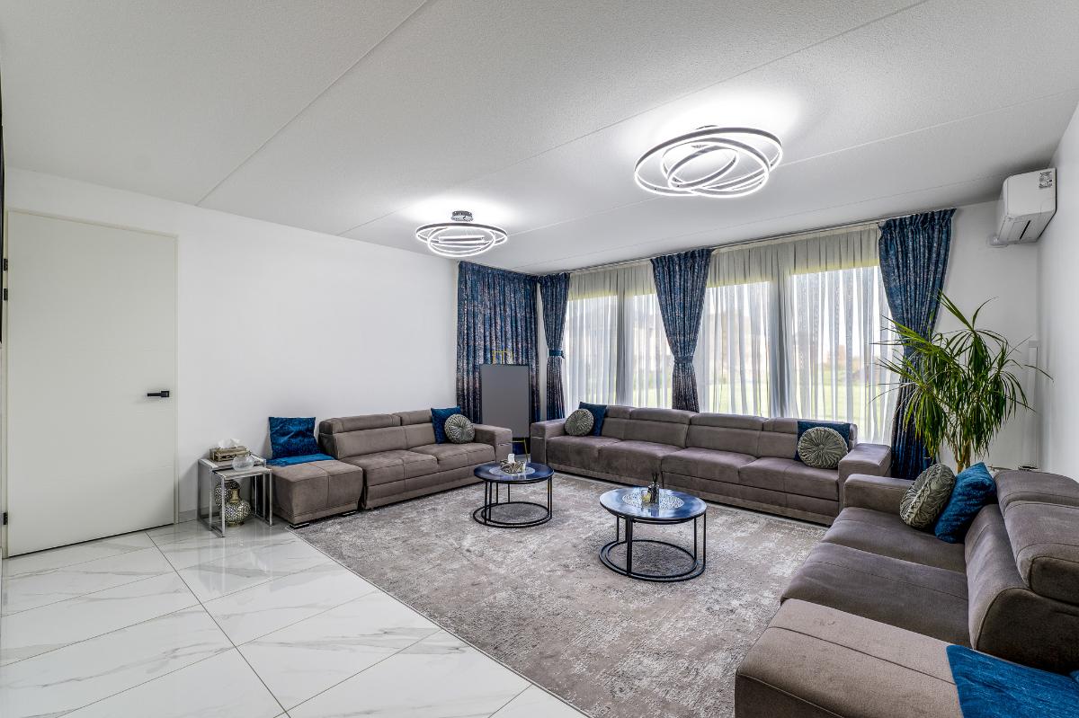 Indeling: Begane grond: Indrukwekkende entree met hoge raampartijen, een imposante hal met veel hoogte, open trappenhuis met een vide. Toilet met fontein en meterkast. Dubbele deuren geven de entree naar de eetkeuken die het hart van dit fijne familiehuis is. De keuken bestaat uit een groot kookeiland met een bar, een inductiekookplaat met ingebouwde afzuigunit, wasbak met Quooker, 2 koelkasten, 2 vriezers, 2 ovens, warmhoudlade en vaatwasser. De keuken heeft heel veel kastruimte. Vanuit de keuken zijn openslaande deuren naar het grote terras en de tuin. Via de centrale hal is de woonkamer bereikbaar die tevens is voorzien van openslaande deuren naar het terras en de tuin. Hier is tevens een doorloop naar de inpandige bergruimte met warmtepomp-installatie. Vanuit de berging is de tuin ook weer bereikbaar. Aan de andere zijde van de centrale hal bevindt zich het aparte woongedeelte. Hier is een grote woonkamer, tevens met openslaande deuren naar de tuin. Verder is hier een aparte slaapkamer en annex een badkamer die is voorzien van een inloopdouche, toilet en wastafel. Dit aparte gedeelte kan ook heel goed dienst doen als kantoor of praktijk aan huis.