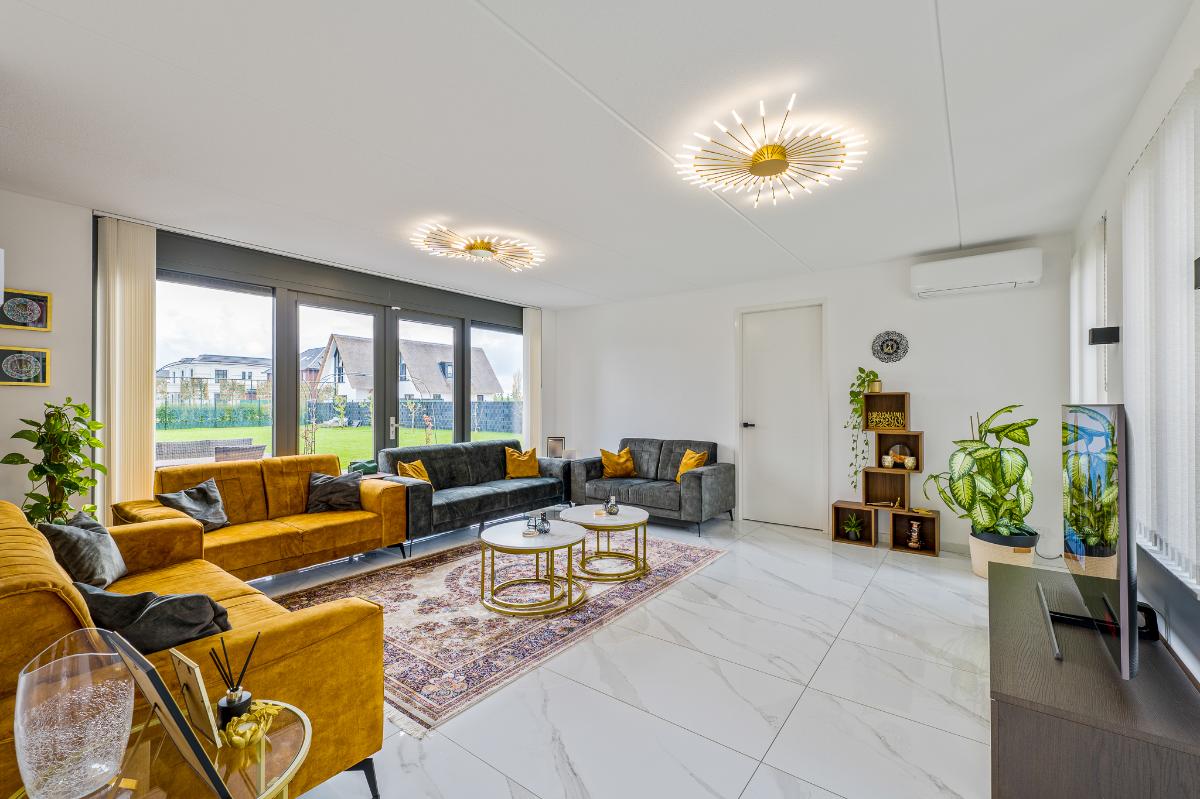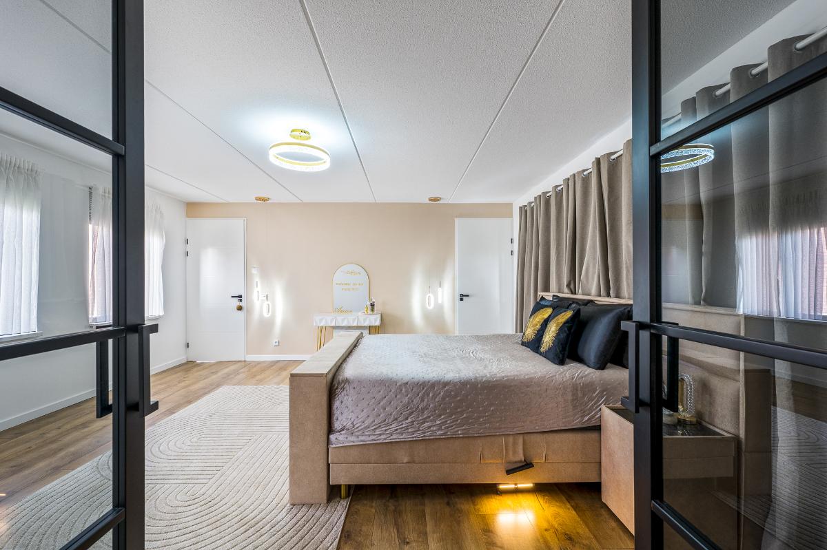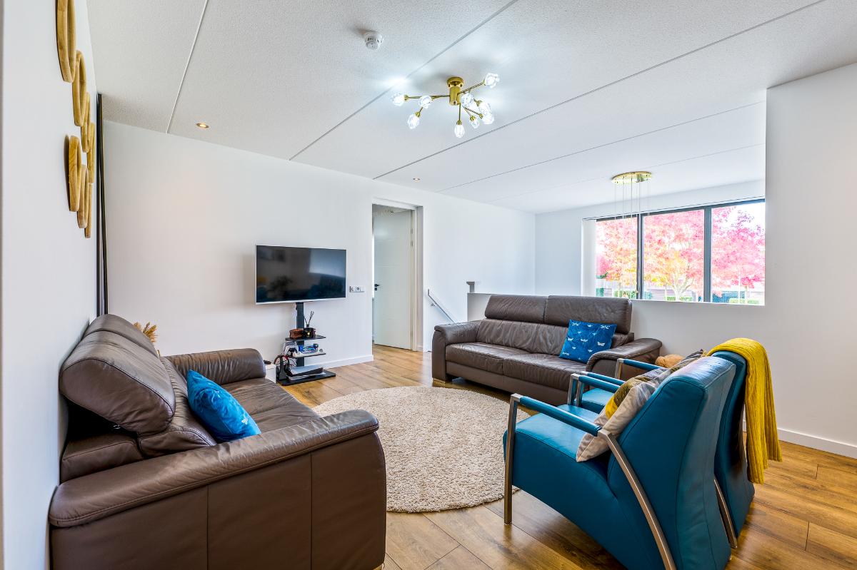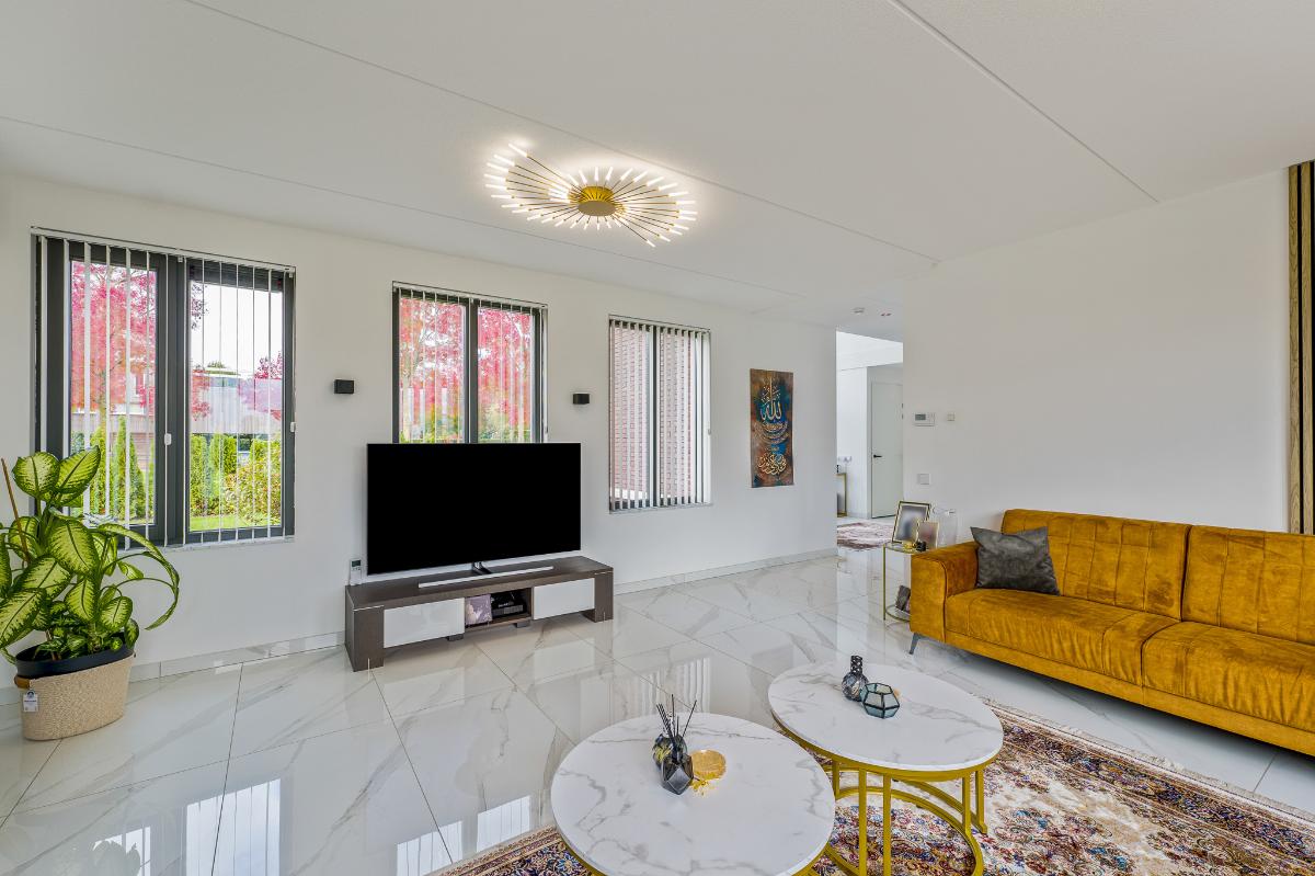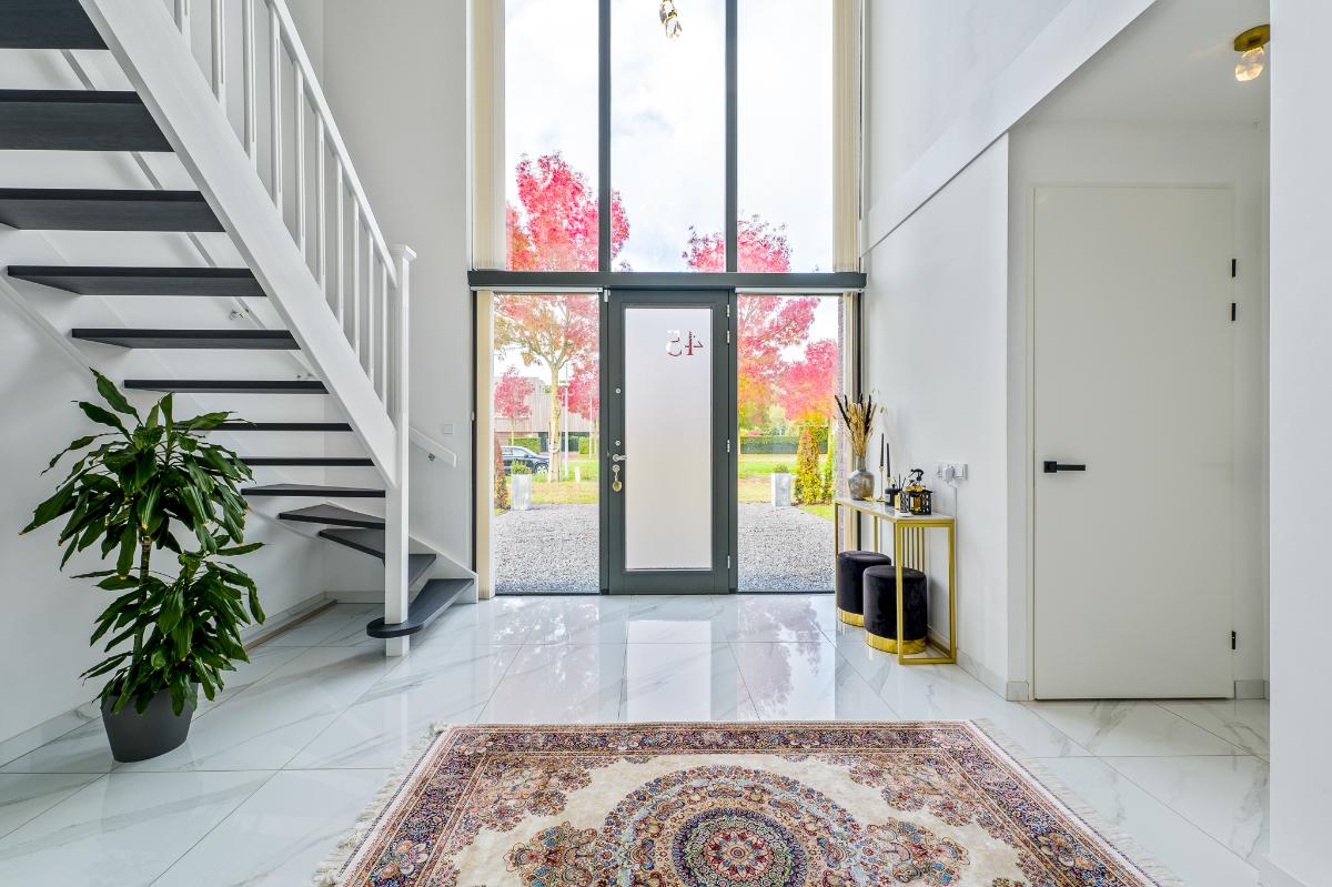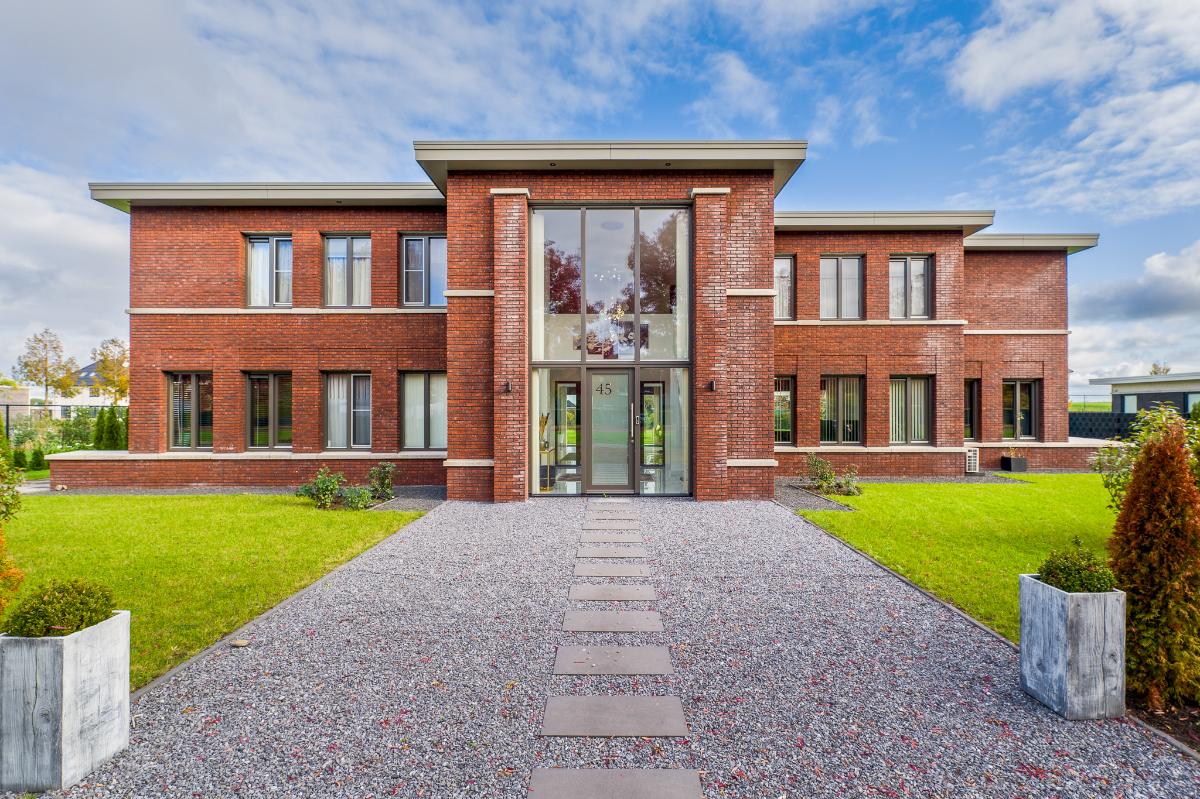 Indeling: Begane grond: Indrukwekkende entree met hoge raampartijen, een imposante hal met veel hoogte, open trappenhuis met een vide. Toilet met fontein en meterkast. Dubbele deuren geven de entree naar de eetkeuken die het hart van dit fijne familiehuis is. De keuken bestaat uit een groot kookeiland met een bar, een inductiekookplaat met ingebouwde afzuigunit, wasbak met Quooker, 2 koelkasten, 2 vriezers, 2 ovens, warmhoudlade en vaatwasser. De keuken heeft heel veel kastruimte. Vanuit de keuken zijn openslaande deuren naar het grote terras en de tuin. Via de centrale hal is de woonkamer bereikbaar die tevens is voorzien van openslaande deuren naar het terras en de tuin. Hier is tevens een doorloop naar de inpandige bergruimte met warmtepomp-installatie. Vanuit de berging is de tuin ook weer bereikbaar. Aan de andere zijde van de centrale hal bevindt zich het aparte woongedeelte. Hier is een grote woonkamer, tevens met openslaande deuren naar de tuin. Verder is hier een aparte slaapkamer en annex een badkamer die is voorzien van een inloopdouche, toilet en wastafel. Dit aparte gedeelte kan ook heel goed dienst doen als kantoor of praktijk aan huis.
