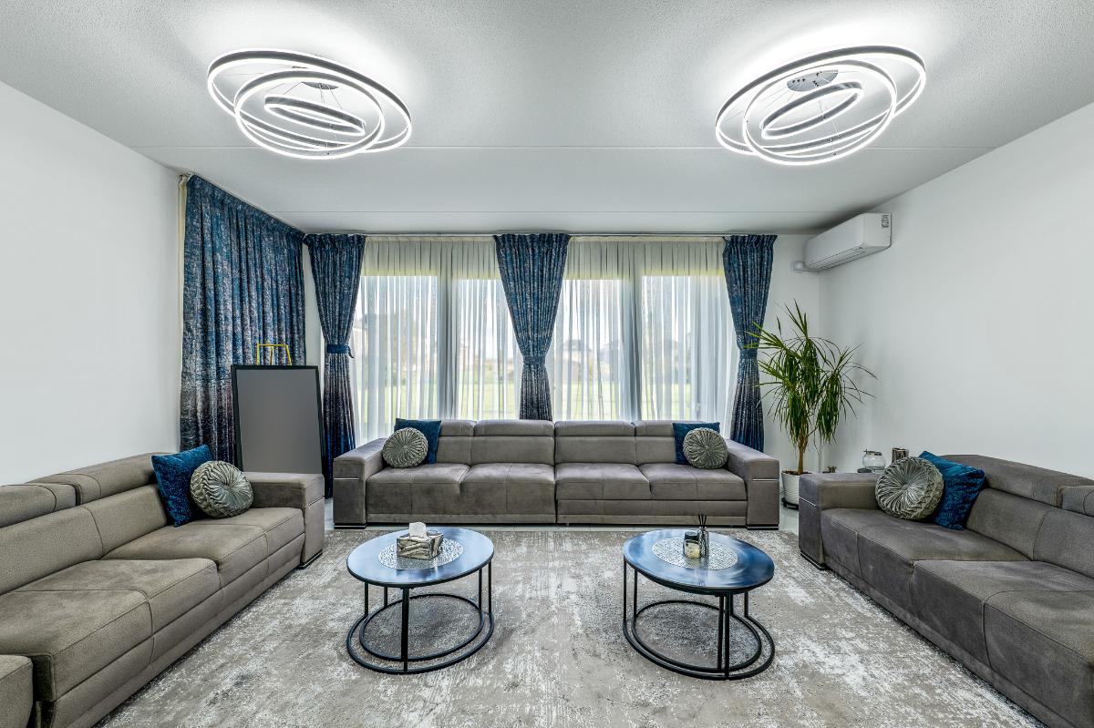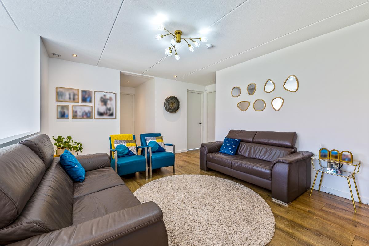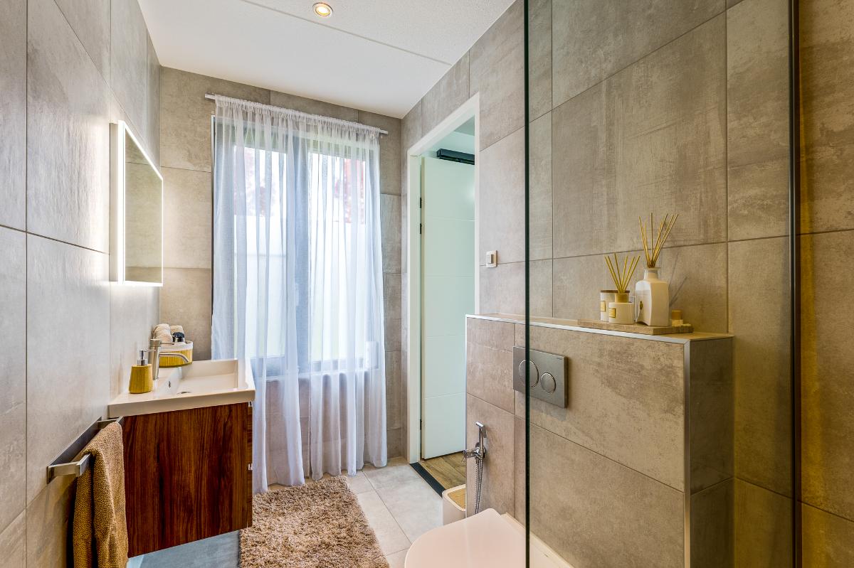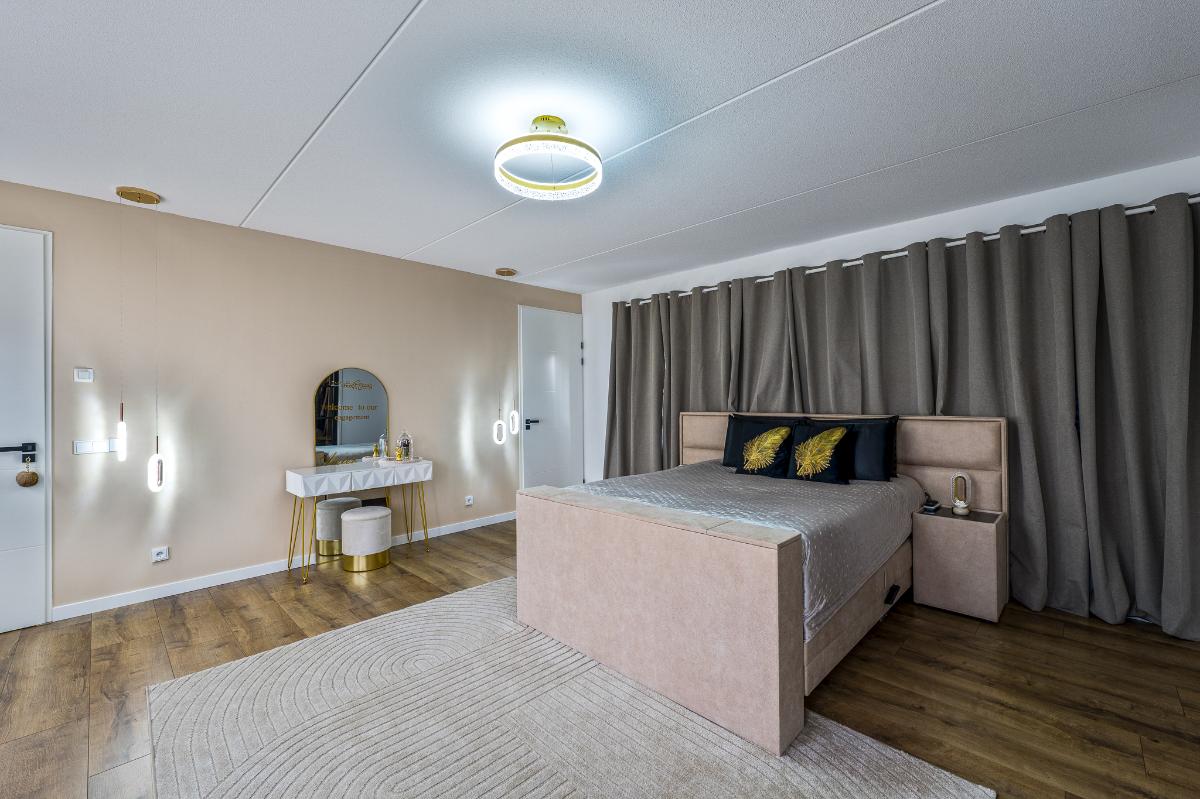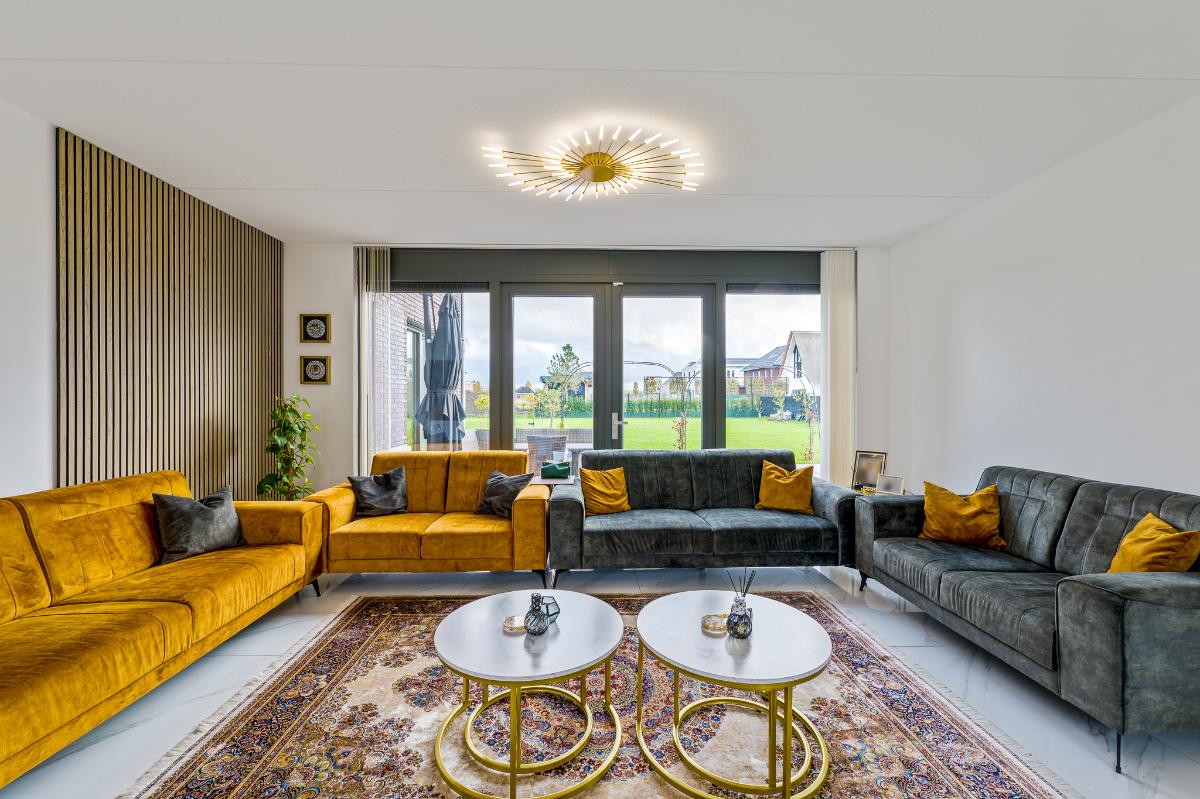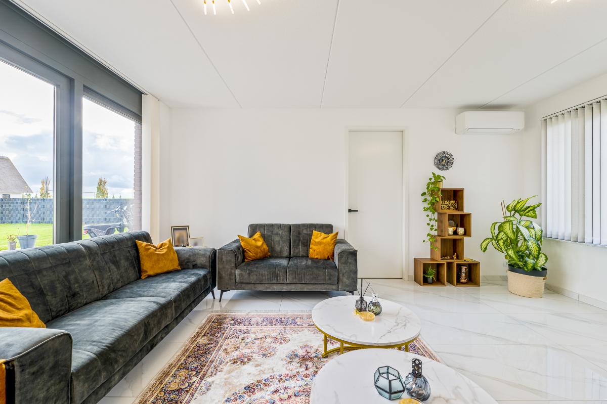 Indeling: Begane grond: Indrukwekkende entree met hoge raampartijen, een imposante hal met veel hoogte, open trappenhuis met een vide. Toilet met fontein en meterkast. Dubbele deuren geven de entree naar de eetkeuken die het hart van dit fijne familiehuis is. De keuken bestaat uit een groot kookeiland met een bar, een inductiekookplaat met ingebouwde afzuigunit, wasbak met Quooker, 2 koelkasten, 2 vriezers, 2 ovens, warmhoudlade en vaatwasser. De keuken heeft heel veel kastruimte. Vanuit de keuken zijn openslaande deuren naar het grote terras en de tuin. Via de centrale hal is de woonkamer bereikbaar die tevens is voorzien van openslaande deuren naar het terras en de tuin. Hier is tevens een doorloop naar de inpandige bergruimte met warmtepomp-installatie. Vanuit de berging is de tuin ook weer bereikbaar. Aan de andere zijde van de centrale hal bevindt zich het aparte woongedeelte. Hier is een grote woonkamer, tevens met openslaande deuren naar de tuin. Verder is hier een aparte slaapkamer en annex een badkamer die is voorzien van een inloopdouche, toilet en wastafel. Dit aparte gedeelte kan ook heel goed dienst doen als kantoor of praktijk aan huis.