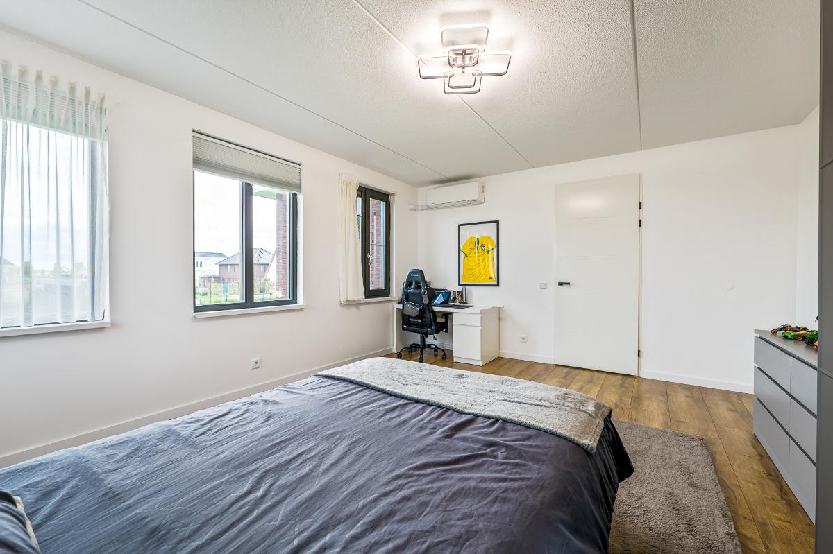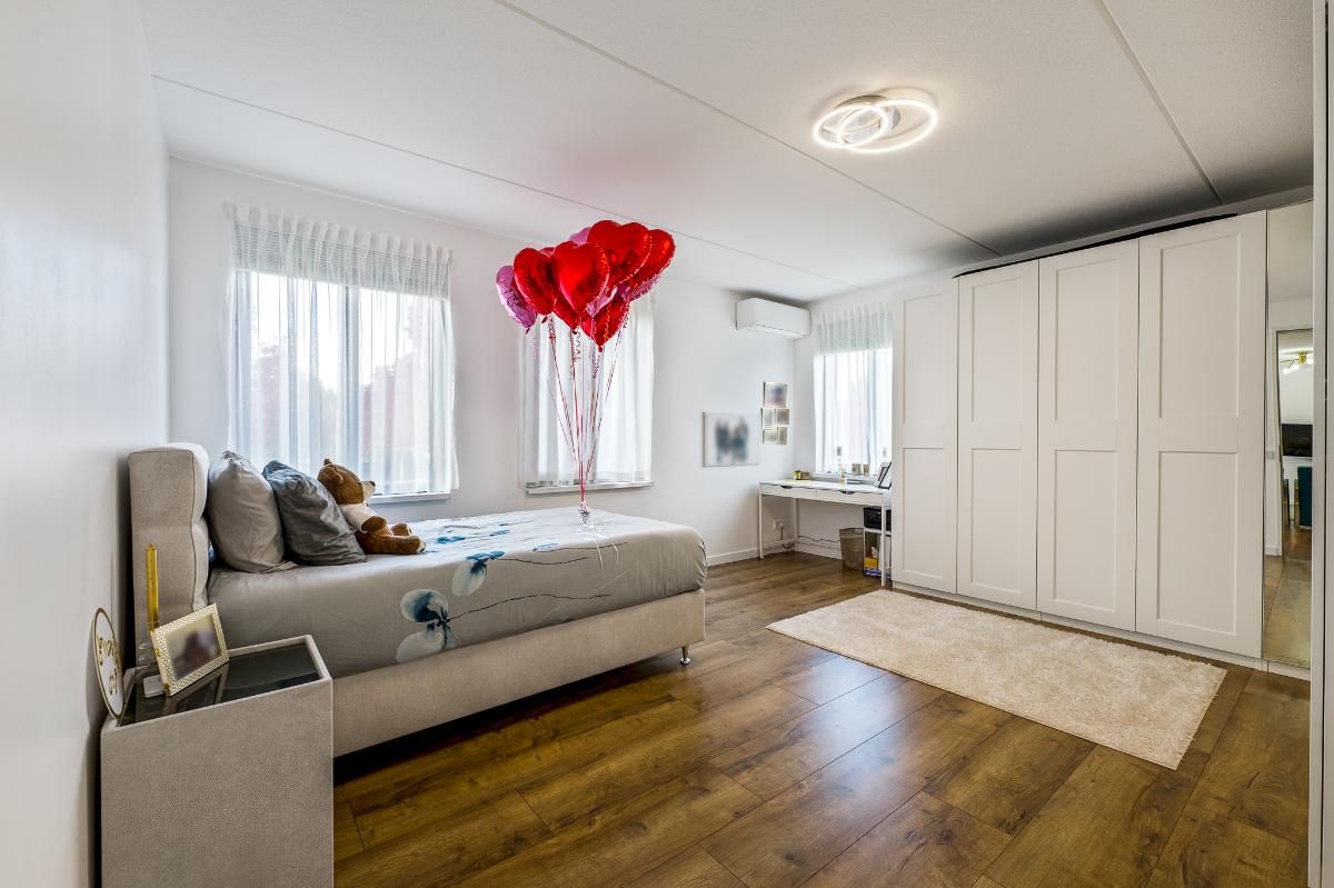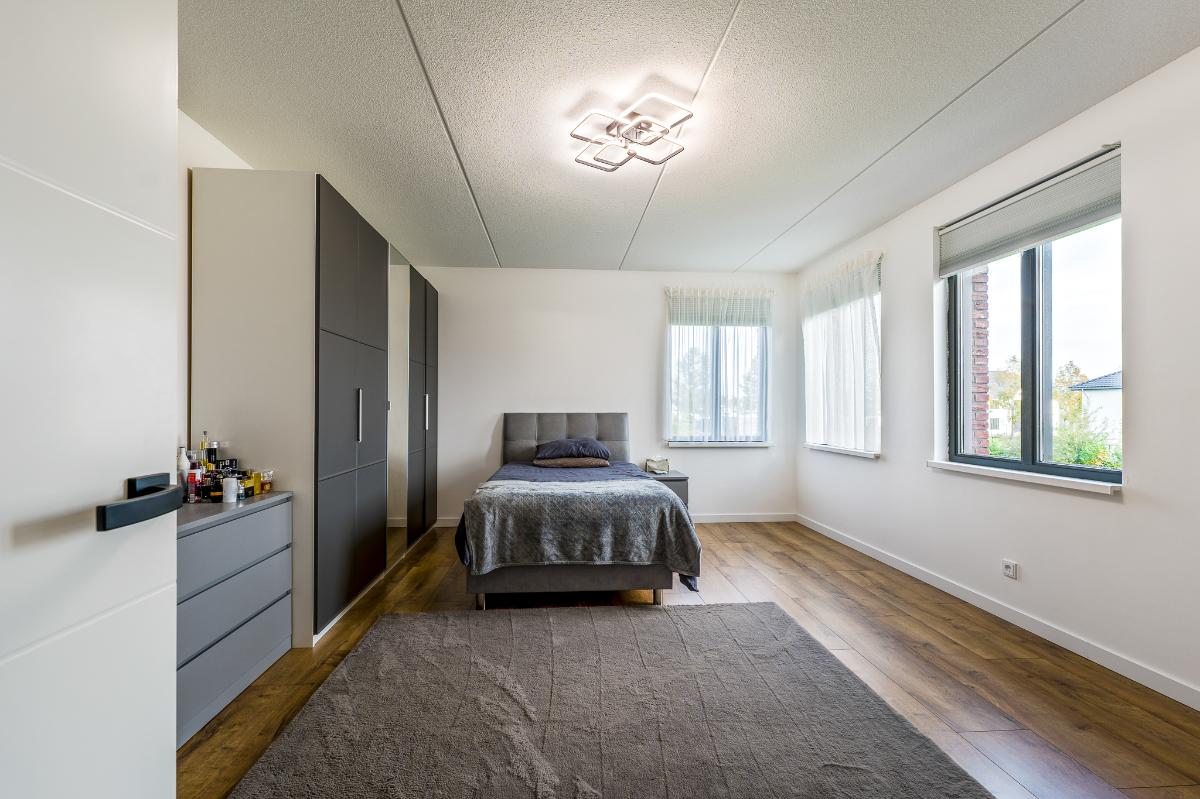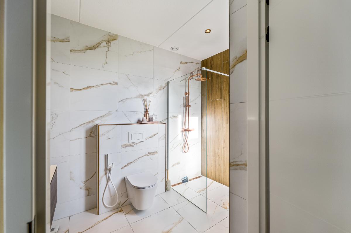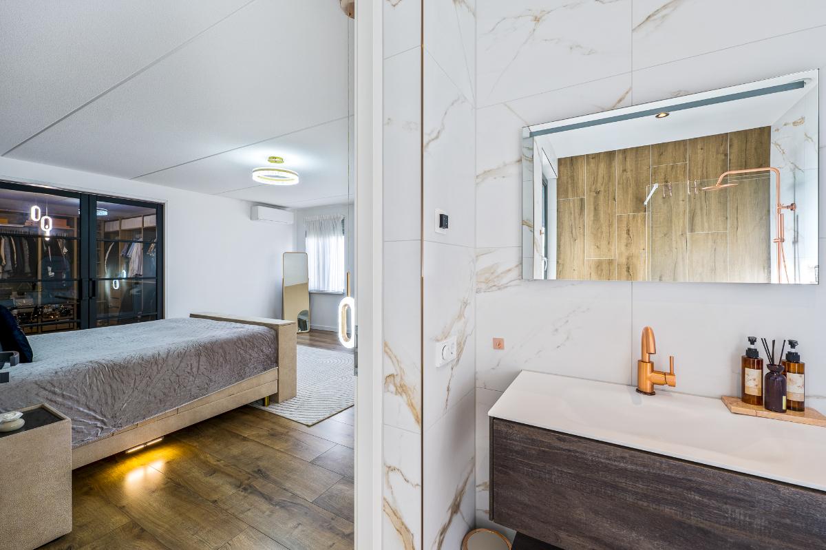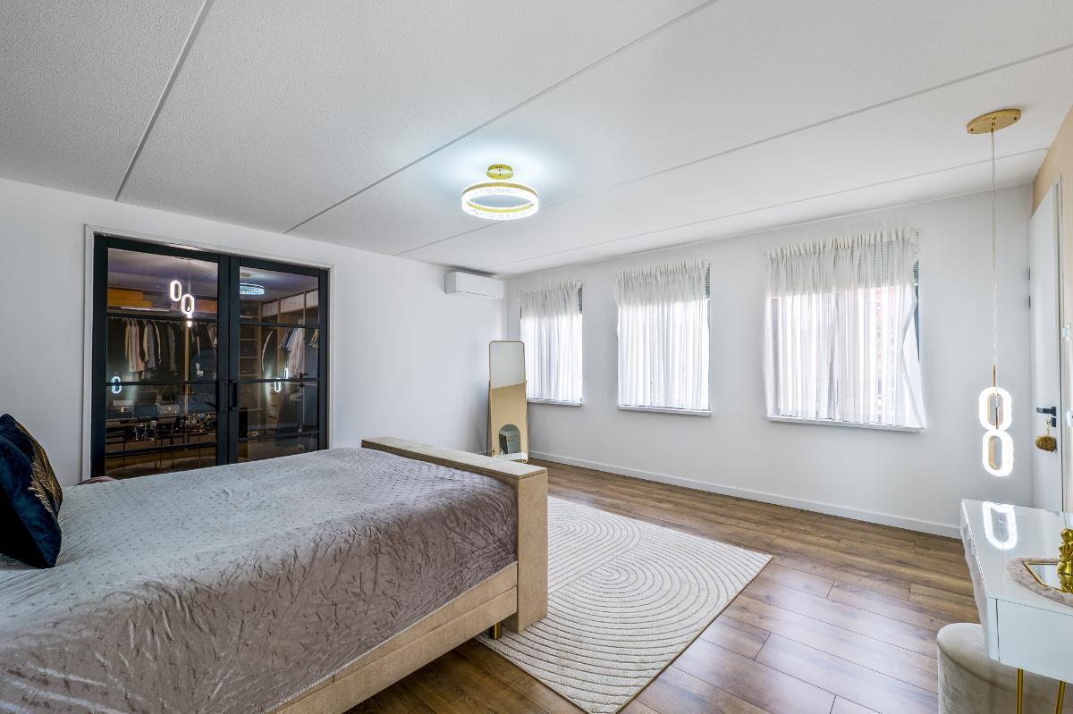 Eerste verdieping: Via het mooie open trappenhuis is de vide bereikbaar. en de open vide is de eerste verdieping bereikbaar. Hier is een ventrale hal-/overloop die uitstekend geschikt is als speelruimte-/ chillruimte voor kinderen. Vanuit deze centrale ruimte zijn de 4 grote slaapkamers bereikbaar. De Master bedroom beschikt over een eigen badkamer met inloopdouche, toilet en wastafelmeubel. De master bedroom heeft tevens een grote inloopkast-garderobe. Op deze verdieping is een tweede badkamer die is voorzien van een inloopdouche, toilet en dubbele wastafelmeubel met fraaie spiegels. Er is een wasruimte met aansluiting was- en droogmachine, opstelplaats boiler en ventilatiebox.