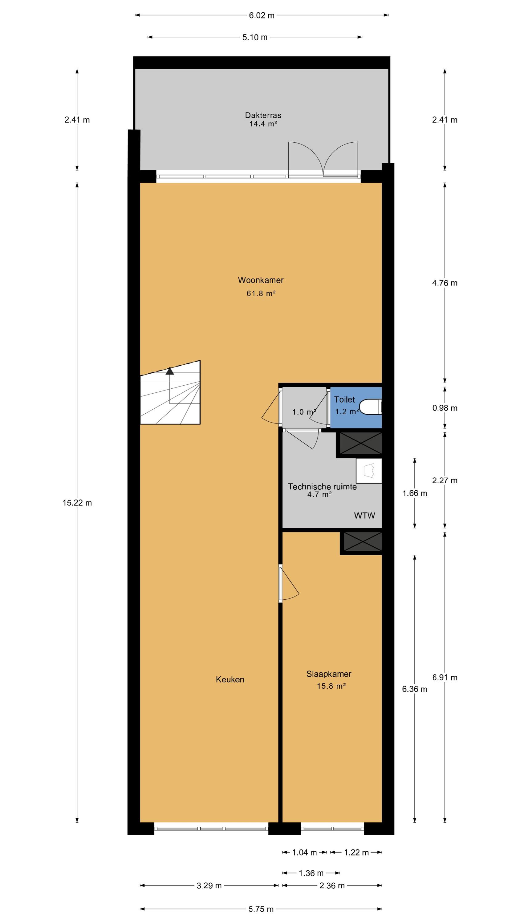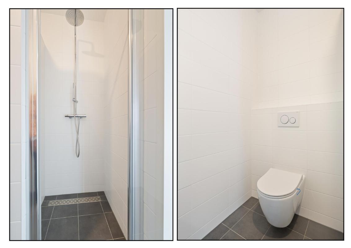 Op de ondergelegen verdieping bevindt zich het woongedeelte. Dit is een heerlijk lichte ruimte met aan de voorkant het zitgedeelte en aan de achterzijde het eetgedeelte met extra kamer. Deze kamer kan eventueel bij de keuken worden getrokken voor een extra grote woonkeuken. De charmante trap breekt de ruimte mooi. De woning heeft een mooie plafondhoogte en alle wanden en plafonds zijn netjes afgestuct. In het midden van deze verdieping bevindt zich nog een hal met toilet en technische ruimte met warmte-terugwin-unit (energiezuinige ventilatie), aansluiting wasmachine en droger en handige bergruimte voor bijvoorbeeld stofzuiger e.d. De zithoek/woonkamer is erg licht en knus dankzij de hoek, ideaal voor een luxe hoekbank. De raampartij is voorzien van elektrische screens. Via de openslaande deuren betreedt men het terras. Het terras heeft vrij uitzicht en is op het westen gesitueerd waardoor je heerlijk kunt genieten van de middagzon tot ondergaande zon. Het terras is voorzien van buitenverlichting, stroompunten en plantenbakken van Cortenstaal.