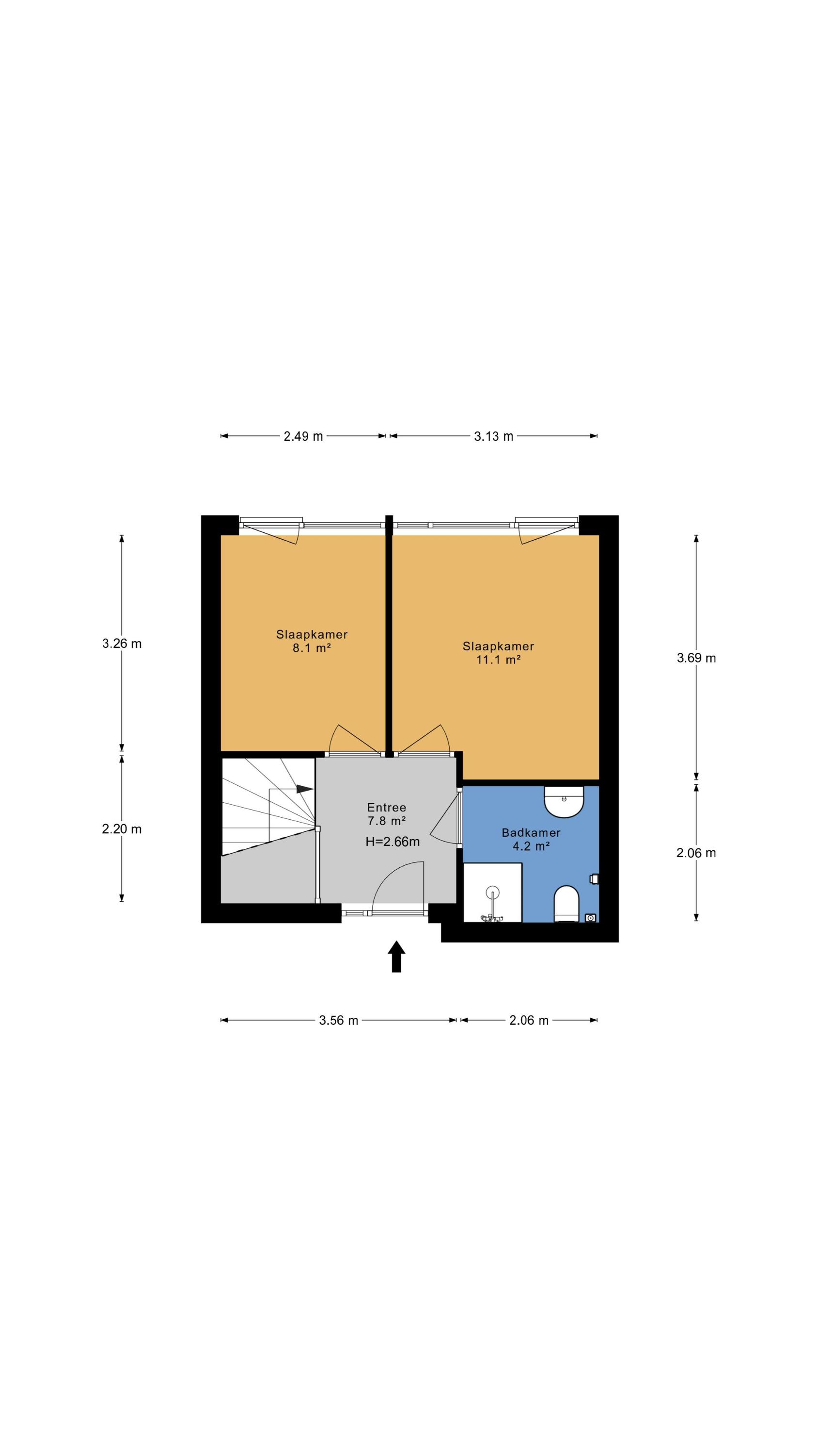 Entree van het appartement op de tweede verdieping: Meterkast op de algemene hal, entree, de hal geeft toegang tot 2 slaapkamers en de badkamer. De badkamer is voorzien van een inloopdouche, wastafel met meubel en toilet. Via de trap bereikt men de ondergelegen verdieping.