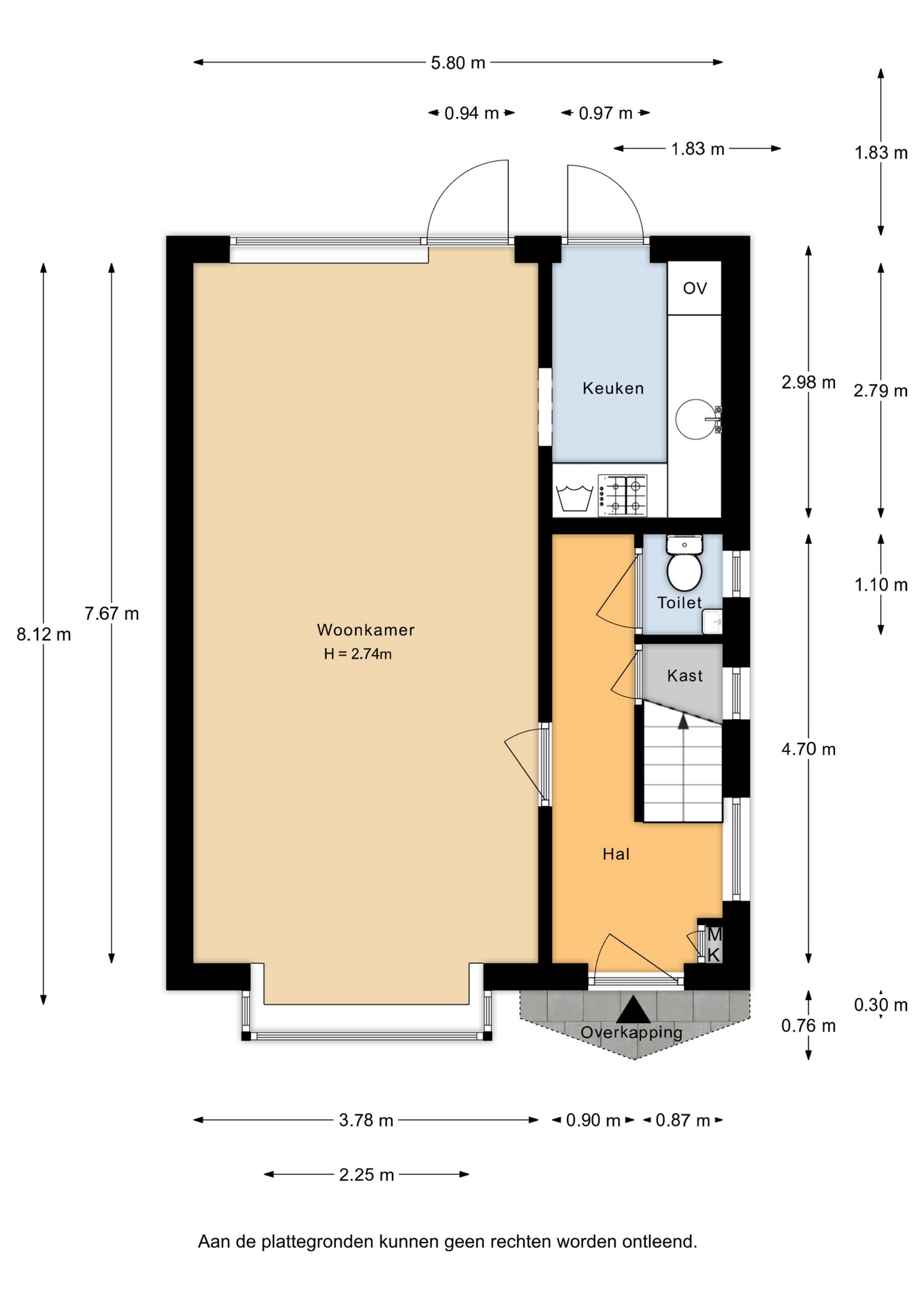 Indeling Begane grond Entree/hal met toiletruimte en fonteintje, trapkast en toegang tot de woonkamer. De woonkamer is voorzien van een parketvloer en spachtelputz wandafwerking en kent een prettige lichtinval. Aansluitend bevindt zich de eenvoudige keuken met koelkast, kookplaat (4 gaspitten) en wasmachineaansluiting. Vanuit de keuken is er directe toegang tot de royale achtertuin.