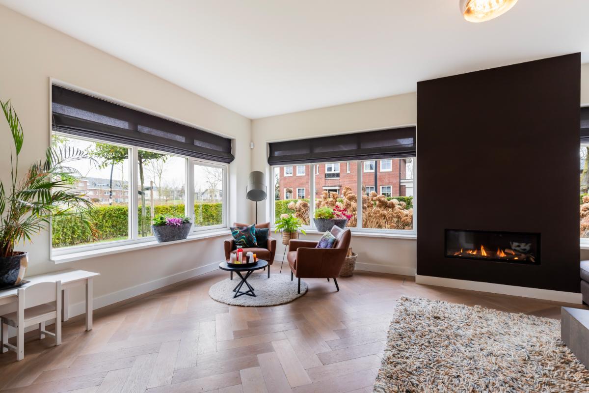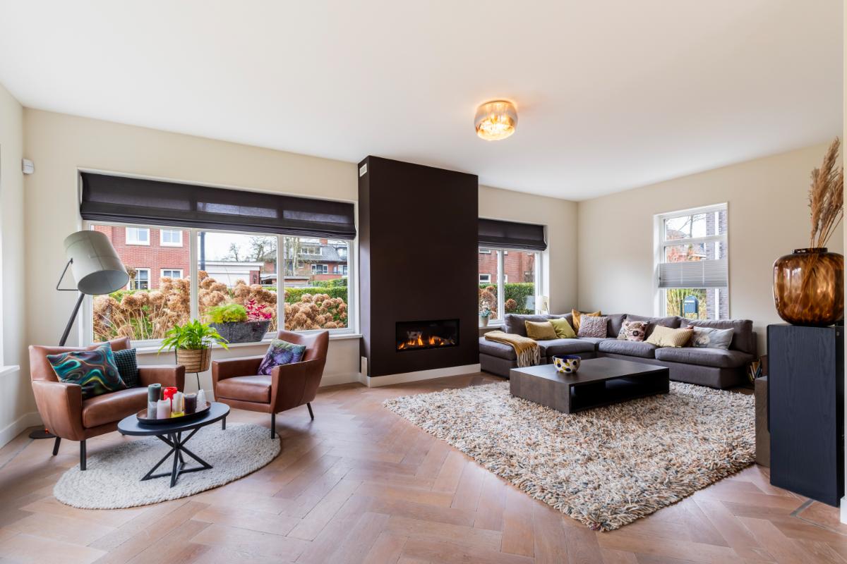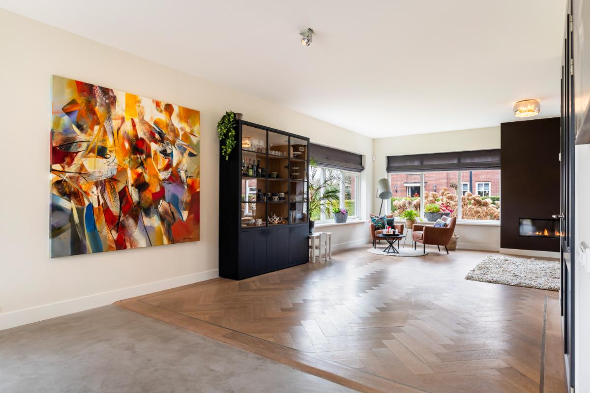 Begane grond: via de overdekte zijentree betreedt u de woning. De zeer ruime hal is afgewerkt met een stijlvolle Belgisch hardstenen vloer en biedt toegang tot een verzorgde toiletruimte met wandcloset, meterkast, alarminstallatie en trapopgang met ruime trapkast en tweede garderobe. Dubbele deuren geven toegang tot de zeer royale living, waar direct de ruimte en het licht opvallen. De L-vormige zithoek met gashaard vormt een warme en sfeervolle plek, terwijl de ramen rondom zorgen voor een prachtige lichtinval. Het robuuste eiken visgraatparket geeft de ruimte een tijdloze, luxe uitstraling. De begane grond is grotendeels voorzien van elektrische zonwering (screens).