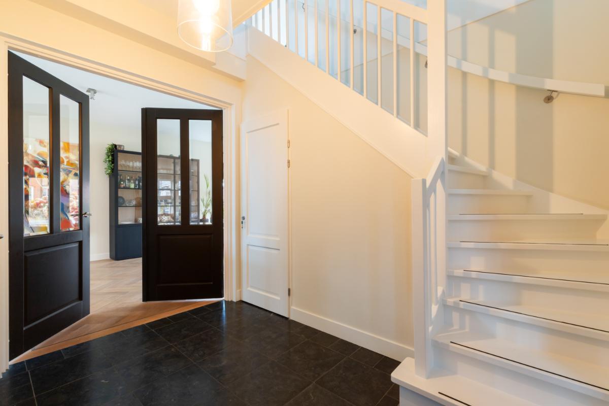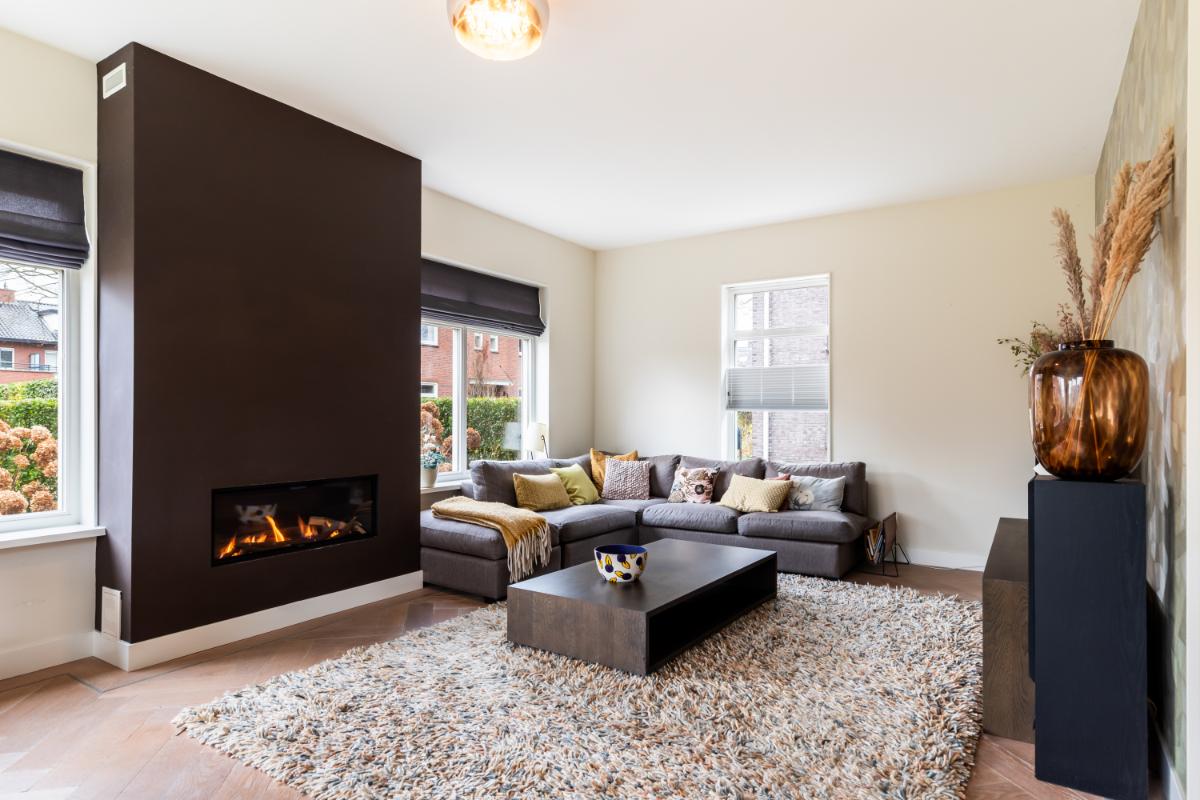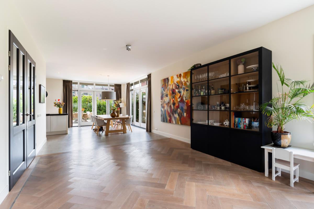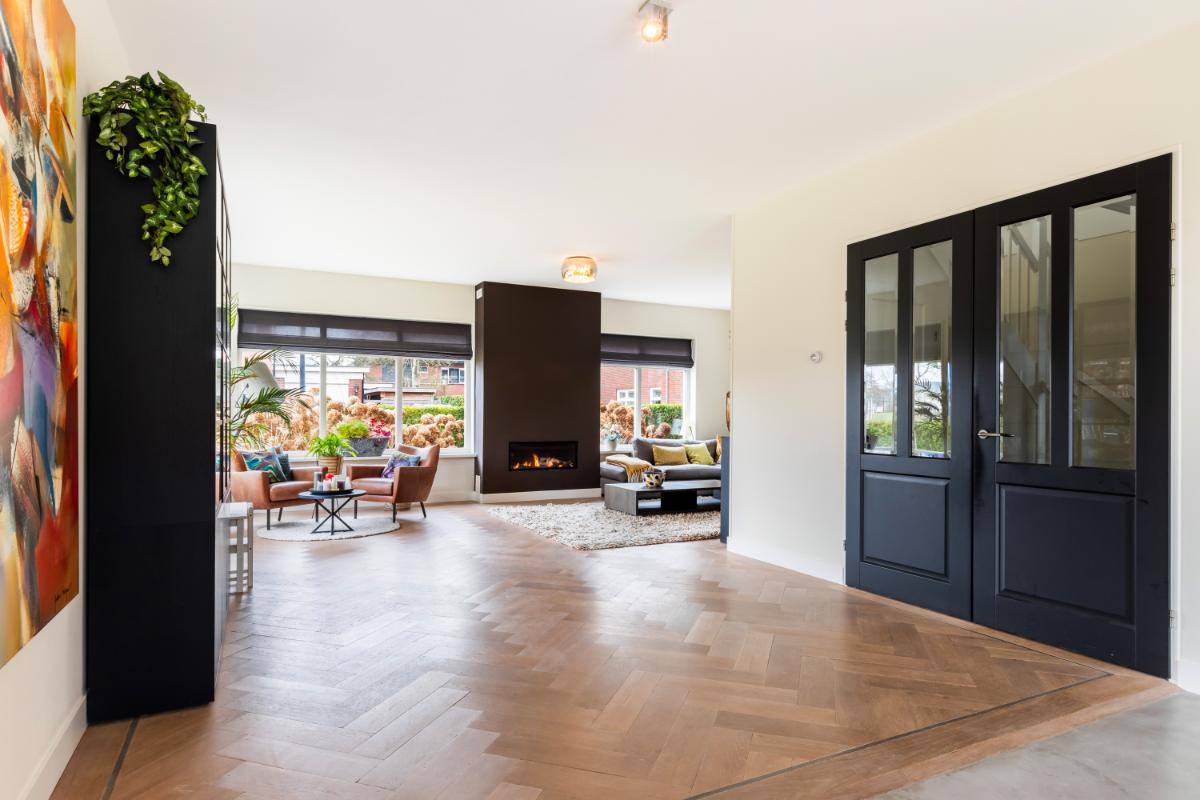 Begane grond: via de overdekte zijentree betreedt u de woning. De zeer ruime hal is afgewerkt met een stijlvolle Belgisch hardstenen vloer en biedt toegang tot een verzorgde toiletruimte met wandcloset, meterkast, alarminstallatie en trapopgang met ruime trapkast en tweede garderobe. Dubbele deuren geven toegang tot de zeer royale living, waar direct de ruimte en het licht opvallen. De L-vormige zithoek met gashaard vormt een warme en sfeervolle plek, terwijl de ramen rondom zorgen voor een prachtige lichtinval. Het robuuste eiken visgraatparket geeft de ruimte een tijdloze, luxe uitstraling. De begane grond is grotendeels voorzien van elektrische zonwering (screens).