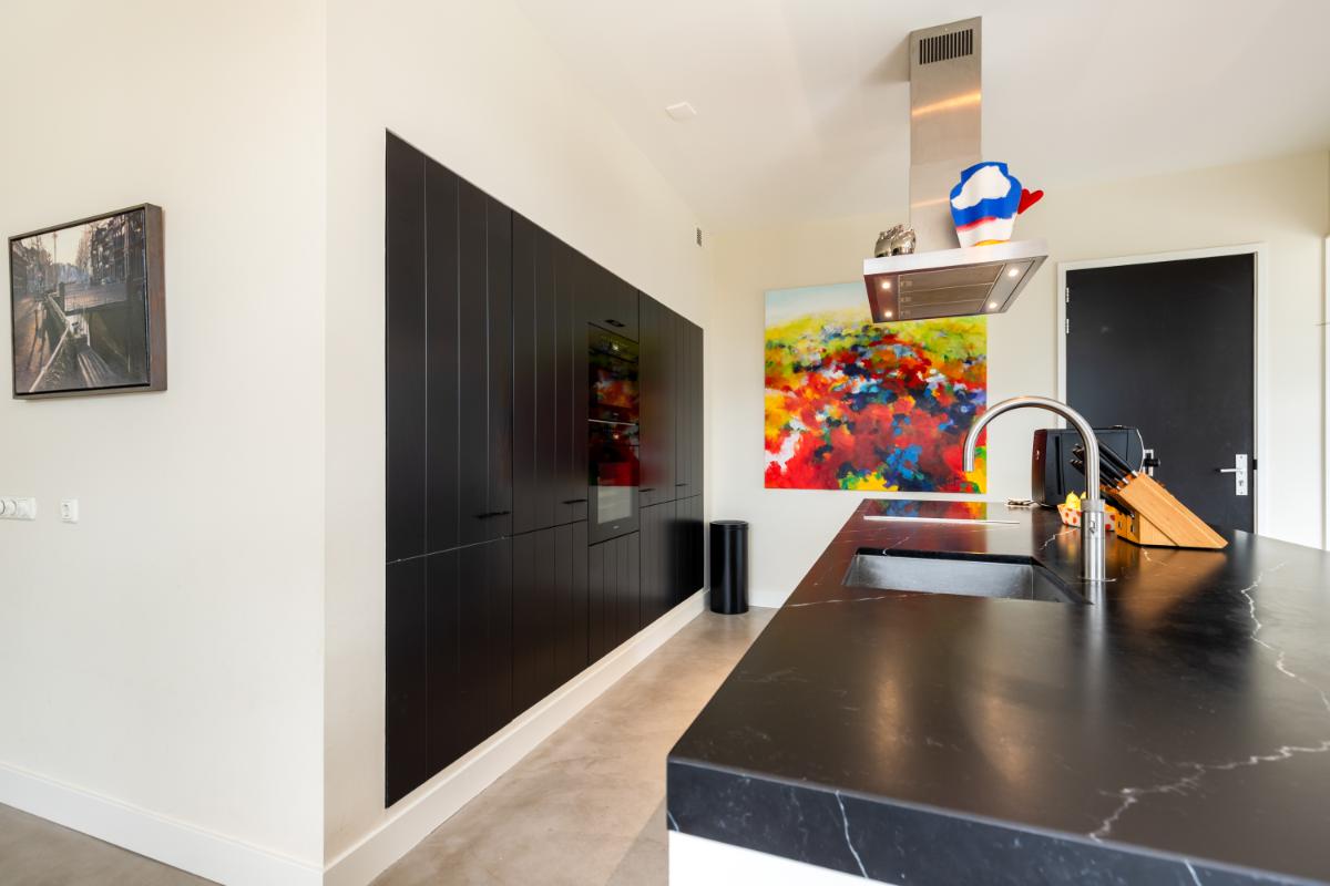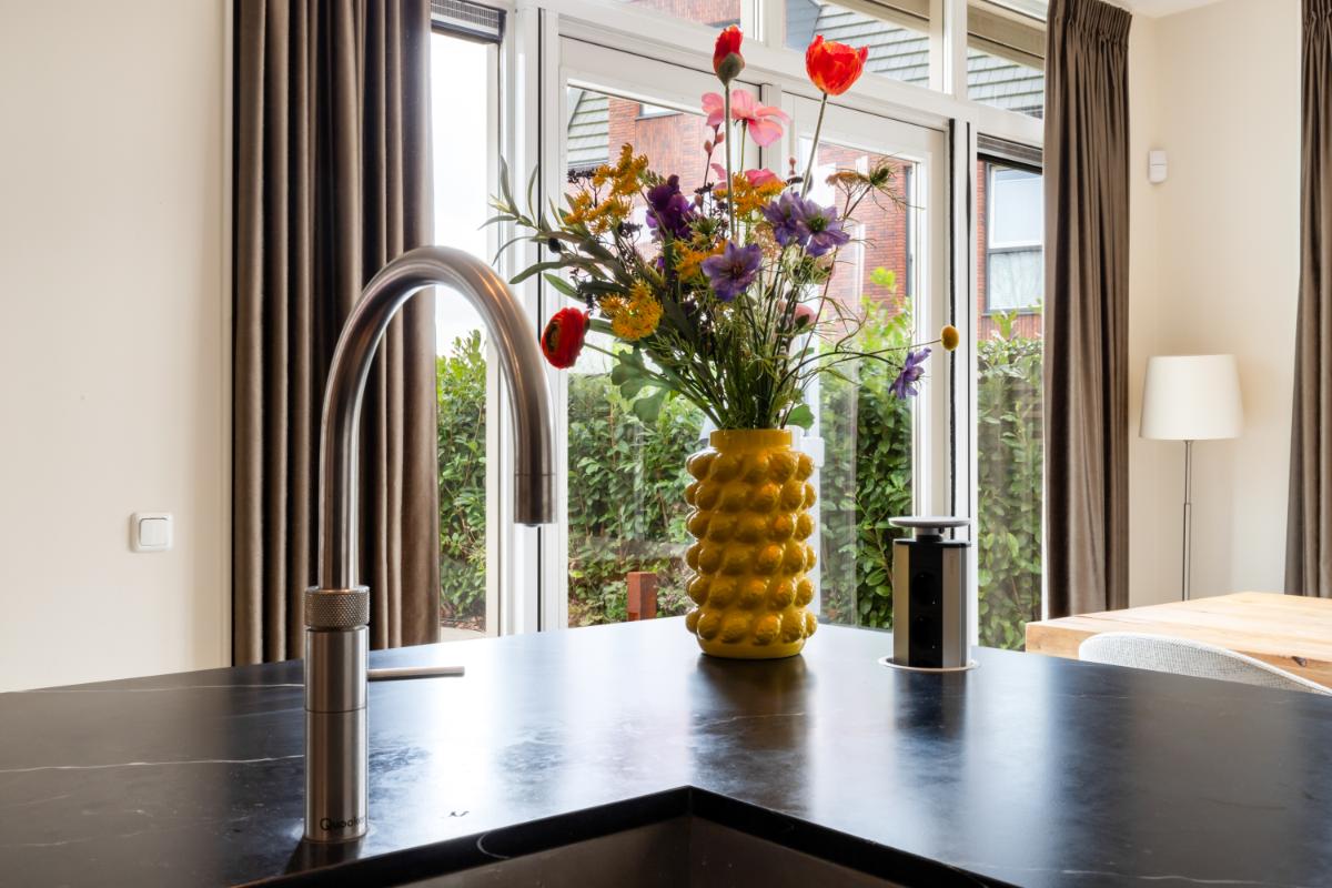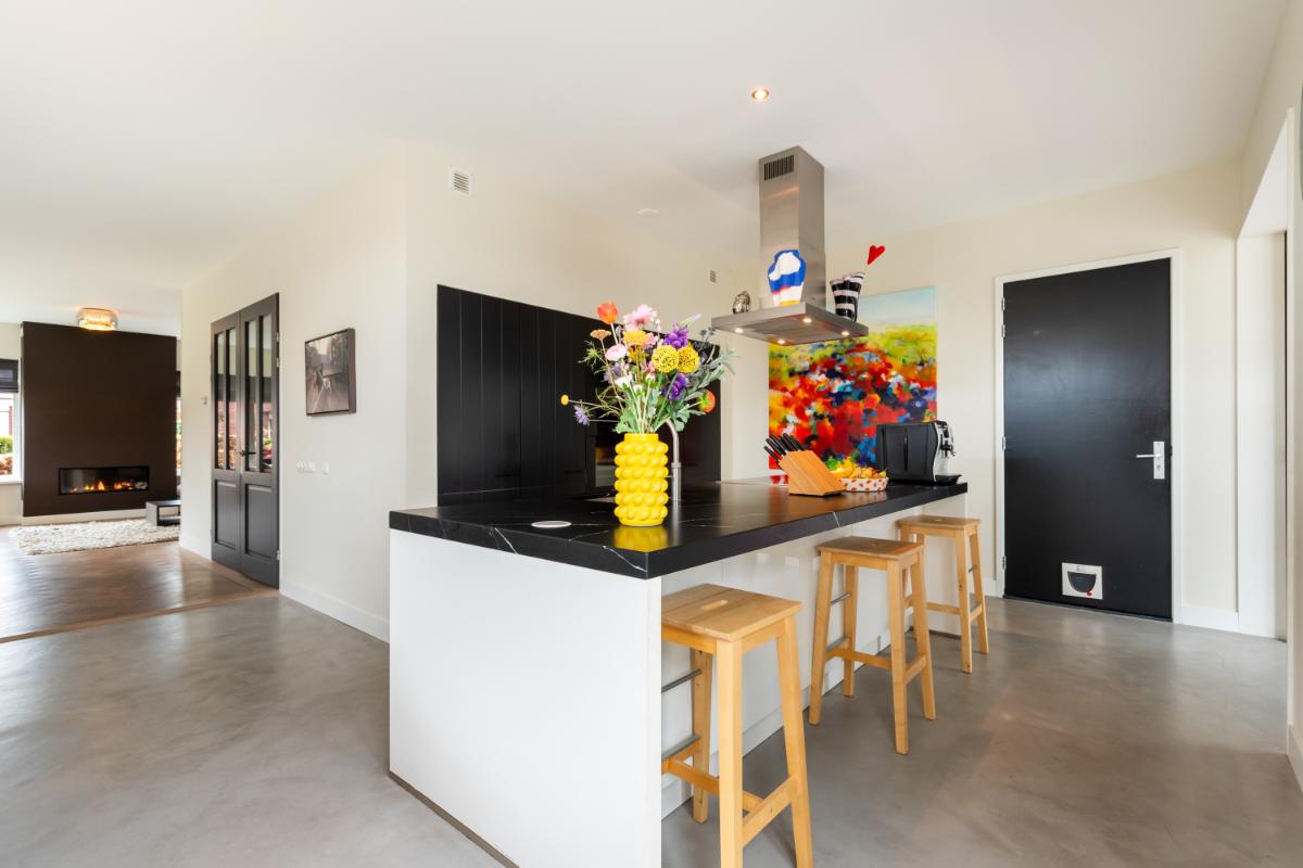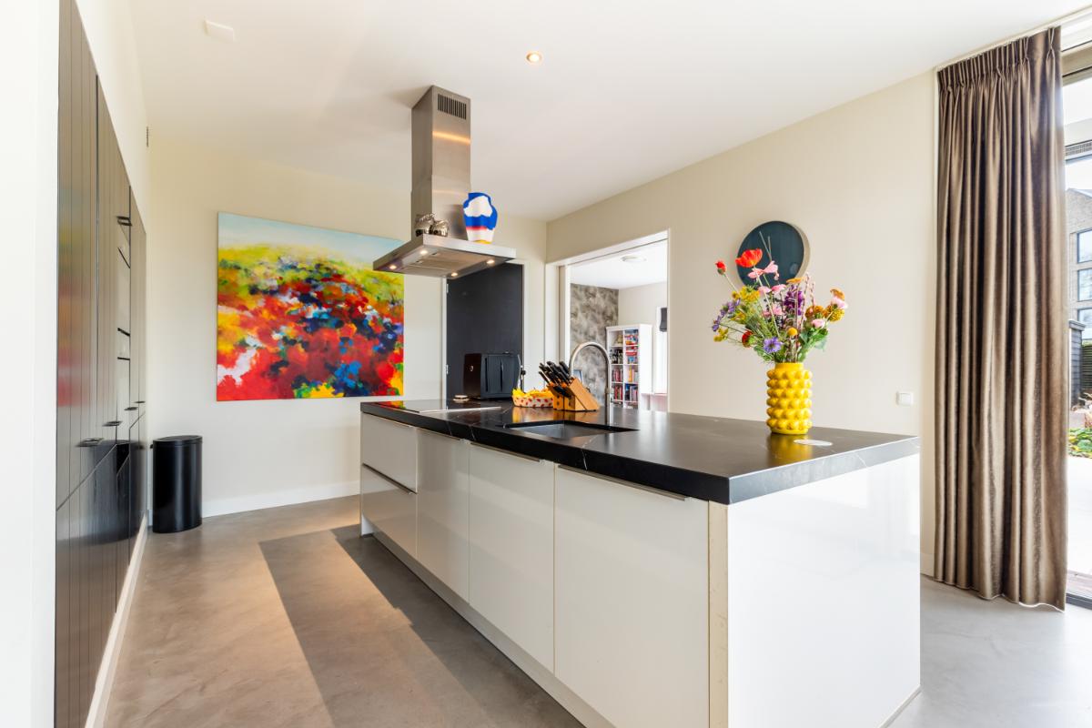 De tuingerichte woonkeuken is een echte leefkeuken. De trendy betonlook-vloer, openslaande tuindeuren naar zowel het oosten als het zuiden en de luxe Steinhaus-keuken maken dit tot het hart van de woning. Het kookeiland met inductiekookplaat, Quooker en geïntegreerde vaatwasser wordt aangevuld met een eiken kastenwand waarin de overige inbouwapparatuur is verwerkt, waaronder een extra grote koelkast en Miele (stoom en combi)ovens. Koken, tafelen en samenzijn gaan hier moeiteloos samen.