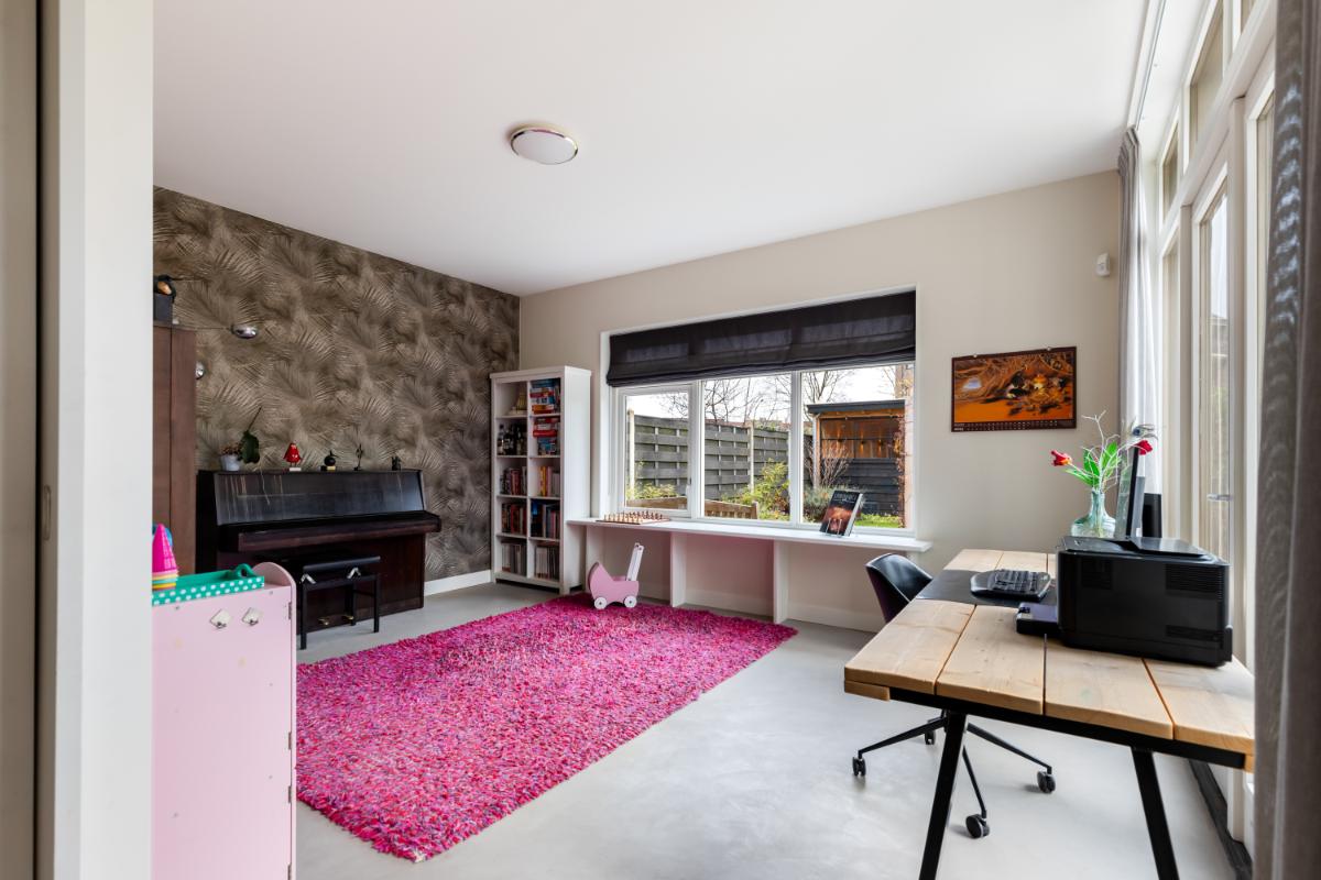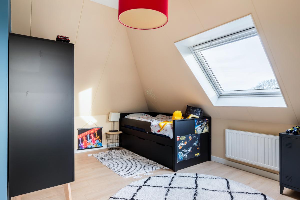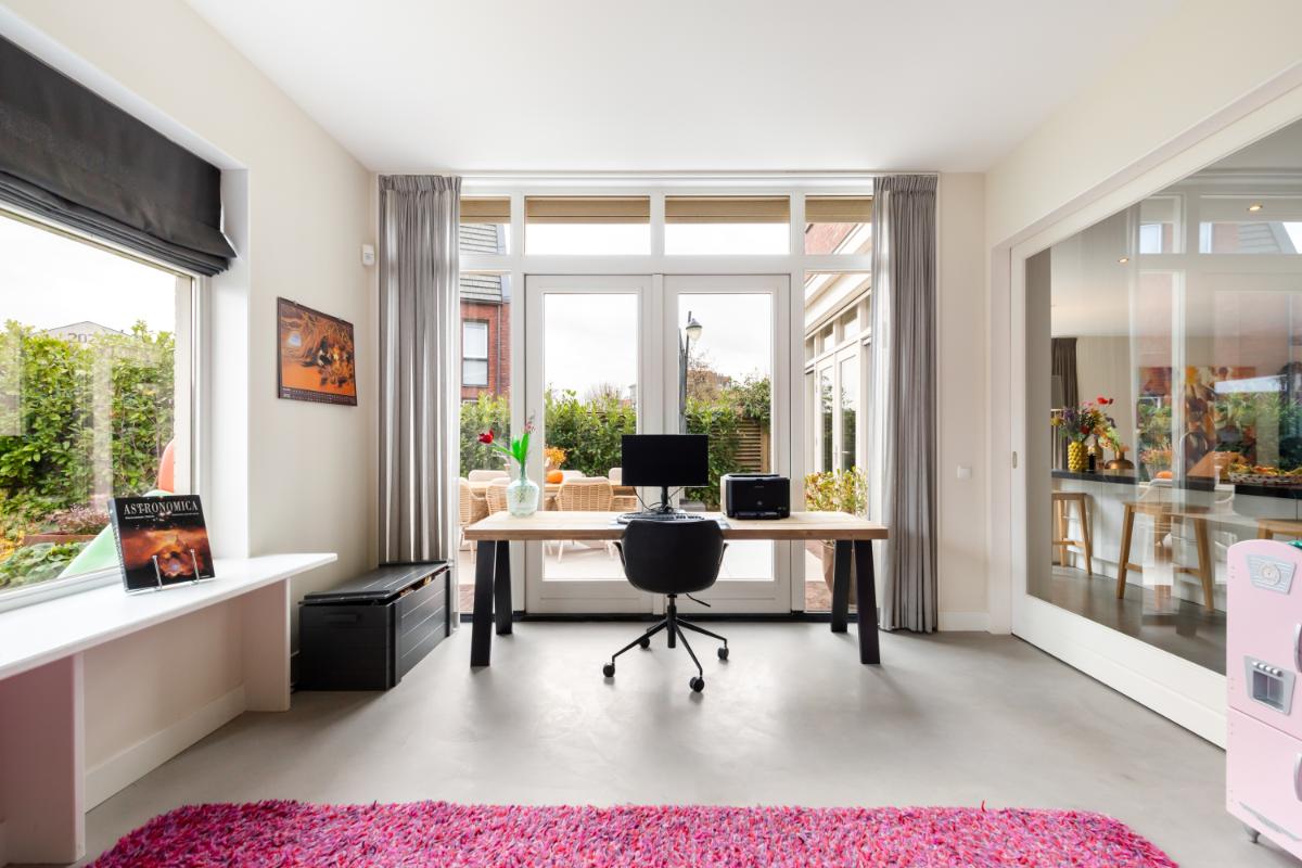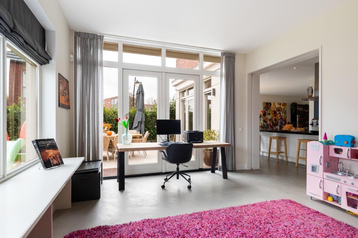 De gehele begane grond is voorzien van vloerverwarming en heeft een plafondhoogte van maar liefst 2,9 meter, wat het ruimtelijke gevoel extra versterkt. Vanuit de keuken is de volledig geïsoleerde garage bereikbaar, voorzien van dubbele deuren. Daarnaast staat de keuken via een brede schuifdeur in open verbinding met de grote tuinkamer: een heerlijke extra leefruimte met betonlook-vloer, veel daglicht en openslaande deuren naar het terras. Ideaal als tweede zithoek, speelkamer of plek om gasten te ontvangen.