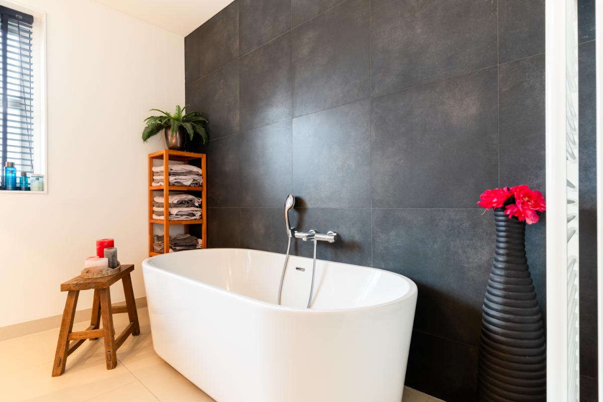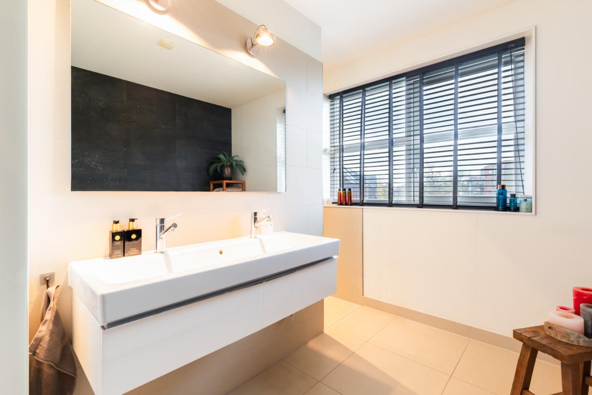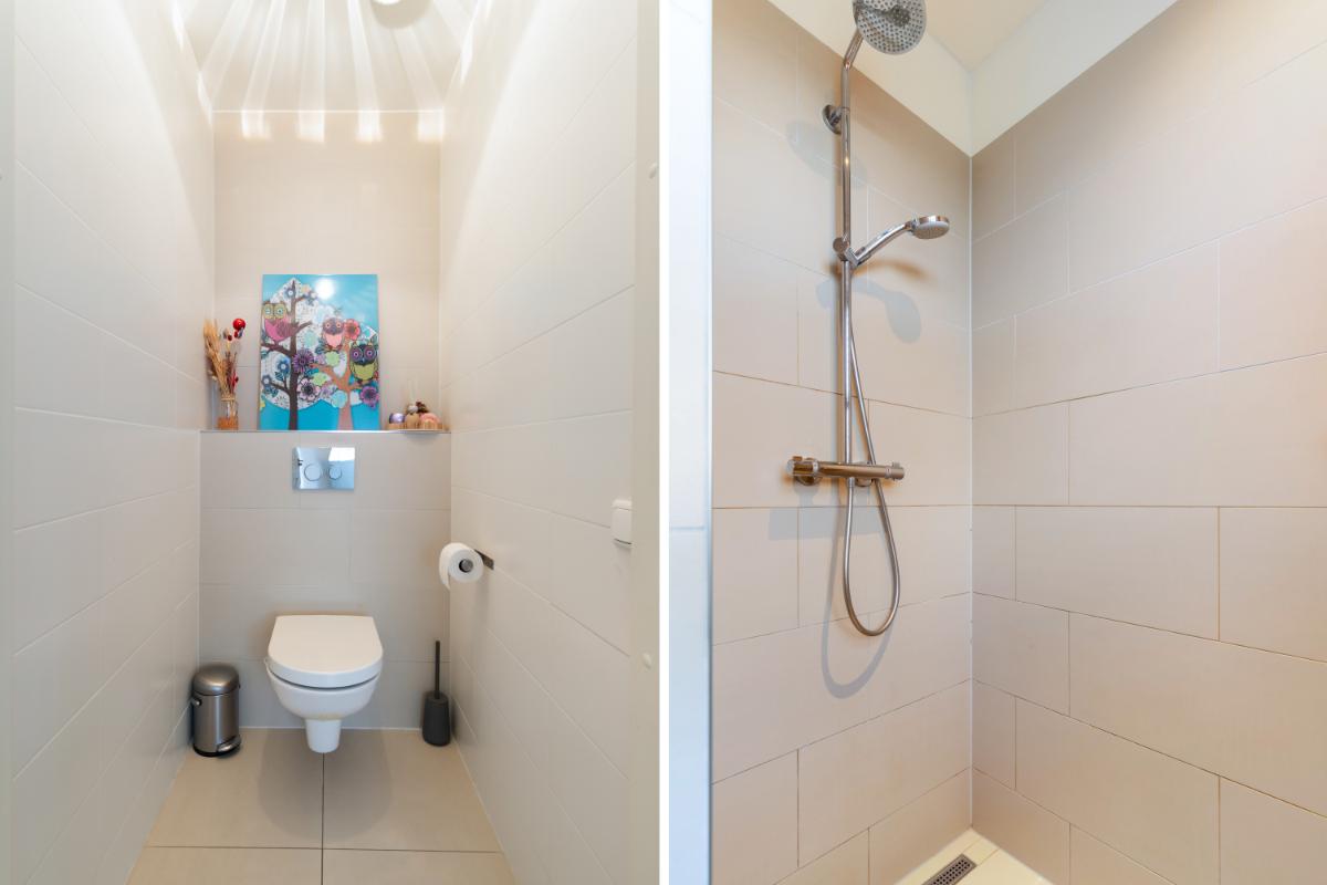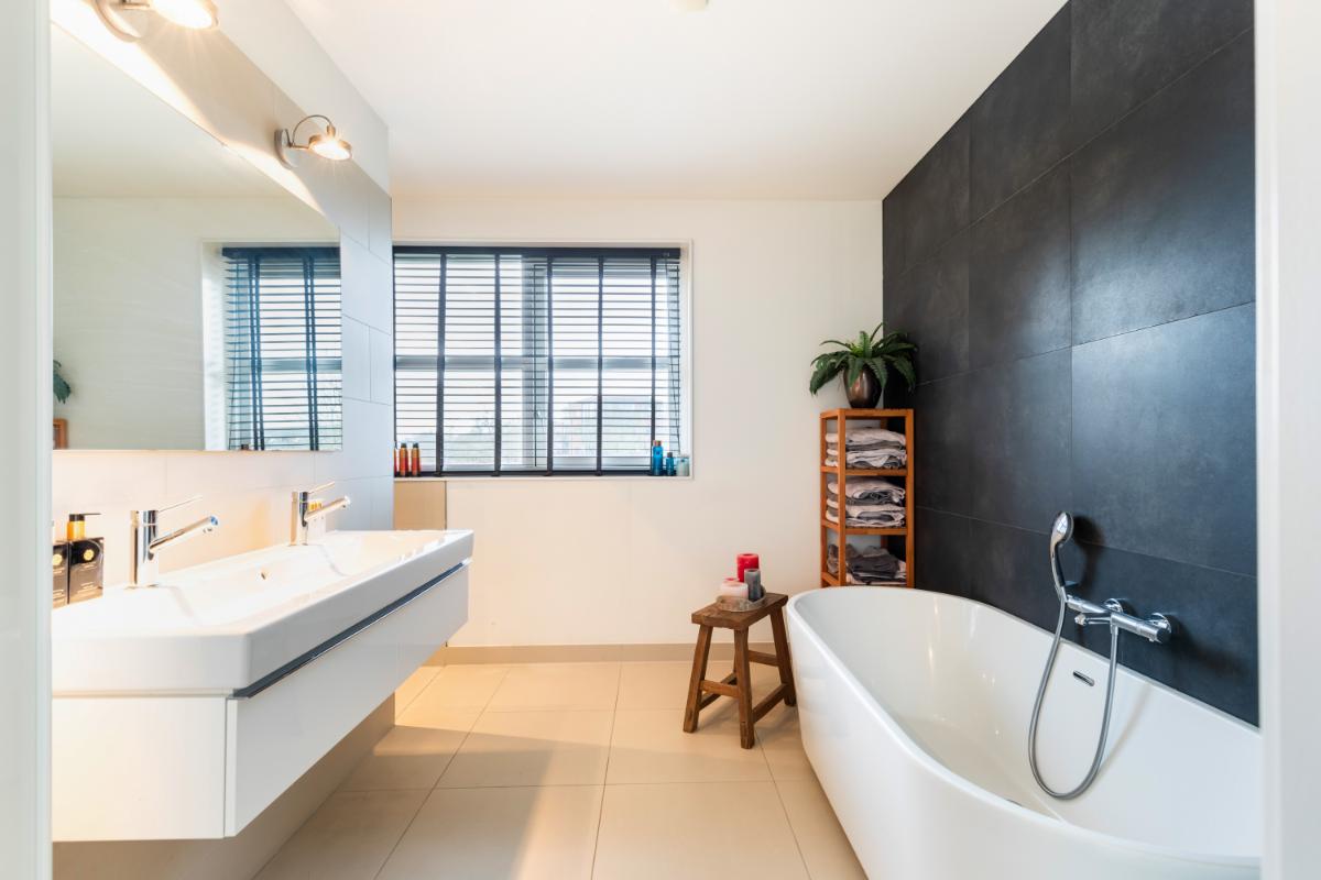 De luxe badkamer is royaal opgezet en voorzien van een vrijstaand bad, een inloopdouche met regendouche, en een dubbele wastafel met meubel. De combinatie van moderne materialen en een rustige uitstraling maakt dit een fijne plek om de dag te beginnen of juist af te sluiten. Daarnaast is er nog een separate toiletruimte aanwezig.