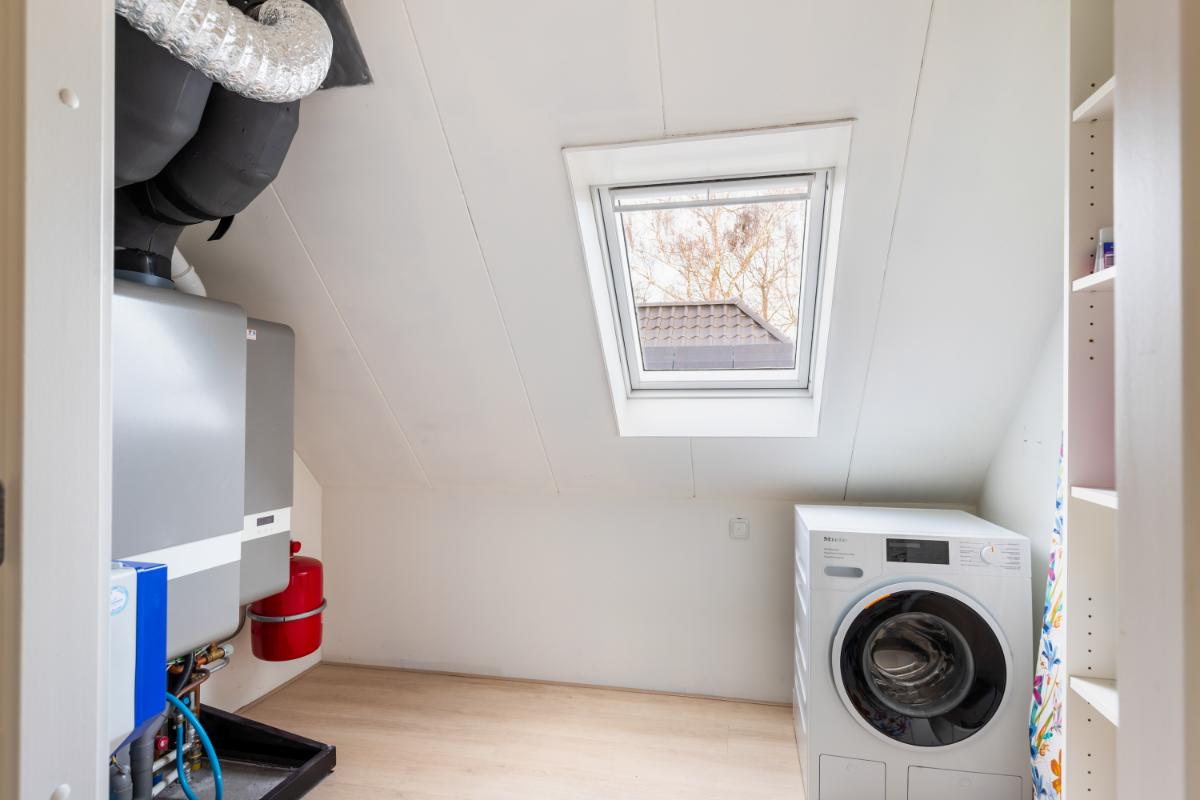 Verder vindt u hier een aparte waskamer met Veluxraam, warmtepomp, CV-combiketel en de mechanische ventilatie-box. Een separate inloopberging en een vlizotrap naar de ruime bergvliering voor extra praktische bergruimte.