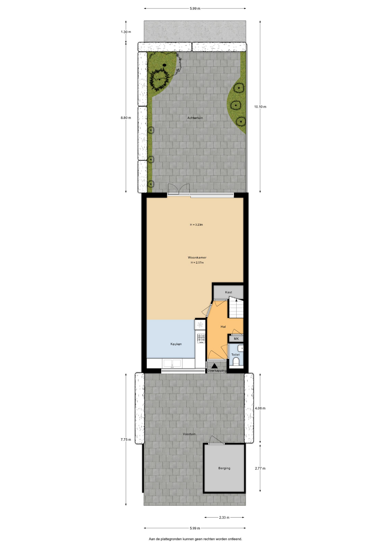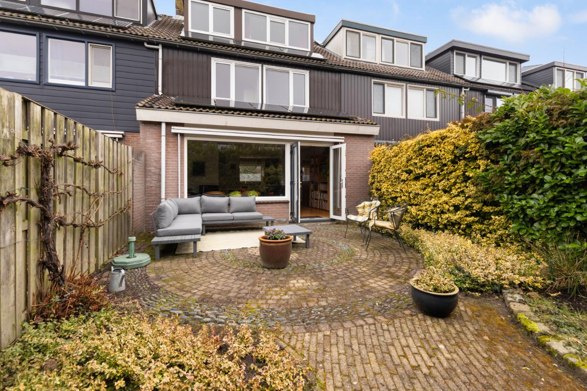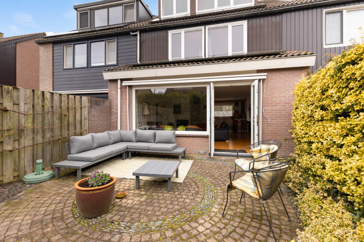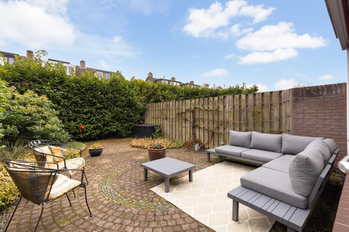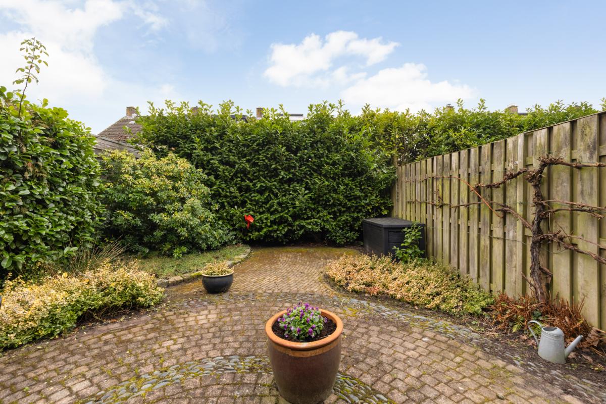 Via de woonkamer is de achtertuin bereikbaar. De tuin ligt op het zuiden, waardoor je hier de hele dag van de zon kunt genieten. Het uitvalscherm biedt op warme dagen aangename schaduw en maakt het buitenleven extra comfortabel. De tuin heeft diverse borders, groene afscheiding en een groot terras. Aan de voorzijde van de woning bevindt zich een vrijstaande stenen berging en is er de mogelijkheid om op eigen terrein te parkeren.