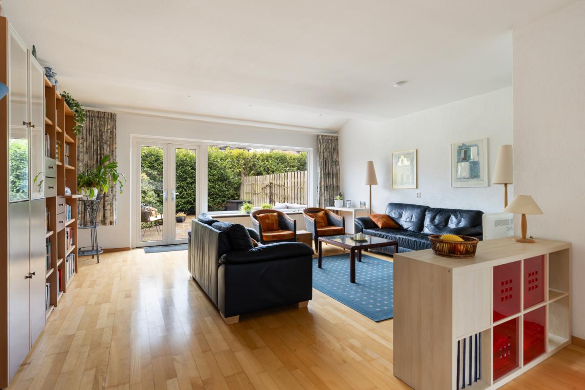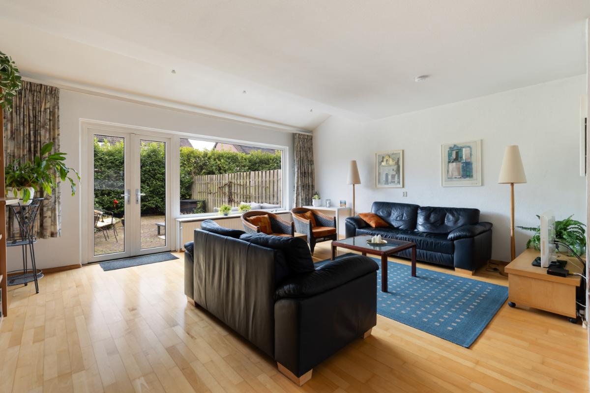 INDELING Begane grond: via de entree kom je binnen in de hal met meterkast, toiletruimte, trapopgang en praktische trapkast. Vanuit hier loop je door naar de tuingerichte en uitgebouwde woonkamer. De woonkamer heeft door de grote raampartijen en openslaande deuren een prettige lichtinval. De neutrale kleurstelling en verzorgde afwerking zorgen voor een rustige basis die gemakkelijk naar eigen smaak in te richten is. Dankzij de uitbouw van circa 12 m² is er ruimte voor zowel een royale zithoek als een gezellige eethoek.