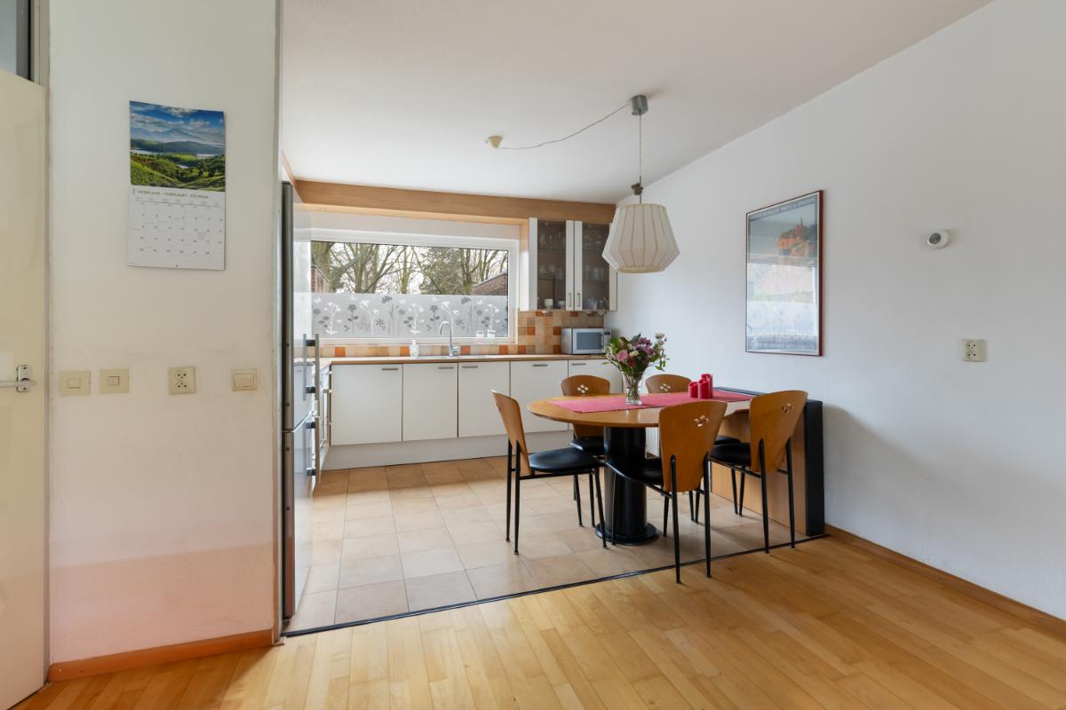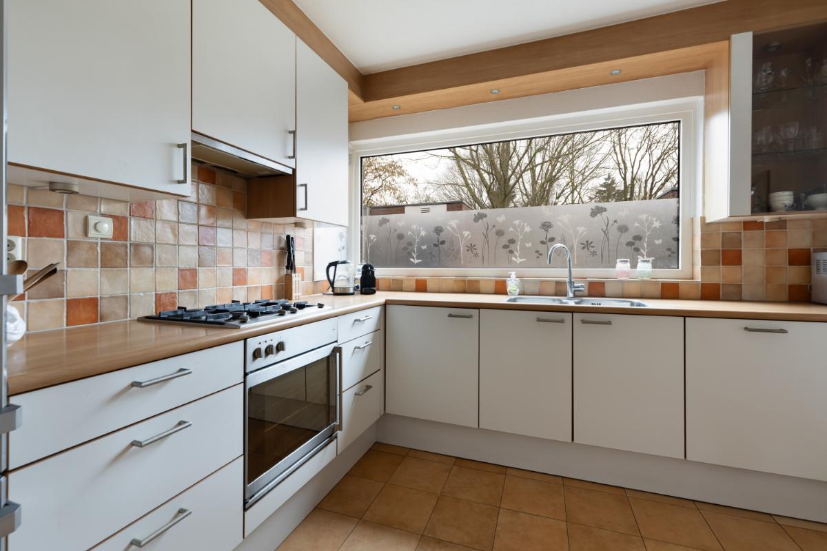 De lichte keuken aan de voorzijde is opgesteld in een hoekopstelling en voorzien van inbouwapparatuur, waaronder een vaatwasser, oven en gaskookplaat. Daarnaast is er ruimte voor een losse koelkast met vriezer. De keuken heeft een neutrale kleurstelling en voldoende werk- en bergruimte.