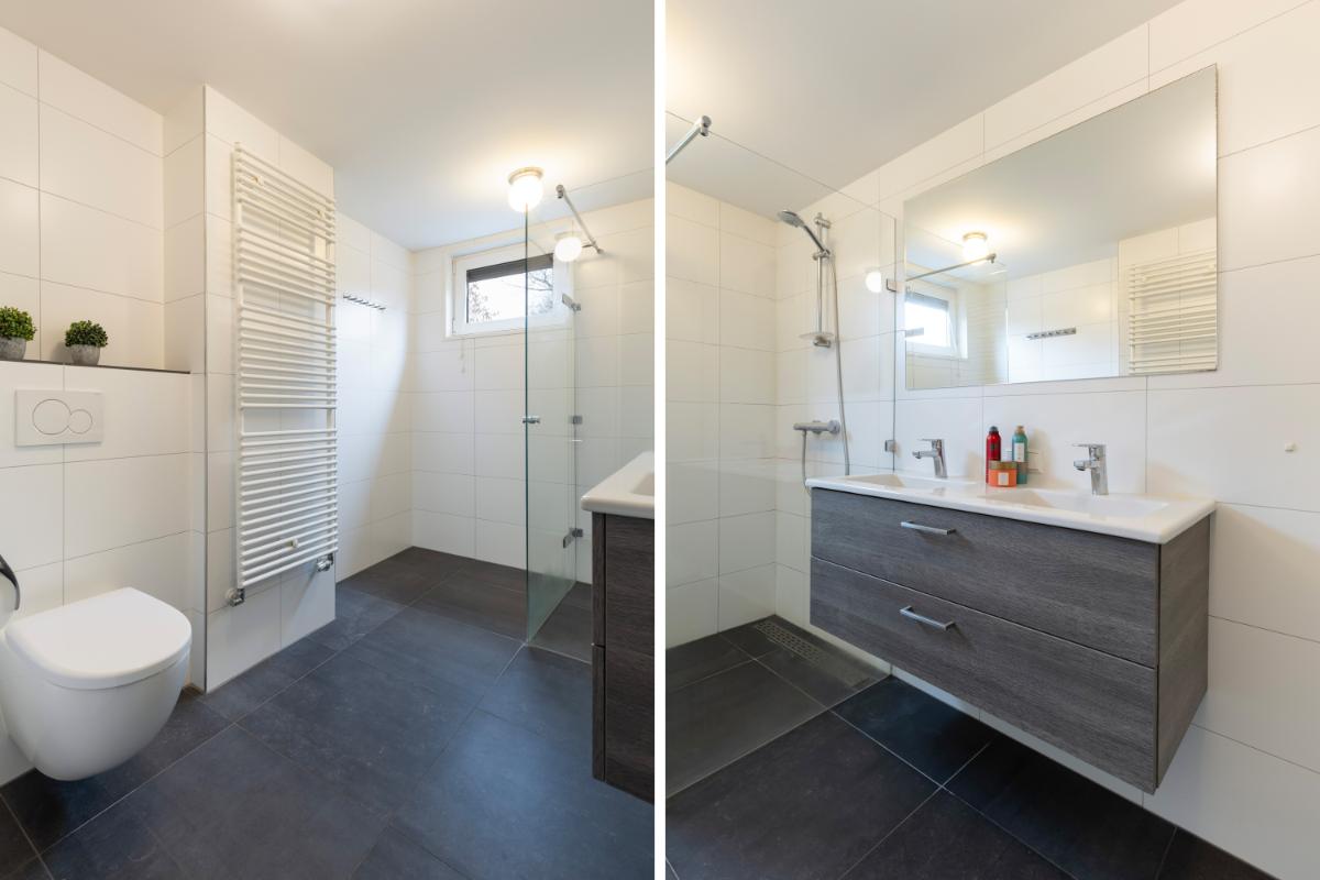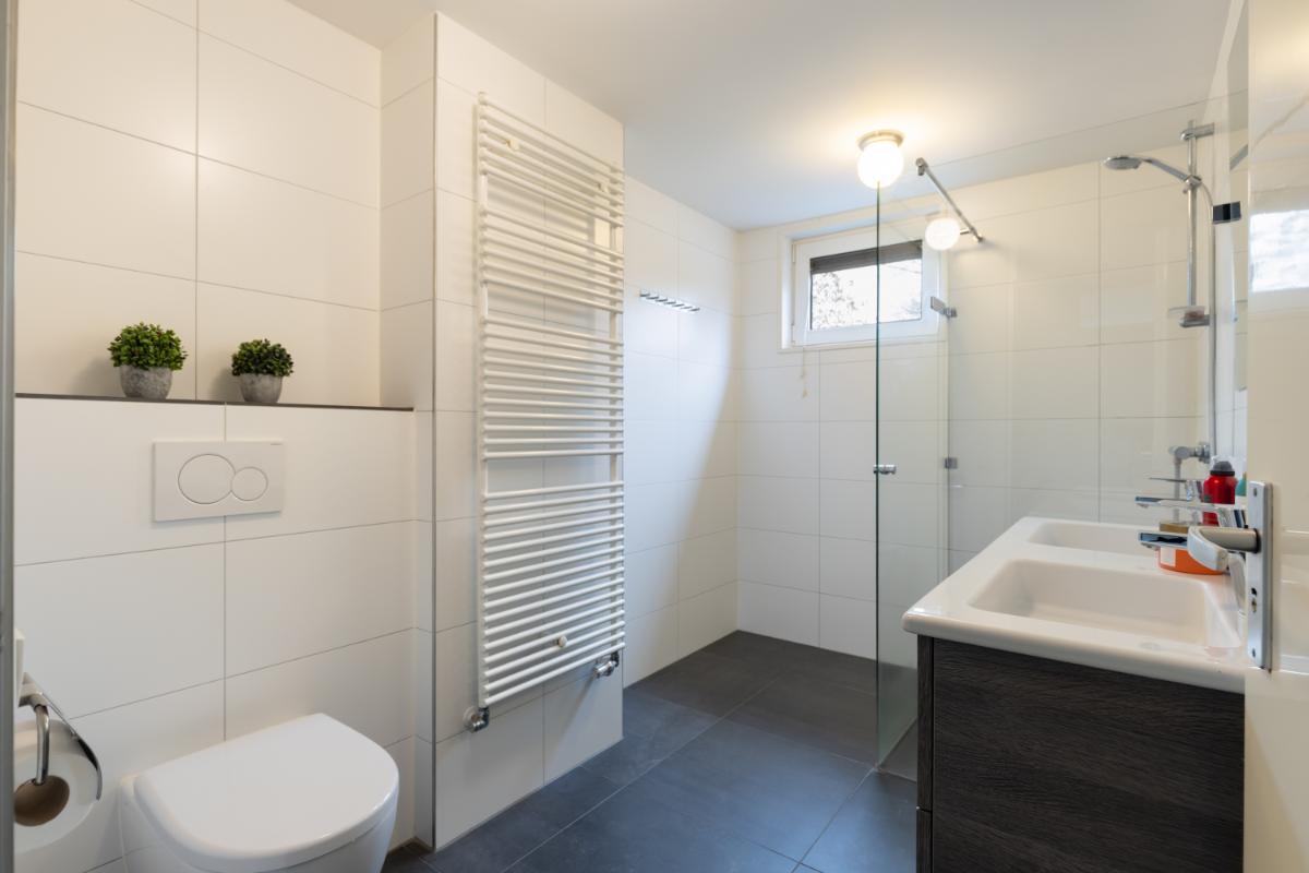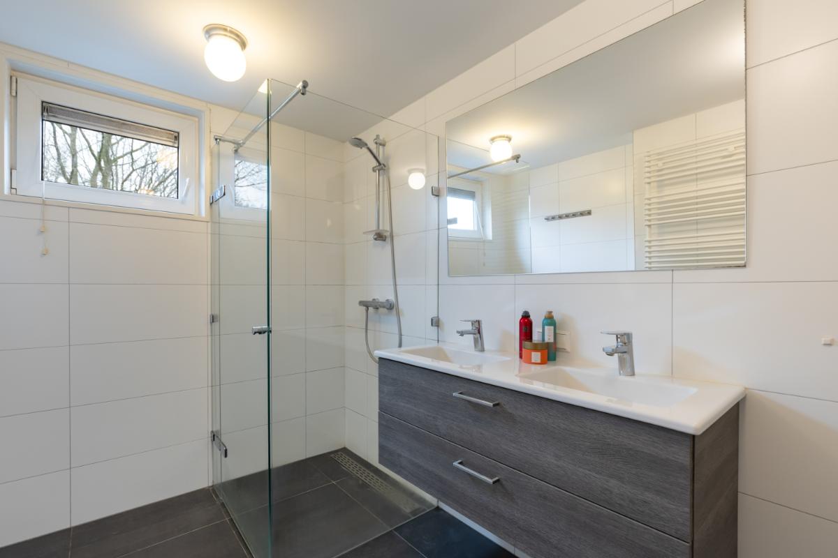 Eerste verdieping: de overloop geeft toegang tot drie ruime slaapkamers en de badkamer. Twee slaapkamers bevinden zich aan de achterzijde en profiteren van een fijne lichtinval en een rustige ligging. De slaapkamer aan de voorzijde beschikt over een praktische inbouwkast. De moderne badkamer is verzorgd uitgevoerd en voorzien van een dubbele wastafel met meubel, een douche met glazen wanden en een toilet. De afwerking is strak en tijdloos, waardoor de ruimte direct een frisse en comfortabele indruk geeft.