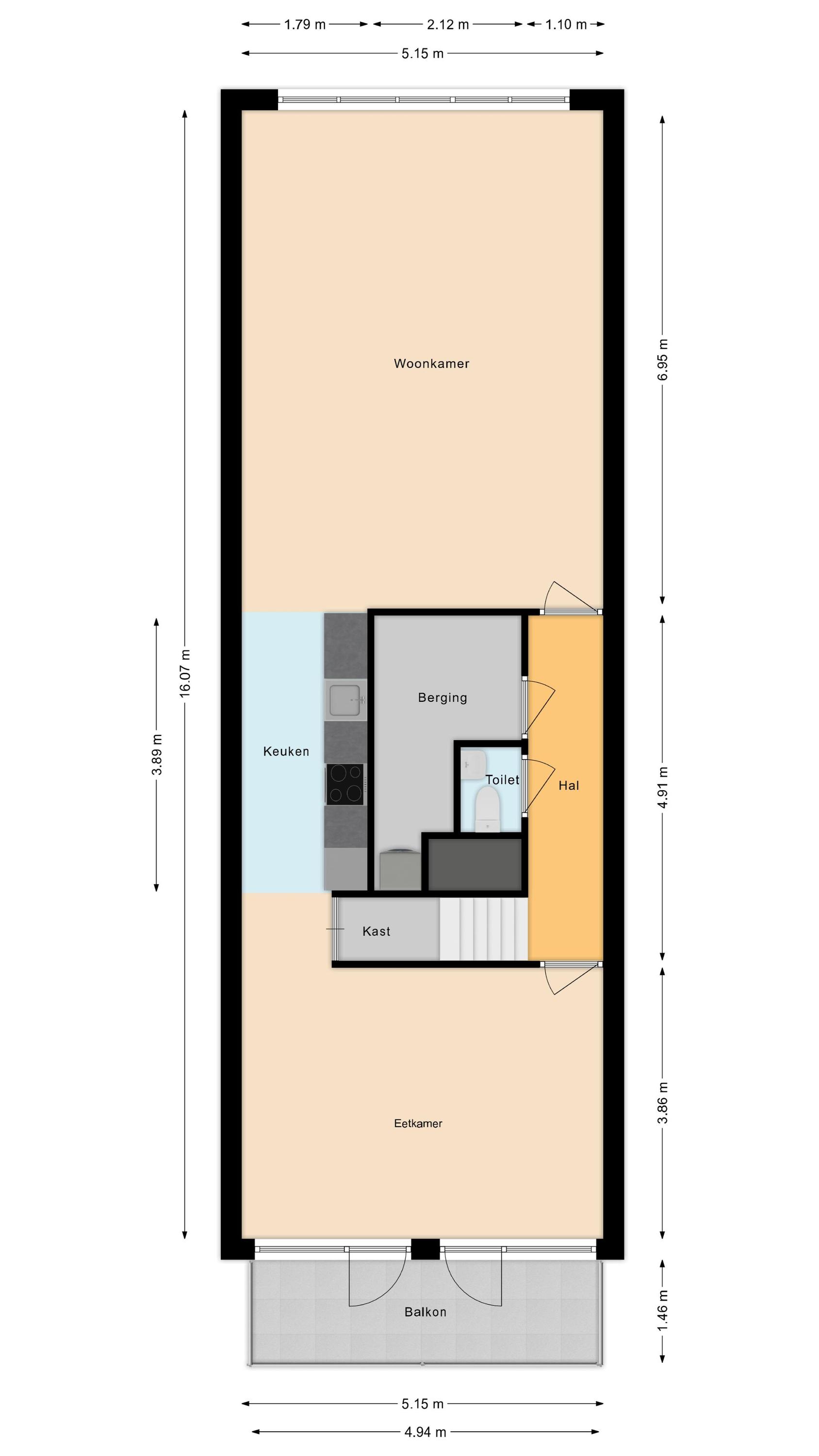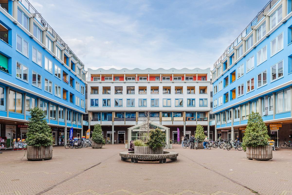 Via dubbele deuren stap je het balkon op (oostzijde), met uitzicht op het gezellige binnenplein van het winkelcentrum.