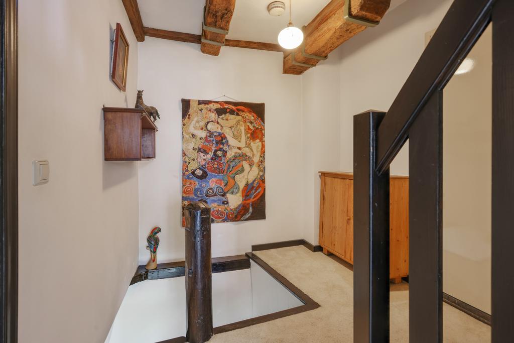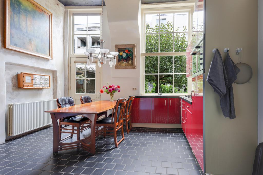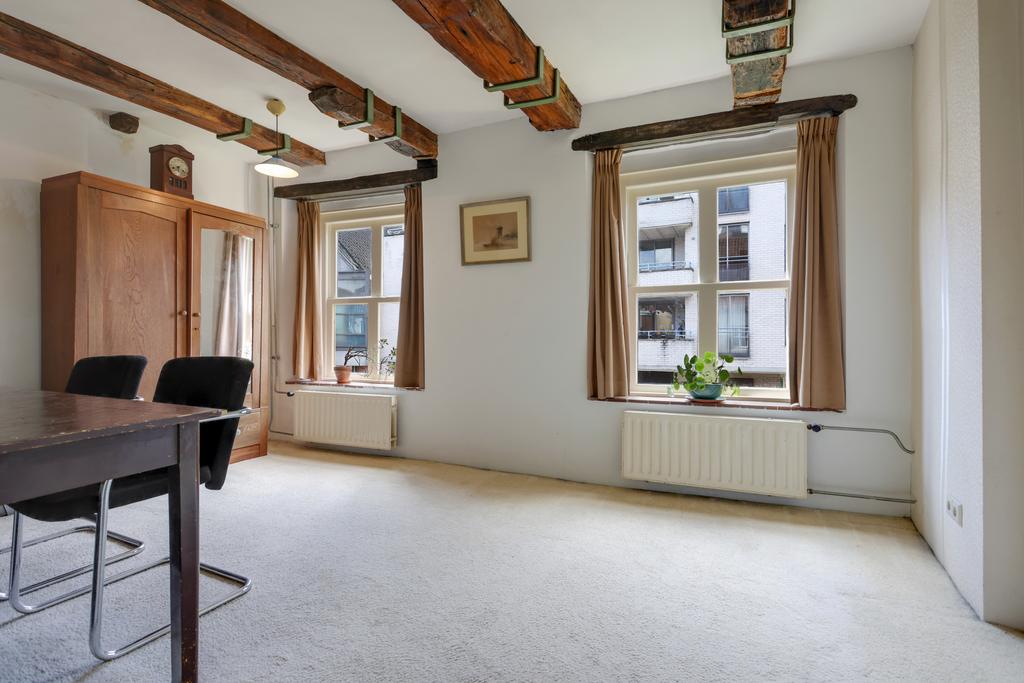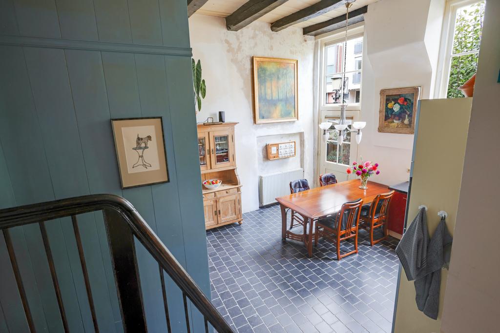 Begane grond: ruime woonkeuken, ook voorzien van vloerverwarming. Opstap via spiltrap naar woonkamer met uitzicht op de Zwanenhalssteeg, monumentale trapgevel en deel van de Onze Lieve Vrouwetoren. De schoorsteen, uitkomend in de woonkamer, is (na inspectie) operationeel voor open haard of houtkachel.