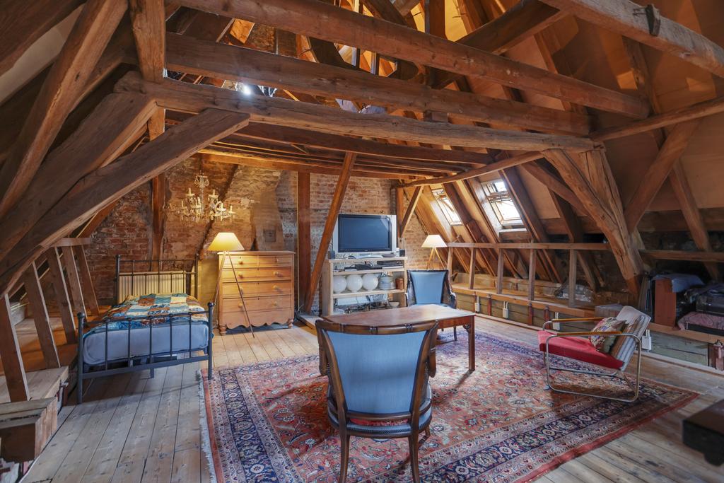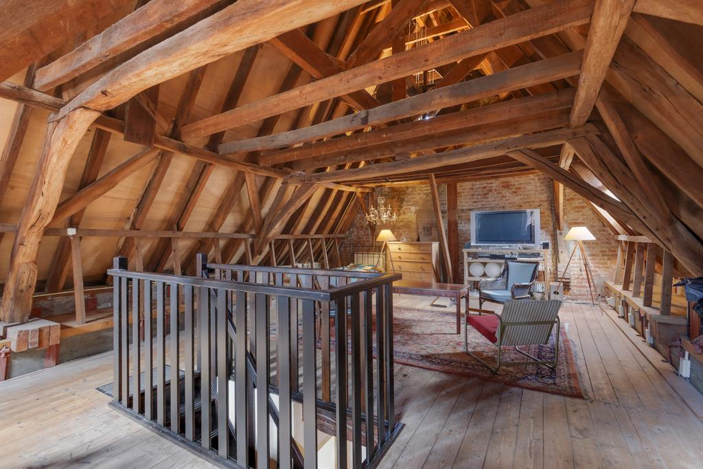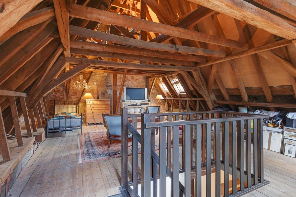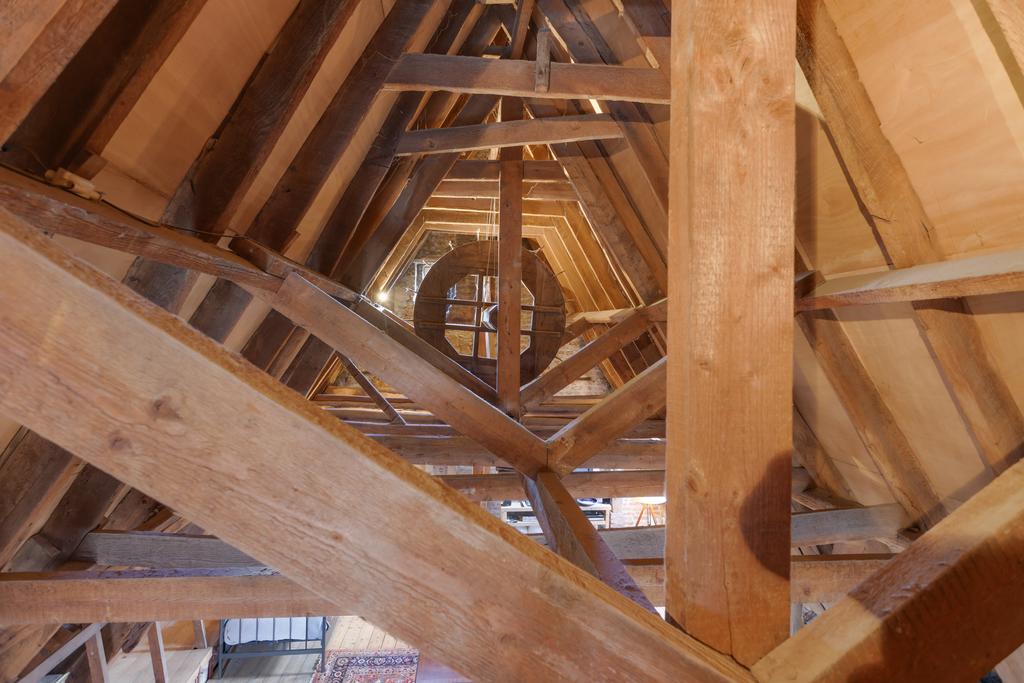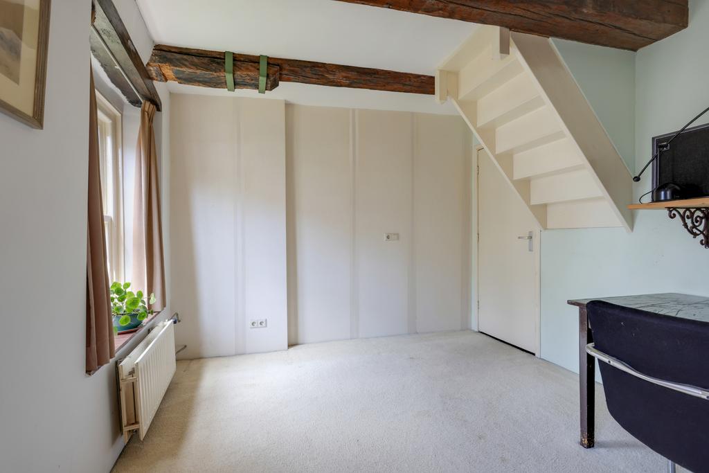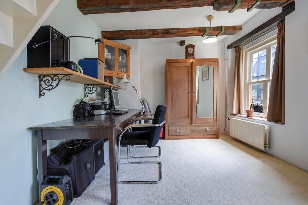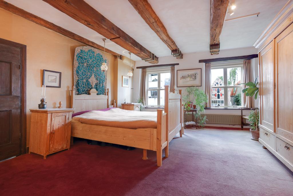 2e verdieping: via een vaste trap komt u op de riante zolder (over de hele breedte van het huis), met twee ramen aan de poortkant en twee kleinere Velux ramen aan de achterzijde. Ook is er een zogenaamd uilenluik. De zolder is voorzien van vier CV-radiatoren zodat er ruimte genoeg is voor eventuele naar wens bij te maken kamers. Op het midden van het dak (grachtzijde) is in het verre verleden een dakkapel met hijsbalk gesitueerd geweest, dit om de schepen te lossen. In overleg met de gemeente en Monumentenzorg zou e.e.a. met de nodige vergunning terug geplaatst kunnen worden voor nog meer lichtinval op zolder. Bijbehorend hijswiel hangt nu in de nok van het dak. Op de zolder bevindt zich de CV-installatie en luchtbehandelingssysteem. Via kleine trap is er in de nok van het dak nog meer bergruimte gerealiseerd.