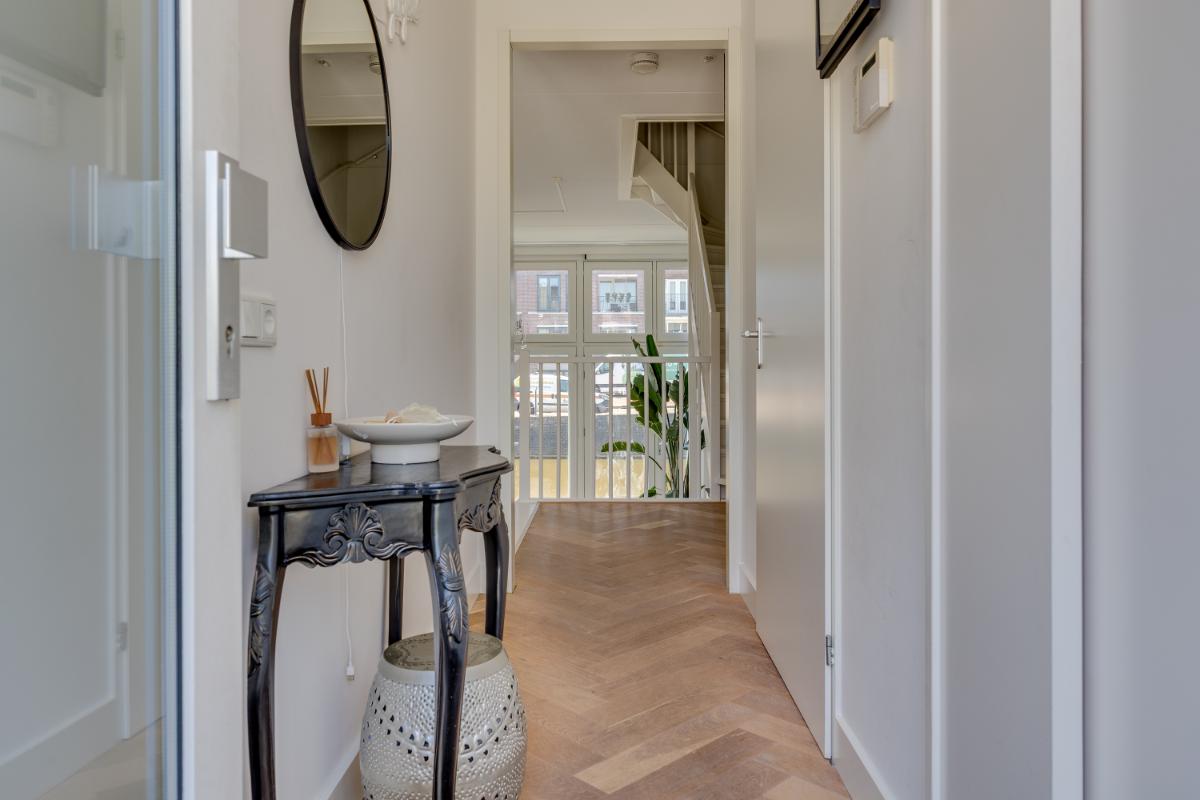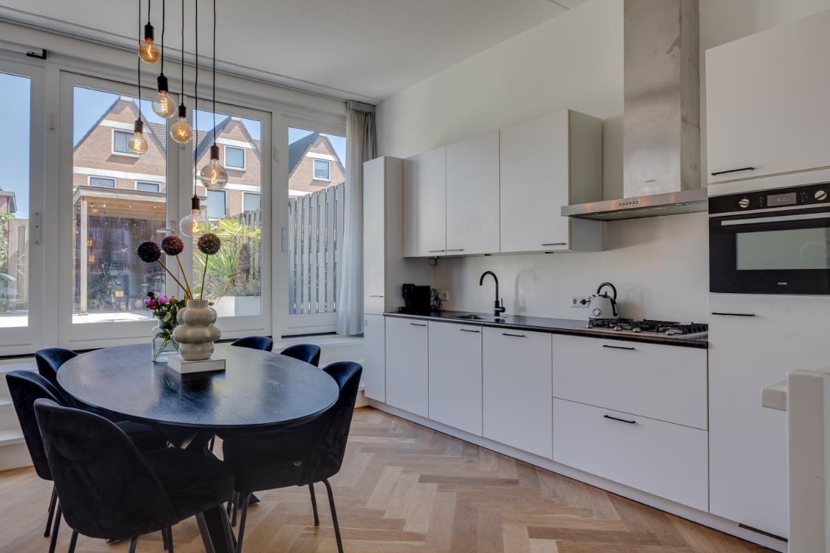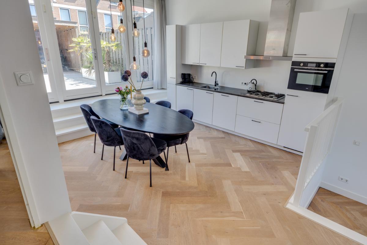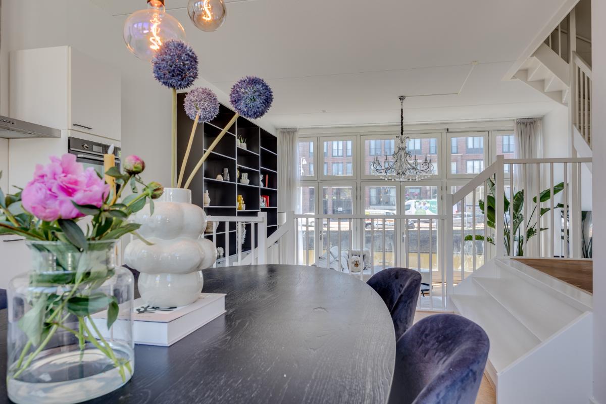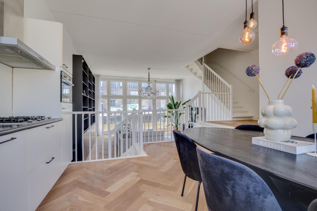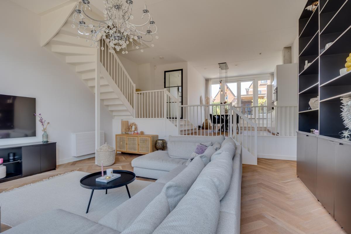Via de hal voorzien van ingebouwde garderobe en toilet betreedt u de keuken. De keuken is voorzien voor keukenwand met diverse inbouwapparatuur en meer dan voldoende ruimte voor een grote eettafel om samen te zijn. De woonkamer ligt splitlevel en aan de achterkant. Door het gebruik van een houten visgraatvloer, hoge plafonds en stijlvolle wandkast krijgt de woonkamer een luxe docht warme uitstraling. Vrijwel de gehele achterkant is voorzien van raampartij met HR++ glas wat zorgt voor veel licht. De openslaande deuren zorgen dat je de vlonder gemakkelijk betrekt bij de woning!