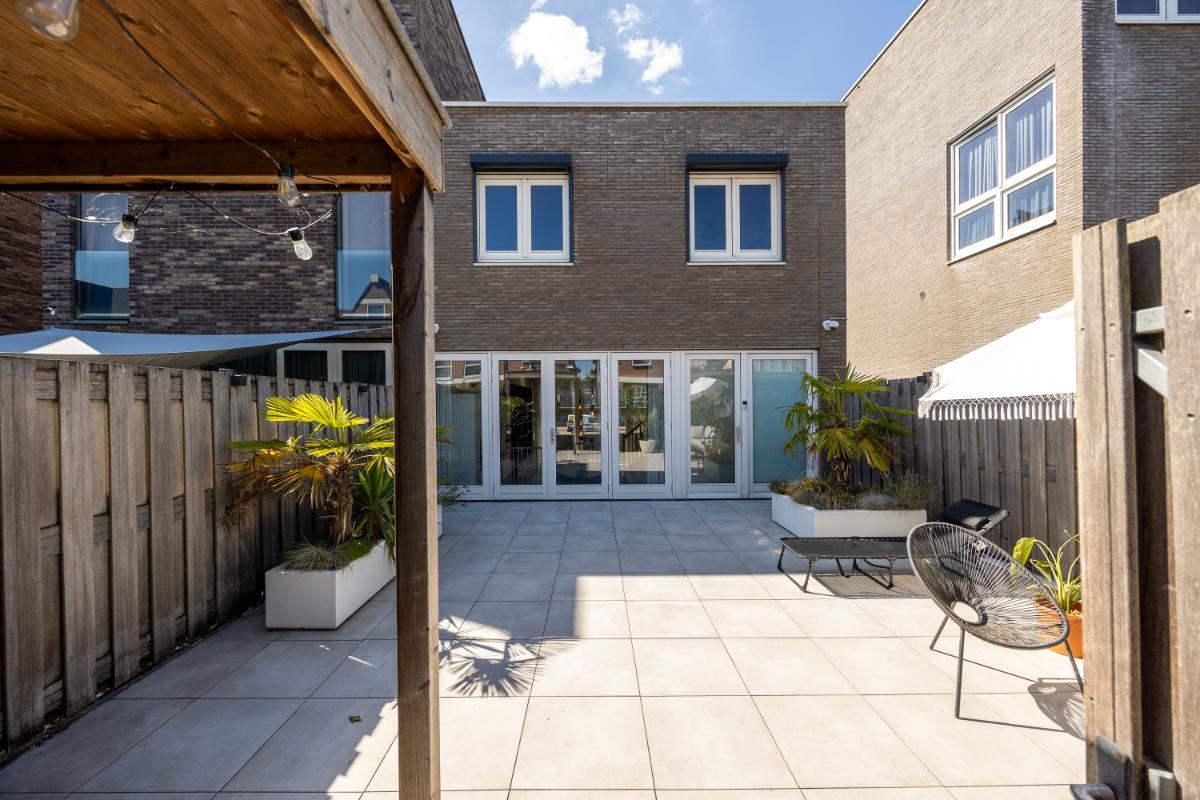 Terug op de begane grond komen we terecht in de zonnige tuin gelegen op het zuidoosten waar een groot deel van de dag zon te vinden is. De tuin is onderhoudsarm door het tegelwerk in combinatie met de groene plantenbakken.
