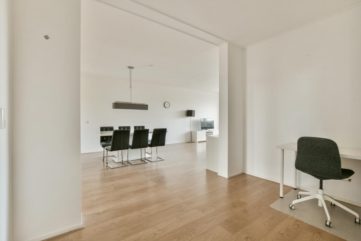 De woonkamer is heerlijk licht door de grote raampartij en er is ruimte voor een riante zithoek en een eettafel. Daarnaast is in een aparte hoek van de kamer nog ruimte om een werkplek of een extra zithoek te creëren.