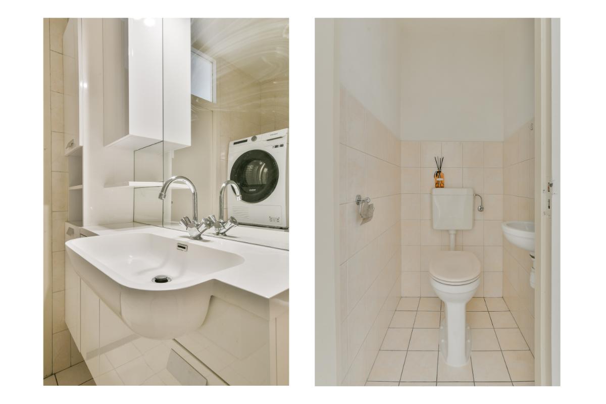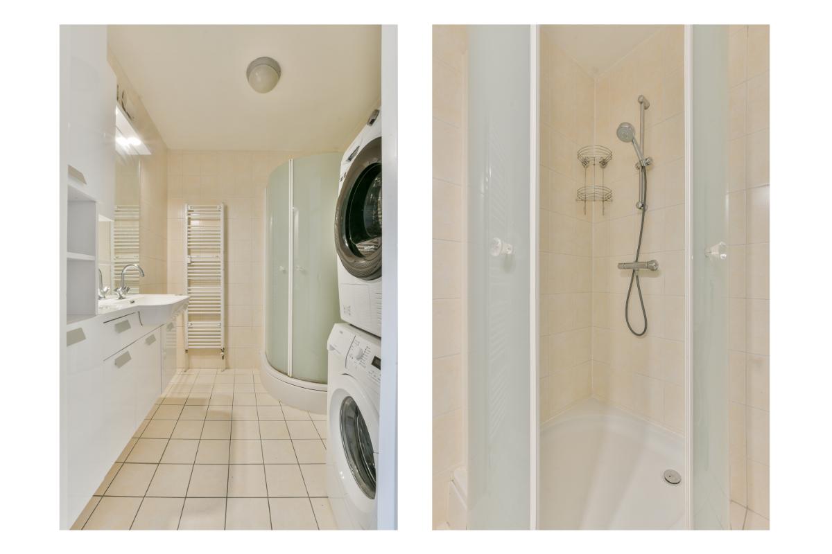 De royale badkamer is geheel betegeld en voorzien van een douchecabine, een wastafel met meubel en een designradiator. Ook is hier de aansluiting voor de wasmachine en droger aanwezig. Direct naast de badkamer ligt het separate toilet.
