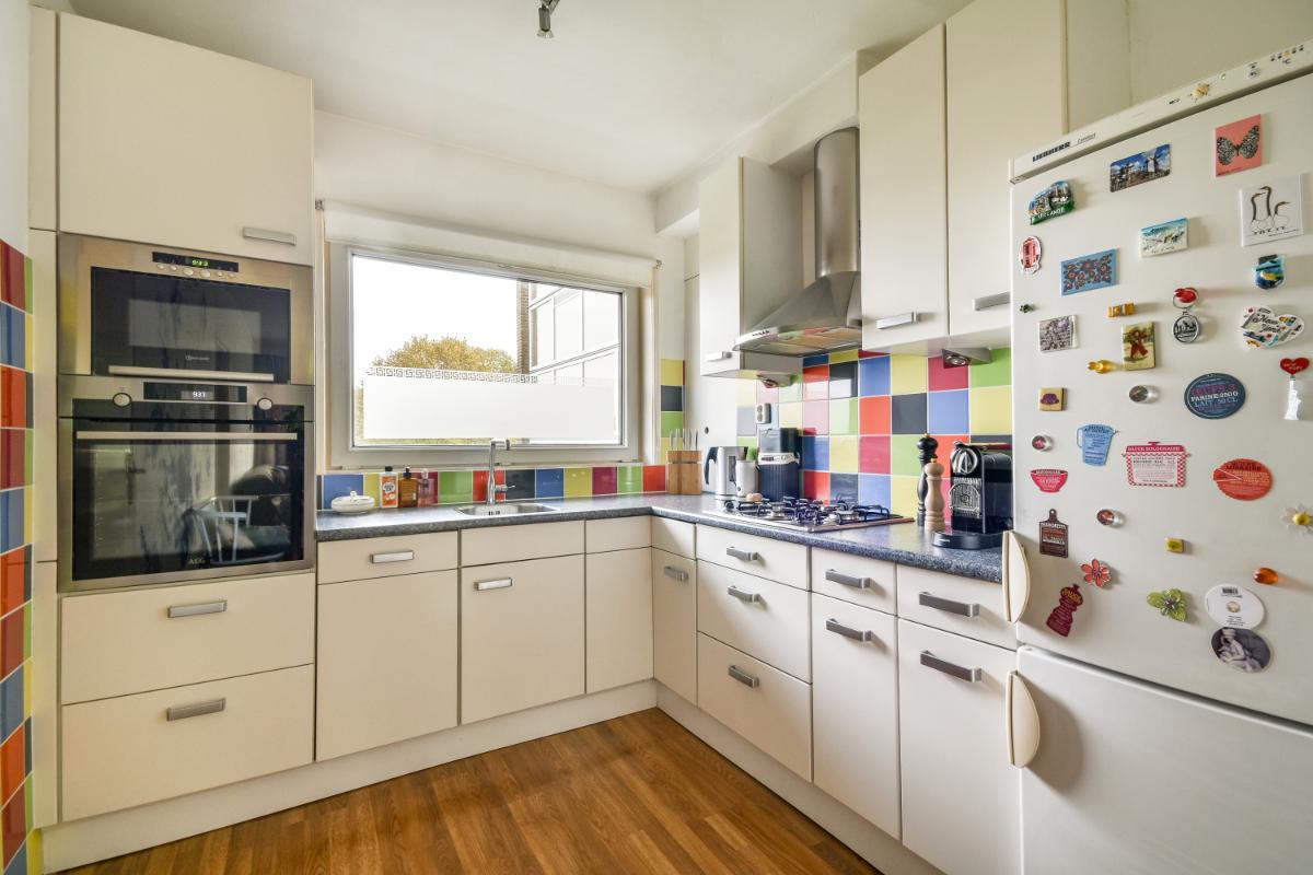De keuken is ruim van opzet en in een L-opstelling geplaatst. De keuken beschikt over veel opbergruimte in boven en onderkasten. Naast het keukenblok is er ruimte voor een losse koelkast. De inbouwapparatuur zoals een elektrische oven en de magnetron zijn mooi weggewerkt in hoge kasten. Verder zijn er nog een 4-pits gaskookplaat, een afzuigkap en een kleiner formaat vaatwasmachine. Boven het keukenblok is er een raam aanwezig dat uitzicht biedt op de groene omgeving. De keuken is afgewerkt met een kunststof werkblad en vrolijke tegels.