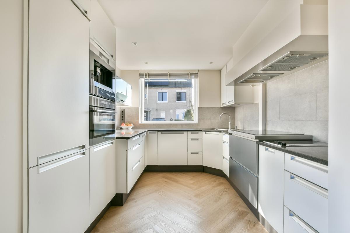 De fraaie open keuken is in een U-opstelling geplaatst en ingedeeld met een keukenblok met onderkasten, lades, veel werkblad, hoge-, en bovenkasten. De verschillende inbouwapparatuur bestaat uit: een brede inductiekookplaat, een ingebouwde friteuse, een breed afzuigsysteem, een combi-oven op ooghoogte, een koffiemachine, een vaatwasmachine, een koel-/vriescombinatie en een quooker. Boven het werkblad is er een raam aanwezig en in het plafond vindt u inbouwspots. Al met al een zeer complete keuken voor een echte kookliefhebber.