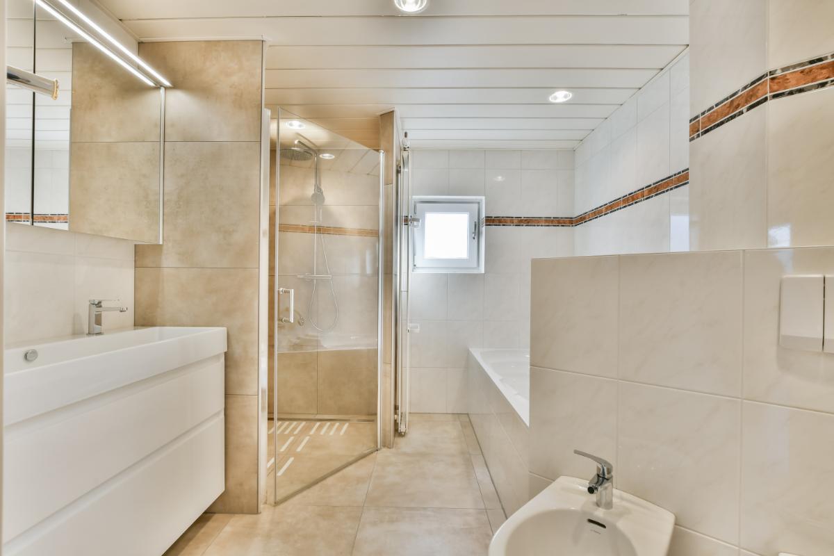 The first floor is accessible via a fixed staircase, clad in leather/laminate, with stair lighting. This floor has three bedrooms and a spacious bathroom. The width of the house also gives the upper floors a spacious feel. The two bedrooms at the rear feature Velux skylights. The bedroom at the front has wardrobes with sliding doors. The entire floor, with the exception of the bathroom, is fitted with laminate flooring. The spacious bathroom features modern tiling up to the ceiling and is equipped with a designer radiator, a bathtub, a walk-in shower, a wall-mounted toilet, a bidet, a double washbasin with vanity unit, and a window providing daylight and natural ventilation.
