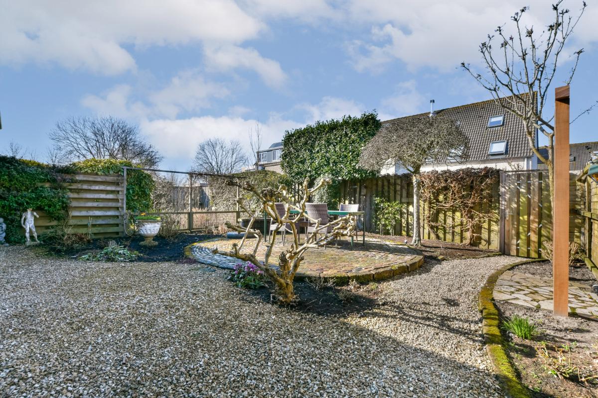 The backyard faces west and features a sun terrace, gravel areas, and perennial planting. The corner location and the planting create a great deal of privacy in the garden. As a result, the property also features a side garden. A storage shed is located here, accessible from two sides. The garden also has a back entrance.