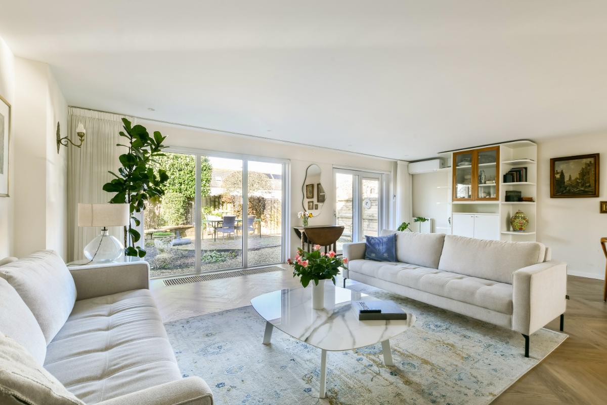 Due to the width of the house (7.50 meters), the seating area is wonderfully spacious. There is a custom-made cinema wall where the television and the electric fireplace are located. The large windows and the sliding doors make the living room wonderfully bright. The garden is accessible via the sliding doors. For sunny days, there is an electric awning spanning the entire width of the house.