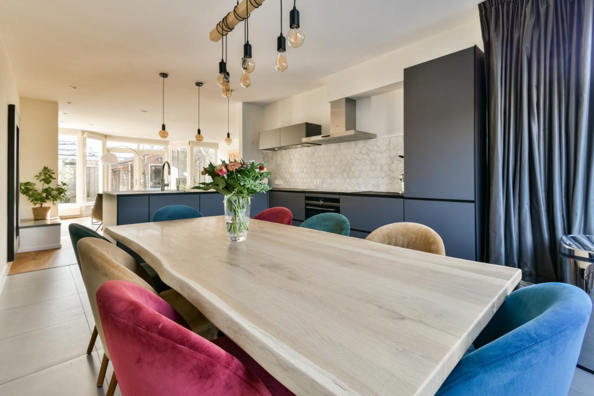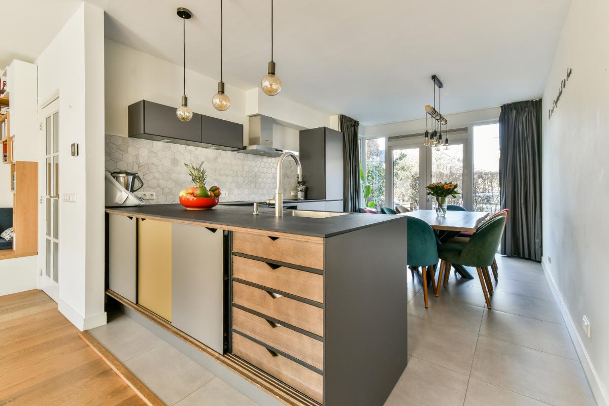 De moderne, open L-vormige keuken met tegelvloer en vloerverwarming is ruimte genoeg voor een grote eettafel. De keuken/eetkamer is uitgerust met een keukenblok met onderkasten, een spoelbak met een Quooker-kraan en Siemens-apparatuur, een inductiekookplaat, koelkast/vriezer, elektrische oven, vaatwasser en een afzuigkap. De keuken bevindt zich aan de voorzijde van het huis en heeft openslaande deuren naar de voortuin, perfect om bij mooi weer te ontbijten op het terras of 's avonds met het hele gezin te dineren.