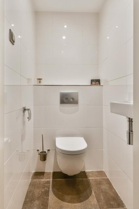 The separate toilet and bathroom are designed in the same style. The spacious bathroom features a large walk-in shower with a rain shower panel, a modern designer radiator/towel radiator, and a washbasin with a mirror. Modern spotlights are integrated into the ceiling. All in all, a wonderfully spacious apartment in a prime location, ready to move into.