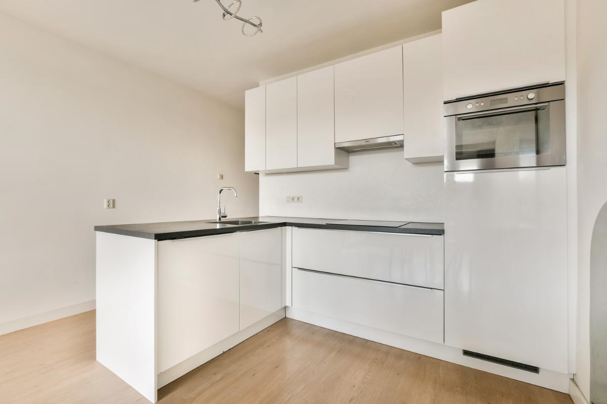 De moderne keuken is in een hoekopstelling geplaatst en beschikt over bovenkasten, onderkasten/lades, een inductie kookplaat, een afzuigkap, een koelkast, een vrieskast, een vaatwasmachine en een op ooghoogte geplaatste combi-oven.