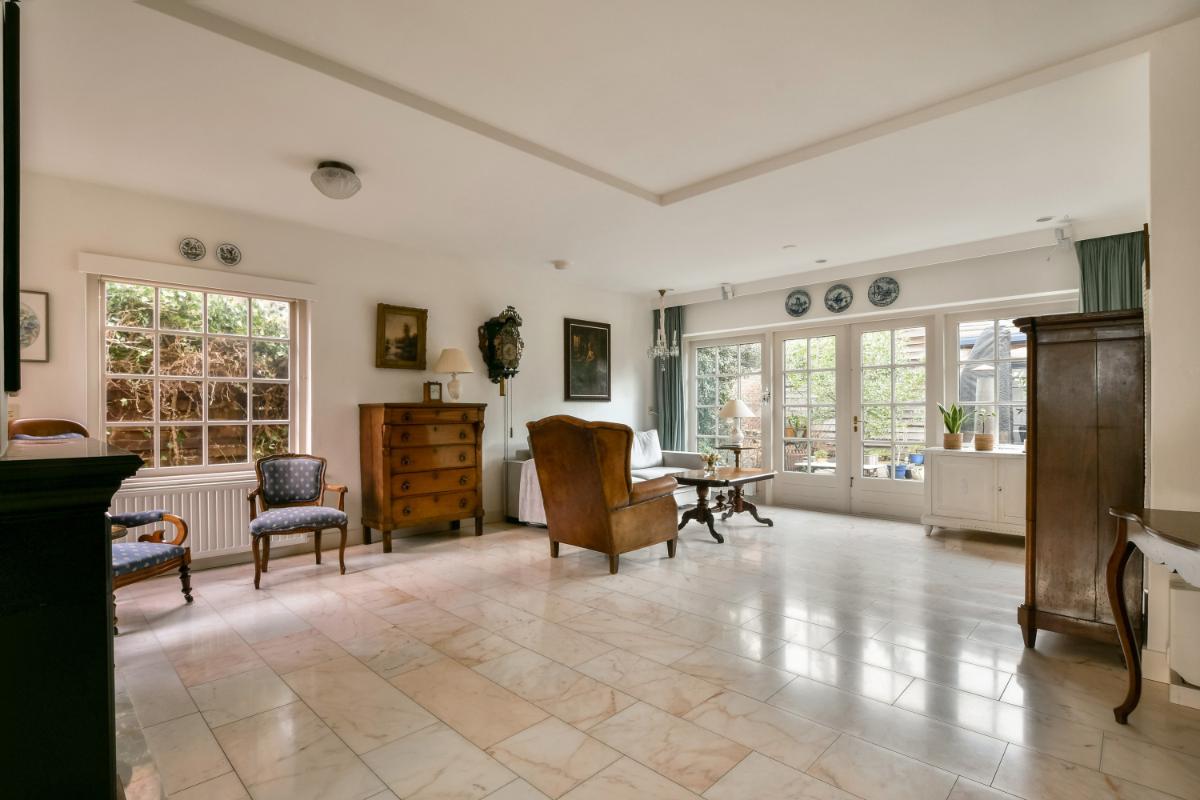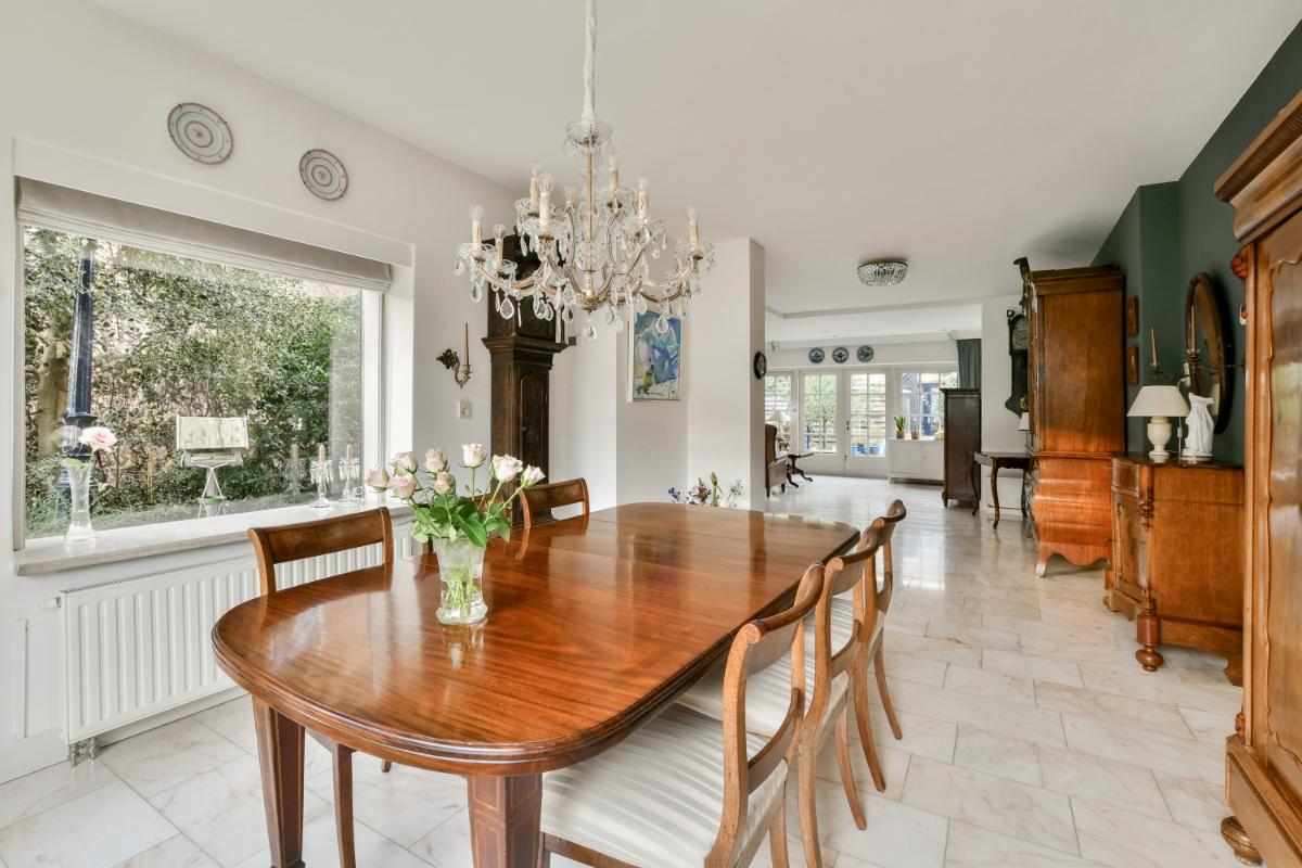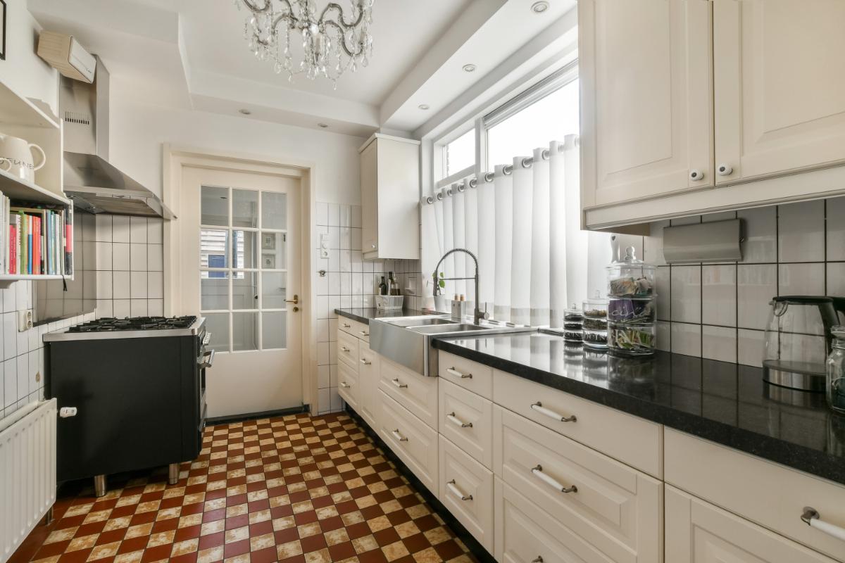 Indeling: Via de groene voortuin is de woning bereikbaar. Vanuit de entree van de woning is de ruime hal met sfeervolle originele tegels en een statige trap toegankelijk. Hier bevinden zich ook een trapkast en een modern zwevend toilet. De hal geeft toegang tot de woonkamer en de keuken. De uitgebouwde woonkamer is royaal van afmeting en biedt aan de voorzijde een eetkamer met erker en aan de achterzijde een riante zithoek voorzien van een open haard en openslaande deuren naar de achtertuin. De gehele woonkamer is afgewerkt met een fraaie marmervloer met vloerverwarming. De separate keuken is in een landelijke stijl uitgevoerd. Het keukenblok heeft een zwart composiet werkblad, een dubbele spoelbak van roestvrijstaal en veel kastruimte. Aan de andere zijde staat een groot Boretti-fornuis met oven en een afzuigkap. In het verlengde van de keuken is de bijkeuken aanwezig met een Amerikaans koelkast en aansluitingen voor een vaatwasser, wasmachine en wasdroger. Hier bevindt zich tevens de c.v.-installatie. Vanuit de bijkeuken is de achtertuin te betreden.