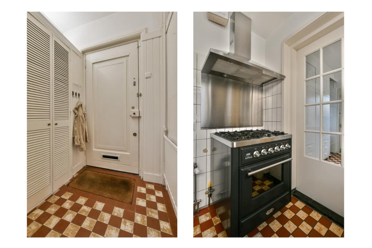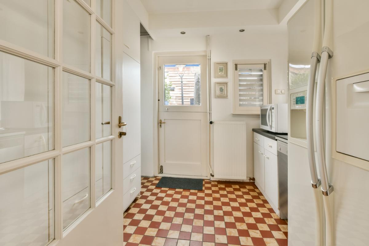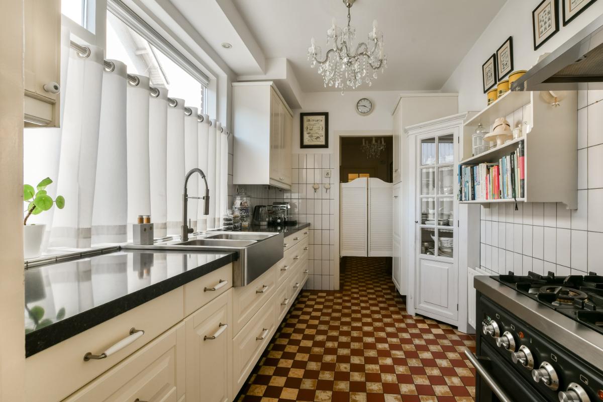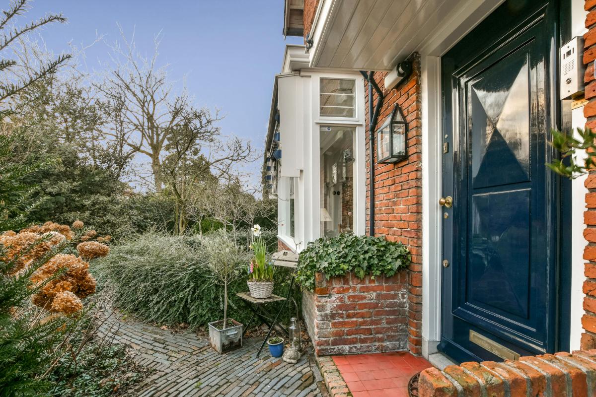 Indeling: Via de groene voortuin is de woning bereikbaar. Vanuit de entree van de woning is de ruime hal met sfeervolle originele tegels en een statige trap toegankelijk. Hier bevinden zich ook een trapkast en een modern zwevend toilet. De hal geeft toegang tot de woonkamer en de keuken. De uitgebouwde woonkamer is royaal van afmeting en biedt aan de voorzijde een eetkamer met erker en aan de achterzijde een riante zithoek voorzien van een open haard en openslaande deuren naar de achtertuin. De gehele woonkamer is afgewerkt met een fraaie marmervloer met vloerverwarming. De separate keuken is in een landelijke stijl uitgevoerd. Het keukenblok heeft een zwart composiet werkblad, een dubbele spoelbak van roestvrijstaal en veel kastruimte. Aan de andere zijde staat een groot Boretti-fornuis met oven en een afzuigkap. In het verlengde van de keuken is de bijkeuken aanwezig met een Amerikaans koelkast en aansluitingen voor een vaatwasser, wasmachine en wasdroger. Hier bevindt zich tevens de c.v.-installatie. Vanuit de bijkeuken is de achtertuin te betreden.