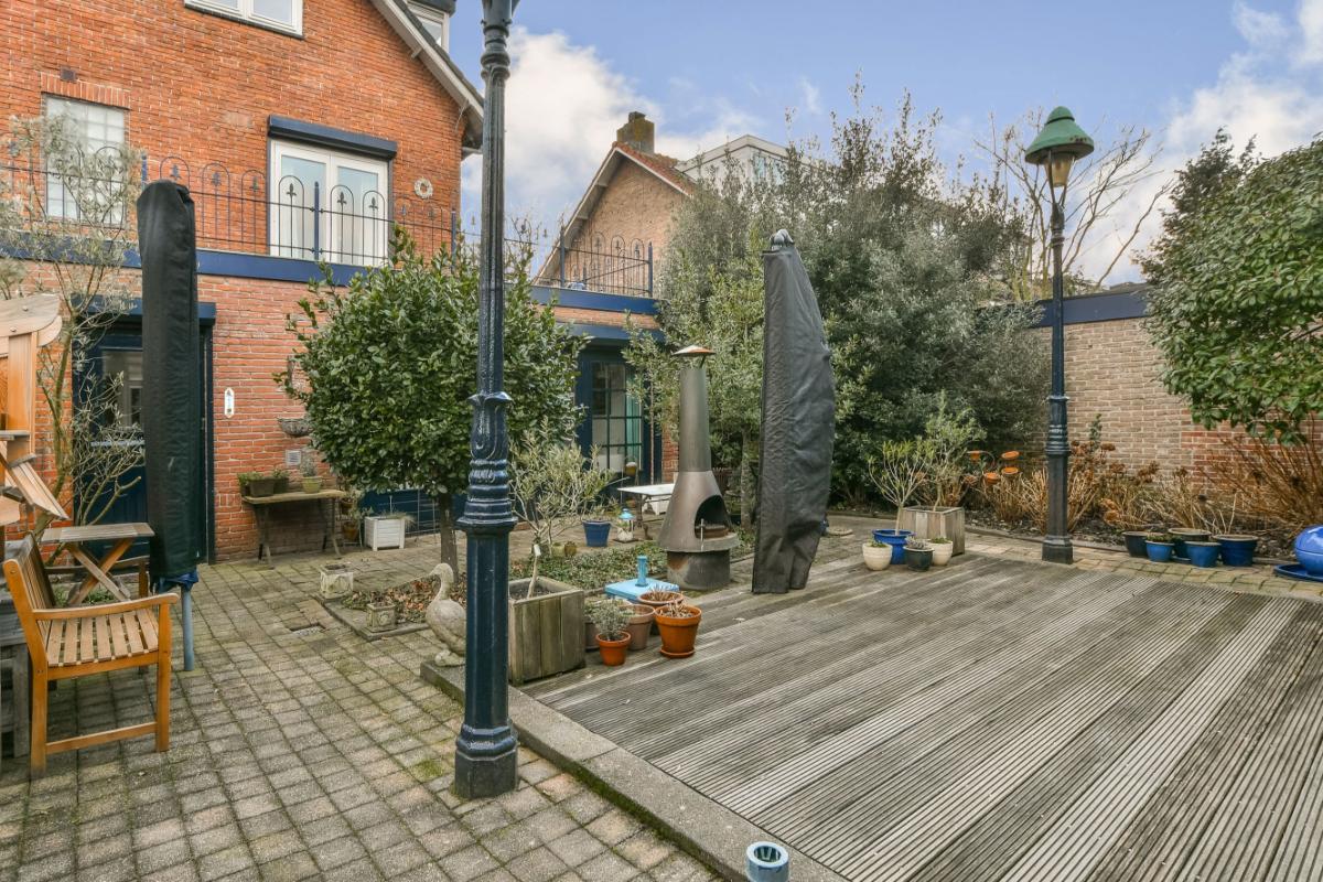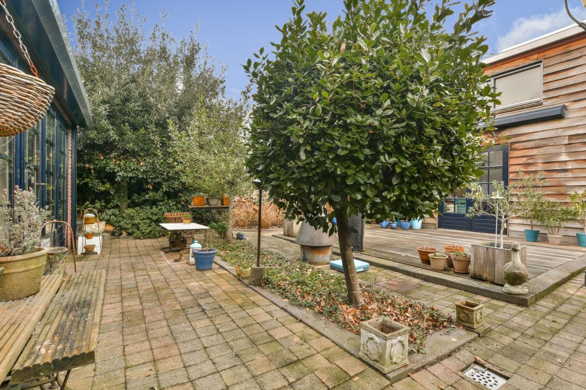 De woning heeft een voortuin op het zuiden, een zijtuin op het westen en een achtertuin op noorden, dus altijd ergens een plekje in de zon. De achtertuin is bestraat en in het midden bevindt zich een houten terras. De tuin biedt veel privacy en is ook via een poort vanaf het naastgelegen pad bereikbaar. De gevel van het achtergelegen pand is afgewerkt met een redceder houten wand.