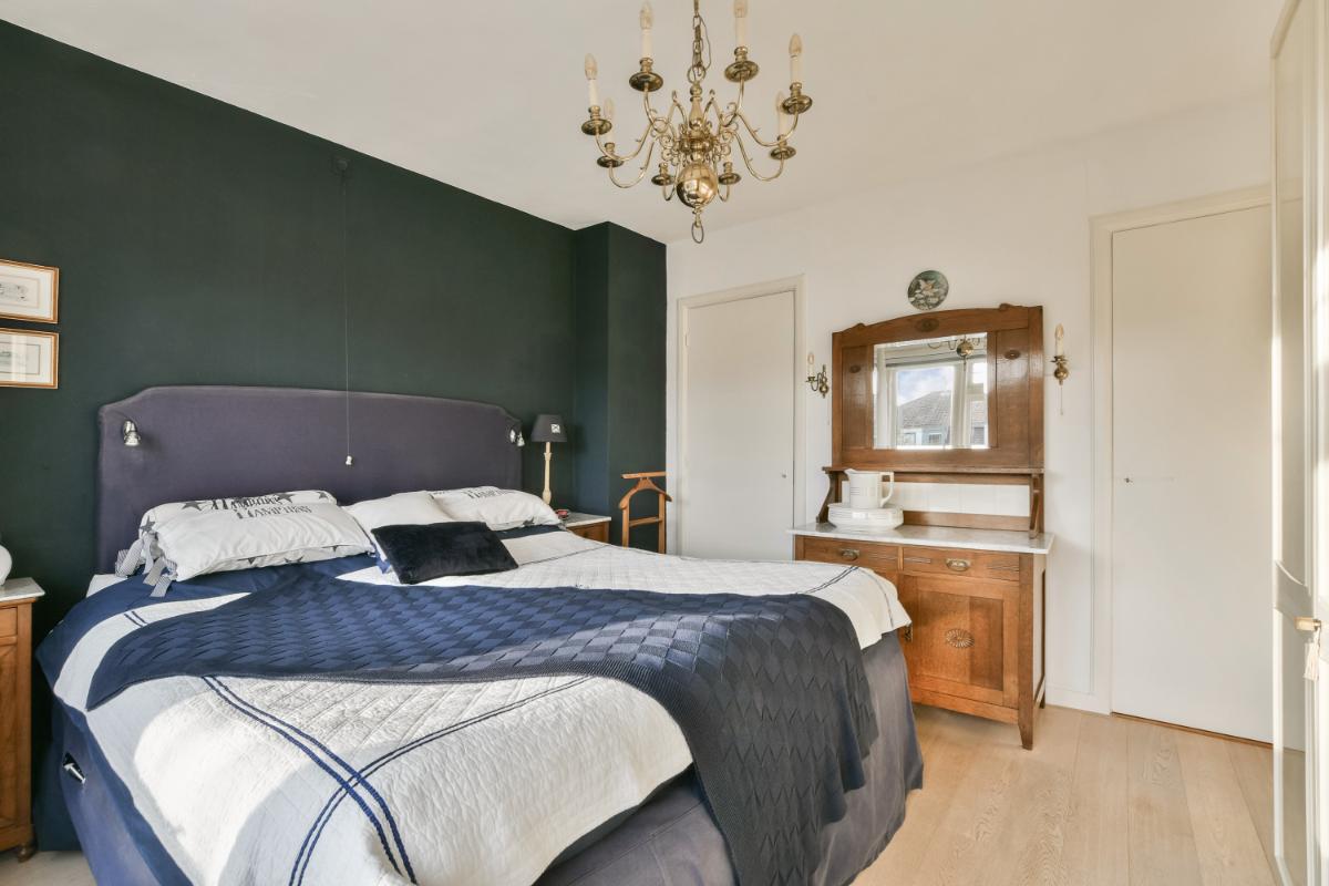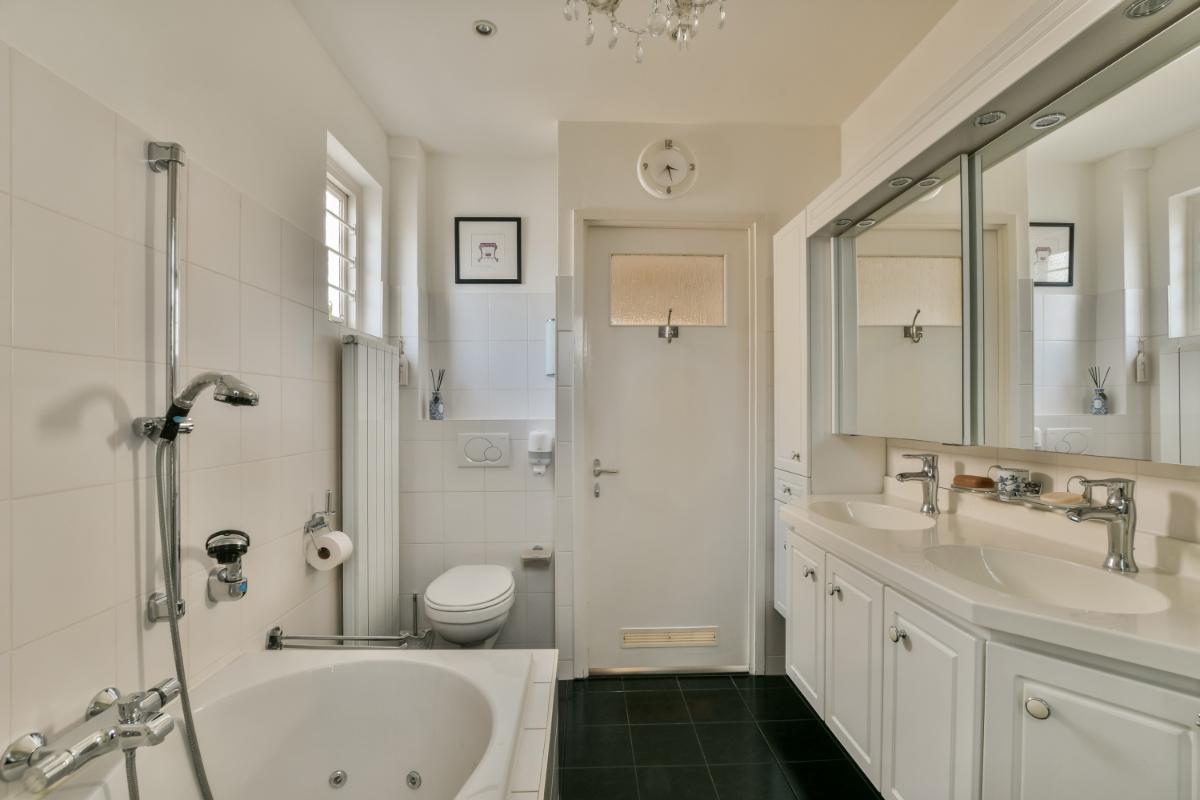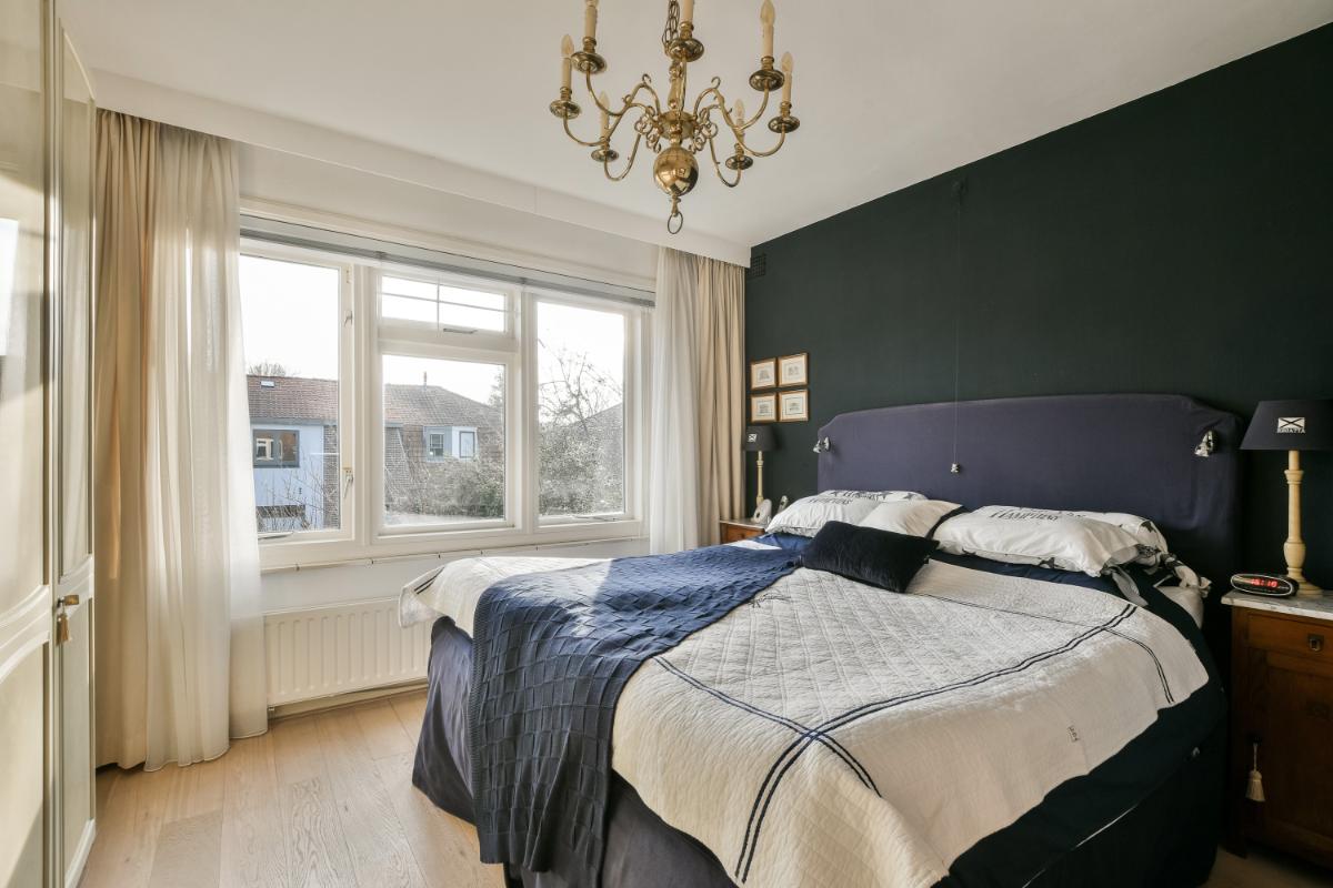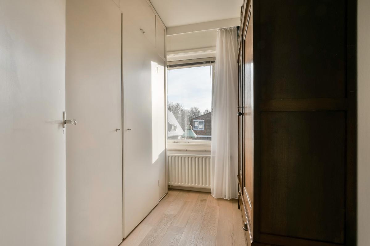 Op de eerste verdieping van de woning biedt de overloop toegang tot twee royaal bemeten slaapkamers, de badkamer en een derde slaapkamer die op dit moment als kastenkamer in gebruik is. Deze kamer en de hoofdslaapkamer liggen aan de voorzijde van de woning. De tweede slaapkamer en de badkamer liggen aan de achterzijde van de woning. De slaapkamer aan de achterzijde geeft toegang tot het riant dakterras van circa 30 m². De slaapkamers zijn voorzien van een sfeervolle houtenvloer in een lichte kleurstelling. De ruime badkamer biedt een ligbad (whirlpool), een stoom/ douchecabine, een designradiator en een groot badkamermeubel met twee wastafels en een grote spiegel. Een raam zorgt voor daglicht.