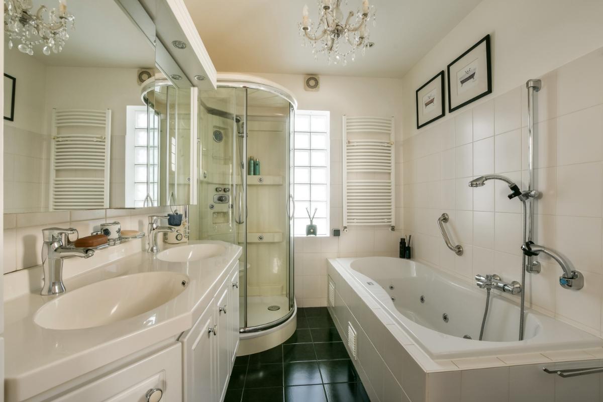 On the first floor of the house, the landing provides access to two generously sized bedrooms, the bathroom, and a third bedroom currently used as a walk-in closet. This room and the master bedroom are situated on the front of the house. The second bedroom and the bathroom are located at the rear of the house. The rear bedroom provides access to the spacious roof terrace of approximately 30 m². The bedrooms feature attractive wooden flooring in a light color scheme. The spacious bathroom offers a bathtub (whirlpool), a steam/shower cabin, a designer radiator, and a large vanity unit with two sinks and a large mirror. A window provides natural light.